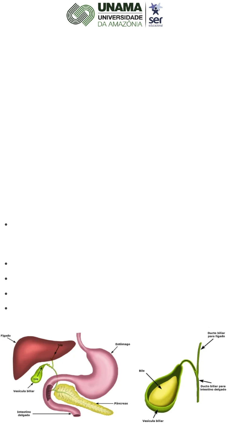 A bile, bílis ou suco biliar é um �uído líquido produzido pelo fígado e atua como auxiliar na digestão dos alimentos. Com consistência líquida e viscosa, possui sabor amargo e coloração amarelo-esverdeada. Atuando no sistema digestório, a bile tem como função contribuir com a absorção dos nutrientes e com a digestão de gorduras ingeridas na alimentação. As principais ações realizadas pela bile são: Auxílio no processo de absorção de gorduras e vitaminas lipossolúveis no intestino delgado a partir da ação dos ácidos biliares; Facilita a ação das enzimas produzidas pelo pâncreas; Eliminação de resíduos pelas fezes, incluindo a bilirrubina; Desintoxicação do fígado; Regulação das bactérias do fígado. UNIVERSIDADE DA AMAZÔNIA Bile https://www.todamateria.com.br/login/?f=3969 Produção e composição da bile A bile é produzida no fígado pelos hepatócitos, que são células existentes no parênquima hepático. A produção da bile pode ser de até 1 litro por dia e é diluída no organismo para desenvolver as ações de auxílio na digestão e absorção de nutrientes. Ao entrar na vesícula biliar �ca armazenada, podendo ser acumulada entre 20 e 50 ml do �uído. A bile apresenta a seguinte composição: 85% de água 10% de bicarbonato de sódio 3% de pigmentos 1% de gordura 0,7% de sais inorgânicos 0,3% de colesterol Excreção da bile Excreção biliar A bile passa por um processo de excreção no organismo, sendo realizada de acordo com as seguintes etapas: Secreção por meio dos hepatócitos: o suco biliar produzido no fígado é secretado nos canalículos biliares, que estão localizados entre os hepatócitos e as lâminas hepáticas. Passagem pelos ductos biliares: nesta etapa, a bile passa para os ductos biliares terminais até chegar nos ductos hepáticos direito e esquerdo, que ao �nal formam o ducto hepático comum. Chegada na vesícula biliar: a etapa �nal consiste na passagem pelo ducto hepático até o ducto colédoco e, por �m chegando à vesícula biliar. Icterícia Caso a excreção da bile não seja realizada corretamente pode causar alguns problemas à saúde. O mais comum é quando a vesícula apresenta algum tipo de obstrução que impeça a excreção do �uído, fazendo com que �que acumulado no fígado. Este tipo de problema causa efeitos no organismo e é chamado de icterícia. Esta condição traz as seguintes consequências: alteração na coloração da pele, na consistência e coloração das fezes e no funcionamento do metabolismo. https://www.todamateria.com.br/ https://www.todamateria.com.br/login/