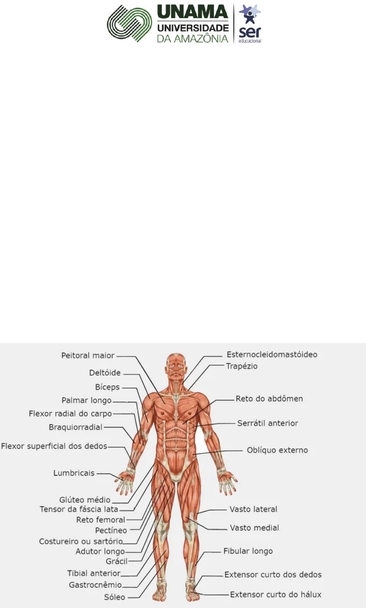 O sistema muscular é composto pelos diversos músculos do corpo humano. Os músculos são tecidos, cujas células ou �bras musculares possuem a função de permitir a contração e produção de movimentos. As �bras musculares, por sua vez, são controladas pelo sistema nervoso, que se encarregam de receber a informação e respondê-la realizando a ação solicitada. Principais músculos que compõem o sistema muscular Funções do Sistema Muscular O Sistema Muscular apresenta algumas funções que são fundamentais para o corpo humano. Veja a seguir quais são essas funções: UNIVERSIDADE DA AMAZÔNIA Sistema Muscular https://www.todamateria.com.br/login/?f=572 Estabilidade corporal; Produção de movimentos; Aquecimento do corpo (manutenção da temperatura corporal); Preenchimento do corpo (sustentação); Auxílio nos �uxos sanguíneos. Grupos Musculares O corpo humano é formado por aproximadamente 600 músculos, que trabalham em conjunto com ossos, articulações e tendões para permitir que façamos diversos movimentos. Eles são agrupados da seguinte forma: músculos da cabeça e do pescoço, músculos do tórax e abdômen, músculos dos membros superiores e músculos dos membros inferiores. Conheça sobre cada um desses grupos a seguir. Músculos da Cabeça e do Pescoço Músculos da cabeça e o pescoço O grupo muscular da cabeça e do pescoço é composto por mais de 30 pequenos músculos que ajudam a exprimir os sentimentos, mover os maxilares ou manter a cabeça erguida. Veja no quadro abaixo como alguns dos principais músculos deste grupo atuam: Músculo Ação Frontal Mastigar ou morder. Masseter Movimentam as mandíbulas. Esternocleidomastoideo Permite a cabeça girar ou se inclinar para frente e para trás. Conheça também: Sistema Nervoso Sistemas do Corpo Humano Músculos do Tórax e do Abdômen Principais músculos das costas e tórax Os músculos do grupo do tórax e abdômen permitem a respiração, impedem o corpo de se curvar e ceder ao próprio peso, entre outros movimentos. No quadro abaixo estão alguns dos músculos deste grupo e como eles atuam no nosso corpo: Músculo Ação Peitoral e Deltoide Levantar peso. https://www.todamateria.com.br/sistema-nervoso/ https://www.todamateria.com.br/sistemas-do-corpo-humano/ Músculo Ação Intercostais Atuam em conjunto com o diafragma para levarem o ar até os pulmões. Oblíquo Inclina o tórax para a frente. Para saber mais: Sistema Respiratório Tecidos do corpo humano Músculos dos Membros Superiores Principais músculos do antebraço Os músculos dos membros superiores são capazes de fazer a pressão exata e permitem �exibilidade e precisão para tarefas delicadas ou que exigem muita força. Alguns exemplos desses músculos e suas respectivas ações estão descritas do quadro abaixo: Músculo Ação Bíceps Está ligado aos ossos omoplata e rádio, ao se contrair faz o braço se dobrar. Oponente do polegar Permite o movimento do polegar, pois utiliza músculos do antebraço e da mão Curto adutor Movimento para fora do polegar. https://www.todamateria.com.br/sistema-respiratorio/ https://www.todamateria.com.br/tecidos-do-corpo-humano/ Músculos dos Membros Inferiores Principais músculos do membro inferior Os músculos dos membros inferiores são os mais fortes do corpo. Graças aos músculos das pernas, podemos �car de pé e manter o equilíbrio. Veja no quadro abaixo alguns músculos deste grupo: Músculo Ação Costureiro (ou sartório) É o mais longo músculo do corpo, ao se contrair dobra a perna e gira o quadril. Trata-se do músculo das costureiras, por isso o nome. Flexores dorsais Fazem os dedos do pé levantarem. Tendão de Aquiles É o tendão mais forte do corpo, inserido no osso calcâneo. Sóleo, plantar delgado e gastrocnêmio São músculos �exores plantares responsáveis pelo movimento das bailarinas de �car na ponta dos pés. Tipos de Músculos Os músculos apresentam diferentes tamanhos, formas e funções, por isso, são classi�cados em três tipos: liso, estriado cardíaco e estriado esquelético. Conheça mais detalhes sobre cada um deles a seguir. Músculo Liso ou Não estriado O músculo liso está presente em diversos órgãos do corpo humano Os músculos liso são aqueles que possuem contração involuntária. Eles estão localizados nas estruturas ocas do corpo, ou seja, estômago, bexiga, útero, intestino, além da pele e dos vasos sanguíneos. Sua função assegura a movimentação dos órgãos internos. Você também pode se interessar por: Músculo Estriado Cardíaco O músculo cardíaco está presente no coração São músculos de contração involuntária e estão presentes no coração (miocárdio). Esses músculos asseguram os vigorosos batimentos cardíacos. Leia também: Os músculos estriados são contraídos de forma voluntária São músculos de contração voluntária, ou seja, os movimentos são controlados pela vontade do ser humano. https://www.todamateria.com.br/ https://www.todamateria.com.br/login/ Eles estão conectados com os ossos e cartilagens e, através das contrações, permitem os movimentos, as posições corporais, além de estabilizarem as articulações do organismo. Assista este vídeo com o resumo da matéria Leia também sobre: