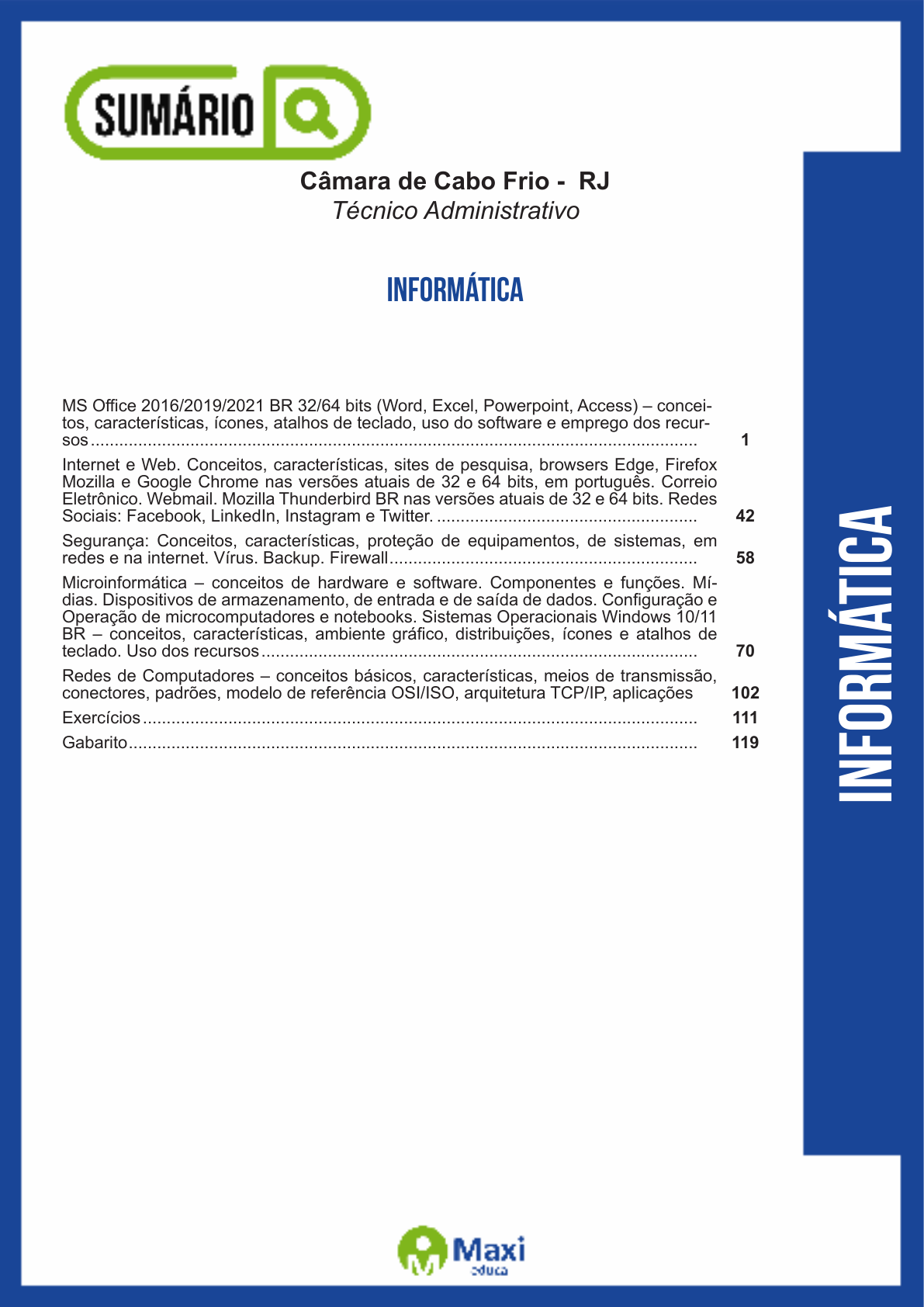 In fo rm át ic a Câmara de Cabo Frio - RJ Técnico Administrativo Informática MS Office 2016/2019/2021 BR 32/64 bits (Word, Excel, Powerpoint, Access) – concei- tos, características, ícones, atalhos de teclado, uso do software e emprego dos recur- sos ................................................................................................................................ 1 Internet e Web. Conceitos, características, sites de pesquisa, browsers Edge, Firefox Mozilla e Google Chrome nas versões atuais de 32 e 64 bits, em português. Correio Eletrônico. Webmail. Mozilla Thunderbird BR nas versões atuais de 32 e 64 bits. Redes Sociais: Facebook, LinkedIn, Instagram e Twitter. ....................................................... 42 Segurança: Conceitos, características, proteção de equipamentos, de sistemas, em redes e na internet. Vírus. Backup. Firewall ................................................................. 58 Microinformática – conceitos de hardware e software. Componentes e funções. Mí- dias. Dispositivos de armazenamento, de entrada e de saída de dados. Configuração e Operação de microcomputadores e notebooks. Sistemas Operacionais Windows 10/11 BR – conceitos, características, ambiente gráfico, distribuições, ícones e atalhos de teclado. Uso dos recursos ............................................................................................ 70 Redes de Computadores – conceitos básicos, características, meios de transmissão, conectores, padrões, modelo de referência OSI/ISO, arquitetura TCP/IP, aplicações 102 Exercícios ..................................................................................................................... 111 Gabarito ........................................................................................................................ 119 1823529 E-book gerado especialmente para RAPHAEL WASHINGTON BORGES MATTOS 1 MS Office 2016/2019/2021 BR 32/64 bits (Word, Excel, Powerpoint, Access) – concei- tos, características, ícones, atalhos de teclado, uso do software e emprego dos recur- sos PACOTE OFFICE 2016 WORD 2016 Essa versão de edição de textos vem com novas ferramentas e novos recursos para que o usuário crie, edite e compartilhe documentos de maneira fácil e prática1. O Word 2016 está com um visual moderno, mas ao mesmo tempo simples e prático, possui muitas melho- rias, modelos de documentos e estilos de formatações predefinidos para agilizar e dar um toque de requinte aos trabalhos desenvolvidos. Trouxe pouquíssimas novidades, seguiu as tendências atuais da computação, permitindo o compartilhamento de documentos e possuindo integração direta com vários outros serviços da web, como Facebook, Flickr, Youtube, Onedrive, Twitter, entre outros. Novidades no Word 2016 – Diga-me o que você deseja fazer: facilita a localização e a realização das tarefas de forma intuitiva, essa nova versão possui a caixa Diga-me o que deseja fazer, onde é possível digitar um termo ou palavra correspon- dente a ferramenta ou configurações que procurar. – Trabalhando em grupo, em tempo real: permite que vários usuários trabalhem no mesmo documento de forma simultânea. 1 http://www.popescolas.com.br/eb/info/word.pdf 1823529 E-book gerado especialmente para RAPHAEL WASHINGTON BORGES MATTOS 2 Ao armazenar um documento on-line no OneDrive ou no SharePoint e compartilhá-lo com colegas que usam o Word 2016 ou Word On-line, vocês podem ver as alterações uns dos outros no documento durante a edição. Após salvar o documento on-line, clique em Compartilhar para gerar um link ou enviar um convite por e-mail. Quando seus colegas abrem o documento e concordam em compartilhar automaticamente as altera- ções, você vê o trabalho em tempo real. – Pesquisa inteligente: integra o Bing, serviço de buscas da Microsoft, ao Word 2016. Ao clicar com o bo- tão do mouse sobre qualquer palavra do texto e no menu exibido, clique sobre a função Pesquisa Inteligente, um painel é exibido ao lado esquerdo da tela do programa e lista todas as entradas na internet relacionadas com a palavra digitada. – Equações à tinta: se utilizar um dispositivo com tela sensível ao toque é possível desenhar equações matemáticas, utilizando o dedo ou uma caneta de toque, e o programa será capaz de reconhecer e incluir a fórmula ou equação ao documento. – Histórico de versões melhorado: vá até Arquivo > Histórico para conferir uma lista completa de altera- ções feitas a um documento e para acessar versões anteriores. – Compartilhamento mais simples: clique em Compartilhar para compartilhar seu documento com outras pessoas no SharePoint, no OneDrive ou no OneDrive for Business ou para enviar um PDF ou uma cópia como um anexo de e-mail diretamente do Word. – Formatação de formas mais rápida: quando você insere formas da Galeria de Formas, é possível es- colher entre uma coleção de preenchimentos predefinidos e cores de tema para aplicar rapidamente o visual desejado. – Guia Layout: o nome da Guia Layout da Página na versão 2010/2013 do Microsoft Word mudou para apenas Layout2. 2 CARVALHO, D. e COSTA, Renato. Livro Eletrônico. 1823529 E-book gerado especialmente para RAPHAEL WASHINGTON BORGES MATTOS 3 Interface Gráfica Navegação gráfica Atalho de barra de status Faixas de opções e modo de exibição Guia de Início Rápido.3 3 https://www.udesc.br/arquivos/udesc/id_cpmenu/5297/Guia_de_Inicio_Rapido___ 1823529 E-book gerado especialmente para RAPHAEL WASHINGTON BORGES MATTOS 4 Ao clicar em Documento em branco surgirá a tela principal do Word 20164. Área de trabalho do Word 2016. Barra de Ferramentas de Acesso Rápido Permite adicionar atalhos, de funções comumente utilizadas no trabalho com documentos que podem ser personalizados de acordo com a necessidade do usuário. Faixa de Opções Faixa de Opções é o local onde estão os principais comandos do Wo