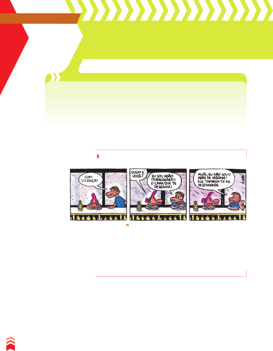 Capítulo A dimensão discursiva da linguagem Leia atentamente a tira abaixo para responder às questões de 1 a 3. Os elementos da comunicação Como você deve ter percebido, essa tira representa um insólito diálo- go entre Adão Iturrusgarai, o autor, e Aline, uma personagem criada por ele. Uma conversa como essa só pode acontecer no espaço da ficção, mas ajuda a compreender que a linguagem, além de ocorrer em diversos contextos comunicativos, permite representar diferentes situações de interlocução. O estudo dessas situações levou o linguista russo Roman Jakobson a criar um modelo explicativo para a comunicação verbal a que deu o nome de teoria da comunicação. Sua intenção era demonstrar que a comuni- cação humana se estrutura a partir de alguns elementos, atendendo a finalidades específicas. ALINE Adão Iturrusgarai 1. Que situação é representada nos quadrinhos? 2. A personagem masculina surpreende o leitor duas vezes. Por quê? 3. Muitos diálogos apresentados nas tiras poderiam perfeitamente ocorrer fora do universo da ficção. A conversa entre Aline e Adão também po- deria ocorrer em um contexto não ficcional? Justifique sua resposta. OBJETIVOS Ao final do estudo deste capítulo, você deverá ser capaz de: 1. Reconhecer os diferentes elementos em que se baseia a teoria da comunicação. 2. Identificar as diferentes funções da linguagem. 3. Explicar qual o papel da interlocução nos usos da linguagem. 4. Reconhecer marcas de autoria em textos de diferentes gêneros discursivos. 3 ITURRUSGARAI, Adão. Aline. Folha de S.Paulo. São Paulo, 17 nov. 2000. 42 U n id ad e 1 • L in gu ag em R ep ro du çã o pr oi bi da . A rt . 1 84 d o C ód ig o P en al e L ei 9 .6 10 d e 19 d e fe ve re iro d e 19 98 . I_plus_gramatica_cap03_D.indd 42 23/09/10 5:52:33 PM Hoje, os estudos da linguagem, embora reconheçam a importância da teo- ria da comunicação para dar início à análise das situações de interlocução, consideram essa teoria insuficiente para dar conta da complexidade envolvida no uso da linguagem pelos interlocutores. Conheceremos, a seguir, os princí- pios da teoria da comunicação. Na segunda parte deste capítulo, trataremos especificamente das suas limitações, apresentando uma perspectiva mais discursiva para tratar do uso que os interlocutores fazem da linguagem. A base da teoria da comunicação está na identificação de seis elementos, presentes, segundo Jakobson, em todas as situações de interlocução. São eles: • Os participantes de um ato comunicativo: emissor (também chamado de locutor ou de remetente) e receptor (locutário ou destinatário). • O canal em que se dá a comunicação. O canal é o meio físico por onde circula a mensagem entre o emissor e o receptor (ondas sonoras, papel, bytes, etc.). É também a conexão psicológica que se estabelece entre emissor e receptor para que possam se comunicar. • A mensagem a ser transmitida. A mensagem é o conjunto de enuncia- dos produzidos pela seleção e combinação de signos realizada por um determinado indivíduo. • O código em que a mensagem é transmitida. Trata-se do sistema que é utilizado pelos falantes. Assim, o código deve ser entendido como um conjunto de signos convencionais e das regras que determinam sua organização. • O contexto a que a mensagem se refere. O contexto é o conteúdo, o assunto da mensagem. Nessa perspectiva, toda mensagem tem um objetivo predominante, que pode ser a transmissão de informação, o estabelecimento puro e simples de uma relação comunicativa, a expressão de emoções, e assim por diante. contexto receptor canal emissor mensagem Esquema do processo de comunicação código As funções da linguagem Função referencial ou denotativa • (ênfase no contexto) Quando o objetivo da mensagem é a transmissão de informação sobre a realidade ou sobre um elemento a ser designado, diz-se que a função predominante no texto é a referencial ou denotativa. O trecho a seguir, com um conteúdo essencialmente informativo, exem- plifica essa função. Tome nota As funções da linguagem são o conjunto das finalidades comunicativas realizadas por meio dos enunciados da língua. Enunciado é tudo aquilo que é dito ou escrito por meio de palavras, delimita- das por marcas formais: na fala, pela entoação; na escrita, pela pontuação. Está sempre associado ao contexto em que é produzido. Conteúdo digital Moderna PLUS http://www.modernaplus.com.br Áudio: Galáxias. 43 C ap ít u lo 3 • A d im en sã o di sc ur si va d a lin gu ag em R ep ro du çã o pr oi bi da . A rt . 1 84 d o C ód ig o P en al e L ei 9 .6 10 d e 19 d e fe ve re iro d e 19 98 . I_plus_gramatica_cap03_D.indd 43 9/28/10 2:29:28 PM Semente do futuro Essa construção, que lembra uma pelota felpuda, na realidade tem 20 metros de altura e é inteirinha coberta por varas de acrílico, que balançam ao sabor do vento. O curioso é que em cada uma delas estão guardadas algumas sementinhas — e são mais de 60 mil, vindas de plantas variadas. O cubo faz parte do pavilhão do Reino Unido na Shangai World Expo, a Feira Universal que acontece na China até outubro. A ideia do evento, que ocorre desde 1851, é que países de todo o planeta compartilhem seus aspectos culturais, tecno- lógicos e econômicos. A edição de 2010 tem o tema “Uma cidade melhor, uma vida melhor”, e a construção, apelidada de “Seed Cathedral” (Catedral da Semente) representa a importância da diversidade da Terra. Durante o dia, cada vara de mais de 7 metros atua como fibra óptica, levando luz ao seu interior. À noite as fibras se iluminam criando uma atmosfera de respeito e devoção aos recursos do planeta. No fim da feira, os visitantes poderão plantar as sementes ali guardadas e todo o material usado na construção do cubo será reciclado e reutilizado. Vida simples. São Paulo: Abril, p. 12, jul. 2010. Função emotiva ou expressiva • (ênfase no emissor) 