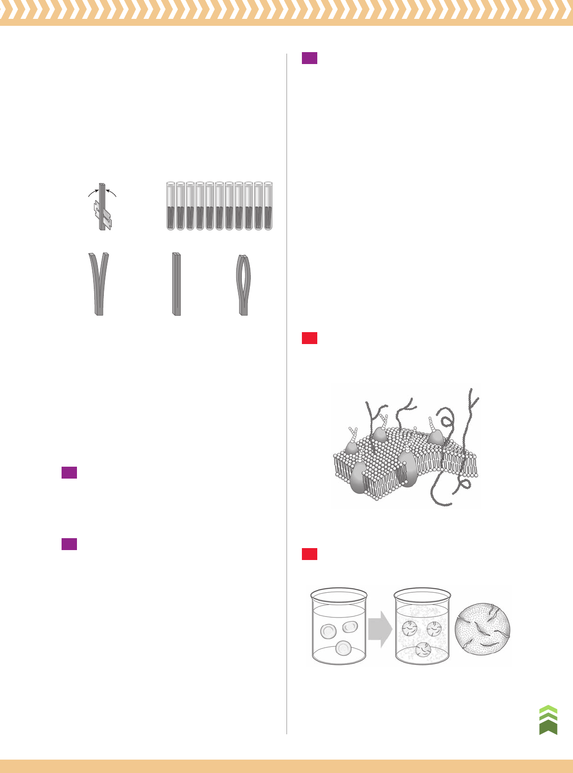 AtividAdesAtividAdes Fig. 1 Fig. 3 Fig. 4 Fig. 5 Fig. 2 Meio extracelular Citosol a B R ep ro d uç ão p ro ib id a. A rt .1 84 d o C ód ig o P en al e L ei 9 .6 10 d e 19 d e fe ve re iro d e 19 98 . 165 C a p ít u lo 5 • Fr o n te ir a s d a c é lu la fatia, de modo que ela ficasse seccionada em duas tiras, exceto na base (Fig. 1). Com um pincel, foi passada uma mistura de vaselina e cera de abelha nas laterais externas das tiras; e, na sequência, foram colocadas duas fatias de beterraba em cada tubo de ensaio (Fig. 2). Após duas horas, os estu- dantes observaram que, nas soluções de sacarose com concentrações 0,1 M, 0,2 M e 0,3 M, as fatias abriram-se (Fig. 3); na solução com concentração de 0,4 M, elas permaneceram fechadas (Fig. 4), nas demais concentrações, as fatias curvaram-se formando um orifício (Fig. 5). 27 (UFMS) As células de plantas e animais são reves- tidas por uma película denominada membrana plasmática, que envolve o citoplasma e seleciona o que entra e o que sai da célula. Assinale a(s) proposição(ões) correta(s) sobre a membrana plasmática. [Dê como resposta a soma dos números associados a afirmações corretas.] 001) A maioria das células apresenta envoltórios externos à membrana plasmática, como o glicocálix ou a parede celulósica. 002) As células jovens de plantas são portadoras da parede celulósica secundária. 004) A membrana plasmática de todas as células apresenta glicídios e proteínas como os seus principais componentes. 008) Todas as substâncias que entram ou que saem das células atravessam a membrana plasmáti- ca, nos dois sentidos, com a mesma facilidade e velocidade. 016) A diferença da concentração interna e externa, de determinadas moléculas ou íons nas célu- las, é mantida graças ao processo denominado transporte ativo. 032) Determinadas proteínas presentes na mem- brana plasmática, as permeases, auxiliam os glicídios, por exemplo, a entrarem no citoplasma. 28 (PUC-Minas) A membrana plasmática apresenta, em sua superfície, moléculas especiais que permi- tem à célula detectar outras substâncias presentes no meio externo, dando a ela certa sensibilidade química. Essas moléculas fazem parte: Sobre esse experimento, assinale a(s) proposição(ões) correta(s). 001) As soluções 0,1 M, 0,2 M e 0,3 M são hiper- tônicas. 002) A solução 0,3 M é hipotônica. 004) A solução 0,4 M é isotônica em relação ao déficit de pressão de difusão (d.p.d.) da be- terraba. 008) As soluções 0,4 M e 0,5 M são isotônicas. 016) As soluções 0,5 M, 0,6 M e 0,7 M são hiper- tônicas. 032) Apenas as soluções 0,8 M, 0,9 M e 1 M são hipertônicas. 25 (UFG-GO) A incorporação de gotículas no citoplas- ma, por invaginação da membrana plasmática, formando vesículas, denomina-se a) fagocitose. d) pinocitose. b) clasmocitose. e) plasmólise. c) endocitose. 26 (UEMS) Qual das alternativas descreve correta- mente um dos processos de transporte através da membrana plasmática? a) Fagocitose: processo de transporte que permite a entrada e saída de substâncias da célula es- pontaneamente. b) Exocitose: processo de transporte que permite a ingestão de substâncias através do uso de energia — bomba de sódio. c) Endocitose: processo de transporte que permite a eliminação de substâncias com dimensões maiores, que não atravessam a membrana plasmática. d) Processo ativo: permite a ingestão de substân- cias com dimensões maiores, que não atraves- sam a membrana plasmática, sem gasto de energia. e) Processo passivo: processo de transporte que ocorre sem gasto de energia como difusão, di- fusão facilitada e osmose. a) da cutícula. c) dos desmossomos. b) do glicocálix. d) dos cílios. 29 (UEMG) Observe a figura abaixo. A representa hemá- cias mergulhadas em um meio isotônico. Ao serem mergulhadas no meio B, sofreram hemólise. Em relação ao fenômeno ocorrido, pode-se afirmar que a) o meio B é hipotônico em relação às hemácias. b) as hemácias são hipotônicas em relação ao meio B. AtividAdesAtividAdes Membrana permeável Solução salina 12 g 6 g I II Solução salina 0 0 Volume da célula t1 t2 Tempo Diferença de concentração célula/solução V al o re s cr es ce n te s Na+ K+ Ca2+ Mg2+ C�– C on ce nt ra çã o R ep ro d uç ão p ro ib id a. A rt .1 84 d o C ód ig o P en al e L ei 9 .6 10 d e 19 d e fe ve re iro d e 19 98 . 166 U n id a d e B • O rg a n iz a çã o e p ro ce ss o s ce lu la re s c) ocorreu difusão de solutos das hemácias para o meio. d) a hemólise é provocada pelo transporte ativo de solvente, e não tem relação com a tonicidade das soluções. 30 (PUC-SP) Duas células vegetais, designadas por A e B, foram mergulhadas em meios diferentes. Logo após, notou-se que a célula A apresentou consi- derável aumento de volume vacuolar, enquanto a célula B apresentou retração de seu vacúolo e de seu citoplasma. A partir desses resultados, pode-se afirmar que as células A e B foram mergulhadas em soluções, respectivamente, a) isotônica e hipertônica. b) isotônica e hipotônica. c) hipotônica e isotônica. d) hipotônica e hipertônica. e) hipertônica e hipotônica. 31 (UFVJM-MG) Analise o experimento representado abaixo. 33 (Unesp) No início da manhã, a dona de casa lavou algumas folhas de alface e as manteve em uma bacia, imersas em água comum de torneira, até a hora do almoço. Com esse procedimento, a dona de casa assegurou que as células das folhas se mantivessem a) túrgidas, uma vez que foram colocadas em meio isotônico. b) túrgidas, uma vez que foram colocadas em meio hipotônico. c) túrgidas, uma vez que foram colocadas em meio hipertônico. d) plasmolisadas, uma vez que foram colocadas em meio isotônico. e) plasmolisadas, uma vez que foram colocadas em meio hipertônico. 34 (Fuvest-SP) Uma célula animal foi mergulhada em uma solução aquosa de concentração desconheci- da. Duas alterações ocorridas na célula enc