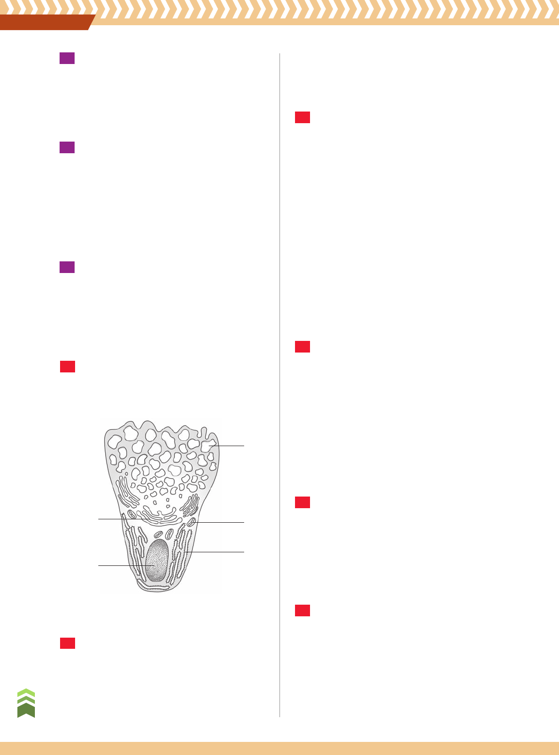 AtIvIDADEsAtIvIDADEs I V IV II III R ep ro d uç ão p ro ib id a. A rt .1 84 d o C ód ig o P en al e L ei 9 .6 10 d e 19 d e fe ve re iro d e 19 98 . 198 U n id a d e B • O rg a n iz a çã o e p ro ce ss o s ce lu la re s 35 (UFMT) Mitocôndrias são organelas presentes nas células eucarióticas cuja principal função é a) digestão celular. b) secreção de proteínas. c) transporte de nutrientes. d) orientação da divisão celular. e) respiração celular. 36 (UEMS) Organela de célula vegetal, que produz mo- léculas orgânicas, principalmente glicose, e serve de combustível para as mitocôndrias de todos os organismos que se alimentam, direta ou indireta- mente, das plantas: a) cloroplasto b) centríolo c) estômato d) ribossomo e) aparelho de Golgi 37 (UEMS) Qual alternativa apresenta características exclusivas de células eucariontes vegetais? a) cloroplastos, parede celular e vacúolo central b) mitocôndria, vacúolo central e lisossomos c) cloroplastos, carioteca e nucléolo d) parede celular, aparelho de Golgi e centríolos e) vacúolo central, citoplasma e retículo endoplas- mático 38 (FCM-MG) A célula esquematizada abaixo é respon- sável pela síntese e secreção de uma glicoproteína. O local da síntese e o da formação das vesículas de secreção são representados, respectivamente, pelas organelas de números a) ao hialoplasma. b) à membrana celular. c) à membrana nuclear. d) ao complexo de Golgi. 40 (FGV-SP) No pâncreas, existem estruturas glandu- lares chamadas ácinos nas quais, a partir de ami- noácidos, são produzidas as enzimas digestórias do suco pancreático. Em um experimento, utilizaram-se aminoácidos com isótopos radioativos para se verificar o traje- to desses aminoácidos nas células secretoras do pâncreas. Nas células dos ácinos, os aminoácidos constituintes das enzimas digestórias percorreram o seguinte trajeto: a) grãos de zimogênio, complexo golgiense, pero- xissomos. b) ergastoplasma, complexo golgiense, grãos de zimogênio. c) citoplasma, retículo endoplasmático liso, com- plexo golgiense. d) retículo endoplasmático liso, complexo golgien- se, grãos de zimogênio. e) complexo golgiense, ergastoplasma, grãos de zimogênio. 41 (Vunesp) No homem, o revestimento interno da traqueia apresenta células secretoras de muco que a lubrificam e a umedecem. A informação sobre a natureza secretora destas células permite inferir que elas são especialmente ricas em estruturas citoplasmáticas do tipo a) mitocôndrias e retículo endoplasmático liso. b) retículo endoplasmático granular e aparelho de Golgi. c) mitocôndrias e aparelho de Golgi. d) lisossomos e aparelho de Golgi. e) retículo endoplasmático granular e mitocôn- drias. 42 (UFF-RJ) O acrossomo, presente nos espermatozoi- des maduros, é essencial para a fecundação. A formação do acrossomo ocorre a partir do a) peroxissomo. b) lisossomo. c) complexo de Golgi. d) centríolo. e) retículo endoplasmático liso. 43 (Fazu-MG) São estruturas celulares que contêm no seu interior enzimas digestivas, que atuam no processo de digestão intracelular das partículas do meio externo englobadas pela célula por fagocitose e pinocitose. a) lisossomos primários b) peroxissomos c) complexo de Golgi d) ribossomos e) núcleo proteases. a) IV e II. c) V e III. b) IV e III. d) V e IV. 39 (Unigranrio-RJ) Trata-se de uma estrutura que con- tém um sistema de membranas lisas que formam vesículas e sáculos achatados, paralelamente dis- postos. Está presente em células animais e também em células vegetais e tem como funções principais armazenar proteínas, organizar o acrossomo nos espermatozoides e promover a síntese de glicopro- teínas. Menção feita AtIvIDADEsAtIvIDADEs Citoplasma 1 2 3 Tripletes de microtúbulos I trans cis II III 30S 50S IV R ep ro d uç ão p ro ib id a. A rt .1 84 d o C ód ig o P en al e L ei 9 .6 10 d e 19 d e fe ve re iro d e 19 98 . 199 C a p ít u lo 6 • C it o p la sm a e o rg a n e la s ci to p la sm át ic a s 44 (Unesp) No esquema estão representadas etapas, numeradas de 1 a 3, de um importante processo que ocorre no interior das células, e algumas or- ganelas envolvidas direta ou indiretamente com esse processo. 46 (Unimontes-MG) Organelas são estruturas com fun- ções especializadas, suspensas no citoplasma das células vivas. A figura a seguir apresenta algumas organelas celulares. Observe-a. As etapas que correspondem a 1, 2 e 3, respecti- vamente, e algumas organelas representadas no esquema, estão corretamente listadas em: a) absorção de aminoácidos, síntese proteica e ex- portação de proteínas; retículo endoplasmático, lisossomo e mitocôndria. b) fagocitose de macromoléculas, digestão celular e egestão de resíduos; retículo endoplasmático, complexo de Golgi e lisossomo. c) fagocitose de sais minerais, fotossíntese e ex- portação de compostos orgânicos; cloroplastos e vacúolos. d) absorção de oxigênio, respiração celular e eli- minação de dióxido de carbono; mitocôndrias e vacúolos. e) fagocitose de macromoléculas, digestão celu- lar e exportação de proteínas; mitocôndrias e lisossomos. 45 (Vunesp-Adaptado) Se fôssemos comparar a organi- zação e o funcionamento de uma célula eucarionte com o que ocorre em uma cidade, poderíamos estabelecer determinadas analogias. Por exemplo, a membrana plasmática seria o perímetro urbano e o hialoplasma corresponderia ao espaço ocupado pelos edifícios, ruas e casas com seus habitantes. O quadro reúne algumas similaridades funcionais entre cidade e célula eucarionte. Cidade Célula eucarionte I Ruas e avenidas 1 Mitocôndrias II Silos e armazéns 2 Lisossomos III Central elétrica (energética) 3 Retículo endoplasmático IV Casas com aquecimento solar 4 Complexo de Golgi V Restaurantes e lanchonetes 5 Cloroplastos Correlacione os locais da cidade com as principais funções correspondentes às organelas celulares e qual a alternativa corre
