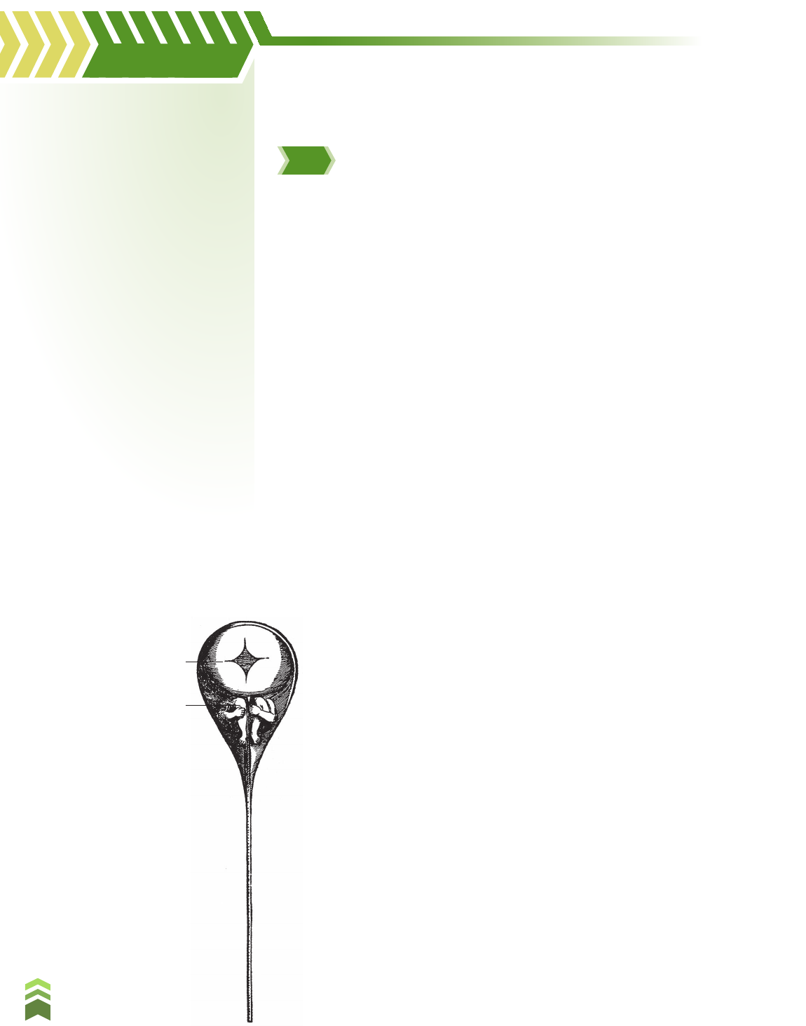 R ep ro d uç ão p ro ib id a. A rt .1 84 d o C ód ig o P en al e L ei 9 .6 10 d e 19 d e fe ve re iro d e 19 98 . 464 U n id a d e E • R e p ro d u çã o e d e se n vo lv im e n to Objetivos❱❱❱❱ Valorizar CCCCCCC conhecimentos sobre o desenvolvimento embrionário dos cordados, que permitem identificar padrões no mundo natural e refletir sobre as relações de parentesco entre os diferentes grupos de organismos. Reconhecer que o CCCCCCC desenvolvimento embrionário envolve multiplicação, crescimento e especialização — diferenciação — de células. Termos e conceitos❱❱❱❱ desenvolvimento • embrionário Aspectos gerais do desenvolvimento embrionário 1 Primeiras ideias sobre desenvolvimento Desenvolvimento embrionário é o período em que o zigoto, a primeira célula do indivíduo multicelular, transforma-se em um jovem organismo semelhante aos pais. O filósofo grego Aristóteles (384-322 a.C.) foi um dos primeiros a se interessar pelo desenvolvimento embrionário. Observando as diferentes maneiras pelas quais os animais podiam nascer, ele os clas- sificou em: ovíparos, que se desenvolvem dentro de ovos (aves, répteis, anfíbios e a maioria dos invertebrados); vivíparos, cujo desenvolvimento ocorre dentro do organismo materno (a maioria dos mamíferos); ovoviví- paros, que se desenvolvem dentro de ovos retidos no interior do corpo materno (certos tipos de peixes e de répteis). Observando ovos de aves desde o início da incubação, Aristóteles concluiu que o pintinho surgia a partir de substâncias que se organizavam gradualmente para formar as diversas partes de seu corpo. Para ele, a matéria-prima contida no ovo representava o “princípio feminino”, que se desenvolvia quando encontrava o “princípio masculino”, representado pelo esperma. No caso dos seres humanos, Aristóteles acreditava que o fluxo menstrual, retido durante a gravidez, era o material formador do embrião; o esperma do pai atuaria sobre esse material, dando-lhe forma e animação. Foi somente em 1651 que o médico inglês William Harvey (1578-1657), famoso por seus estudos sobre a circulação do sangue, concluiu que todos os animais, inclusive os mamíferos, originam-se a partir de ovos. Em 1672, o cientista italiano Marcello Malpighi (1628-1694) publicou o primeiro estudo microscópico sobre o desenvolvimento do embrião de galinha. A partir de então, começou um grande debate entre os estudiosos do desenvolvimento: estariam os órgãos embrionários presentes, em miniatura, dentro do ovo ou do espermatozoide ou seriam eles formados, reincidentemente, a cada nova geração? A primeira hipótese foi denominada pré-formação, e a segunda, epigênese. Vejamos algumas reflexões sobre elas. Em primeiro lugar, se admitimos que todos os órgãos já estão prontos, em tamanho reduzido, dentro dos gametas, o desenvolvimento embrionário passa a ser apenas uma questão de crescimento e não há muito o que discutir a respeito. A hipótese da pré-formação, ou pré-formista, foi muito popular no século XVIII porque correspondia às ideias da época, adequando-se ao contexto científico, religioso e filosófico. Caso adotemos a hipótese epigenética, porém, temos de explicar como um ser vivo completo e organizado pode surgir a partir da massa de substâncias que constitui o ovo. Em segundo lugar, quando se admite a existência de um adulto em miniatura dentro do gameta, chega-se à conclusão de que uma geração já está definida de antemão dentro da outra, desde a primeira, o que é con- veniente para explicar por que as espécies mantêm suas características constantes ao longo das gerações. (Fig. 18.1) Figura 18.1 Espermatozoide desenhado em 1694 por defensores do pré-formismo, que acreditavam ser possível ver no interior dos gametas um novo ser humano em miniatura (homúnculo). Entre os adeptos dessa ideia havia os espermistas, segundo os quais o homúnculo estaria no espermatozoide, e os ovulistas, segundo os quais estaria no óvulo. Na ilustração, homúnculo no espermatozoide em posição fetal, com uma grande cabeça onde se vê a moleira, um espaço entre os ossos presente nos recém-nascidos. Moleira Homúnculo Seção 18.1 R ep ro d uç ão p ro ib id a. A rt .1 84 d o C ód ig o P en al e L ei 9 .6 10 d e 19 d e fe ve re iro d e 19 98 . 465 C a p ít u lo 1 8 • N o çõ e s d e e m b ri o lo g ia a n im a l Epiderme Somitos (musculatura e vértebras) Intestino Ânus Membro anterior Lábio dorsal do blastóporo Brânquia Notocorda Orelha Olho Lente do olho Ventosa do girino Limite da cabeça BLÁSTULA Mesoderma lateral Embora alguns microscopistas afirmassem ter visto no interior dos gametas um pequeno ser humano (homúnculo) completamente formado, as ideias epigenéticas prevaleceram. A partir da metade do século XIX, com o estabelecimento da teoria celular e a demonstração irrefutável de que óvulos e espermatozoides eram células, não havia mais como defender a pré-formação. Os estudos citológicos que se seguiram levaram à descoberta da divisão celular, o que consolidou a ideia de que, nos seres com reprodução sexuada, a vida de um organismo tem início com o zigoto e implica três processos básicos: multiplicação, crescimento e diferenciação celulares para formar os diversos tecidos e órgãos do adulto. Na tentativa de compreender o mais desafia- dor desses processos — a diferenciação celular —, muitos biólogos dedicaram suas habilidades de observação e de experimentação ao estudo do desenvolvimento embrionário. Cientistas pioneiros fizeram verdadeiras microcirurgias em embriões em desenvolvimento, partindo-os com laços de fios de cabelo ou transplantando partes de um local para outro, com embriões de mesma idade e de idades diferentes. Em 1929, o embriologista alemão Walther Vogt (1888-1941) desenvolveu um método interessante para mapear embriões de sapo. Ele aplicava pequenos discos de gelatina contendo coran