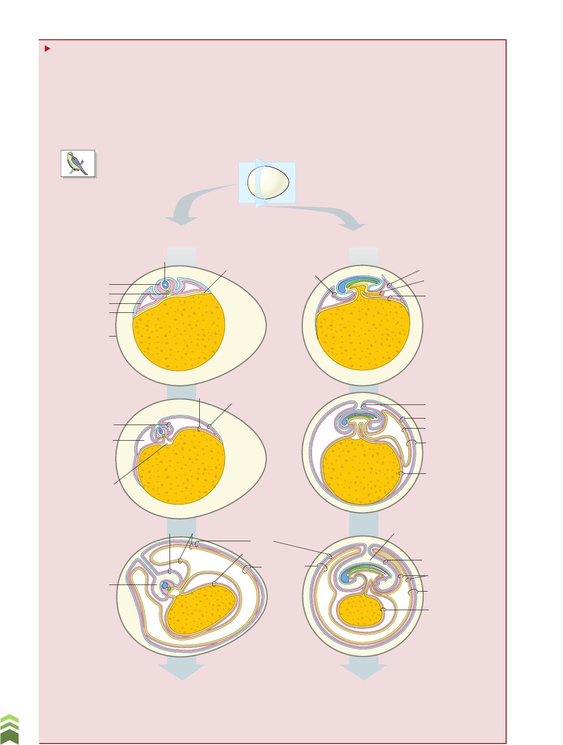 AtividAdes R ep ro d uç ão p ro ib id a. A rt .1 84 d o C ód ig o P en al e L ei 9 .6 10 d e 19 d e fe ve re iro d e 19 98 . 488 U n id a d e E • R e p ro d u çã o e d e se n vo lv im e n to Figura 18.26 Representação esquemática do desenvolvimento dos anexos embrionários em galinha. À esquerda, três estágios do desenvolvimento de um ovo, em corte longitudinal; o embrião aparece cortado transversalmente. À direita, estágios correspondentes do ovo em corte transversal; o embrião aparece cortado longitudinalmente. (Imagem sem escala, cores-fantasia.) (Baseado em Houillon, C., 1972.) Analise a figura acompanhando as explicações no texto. Cório O cório, ou serosa, é uma membrana formada pelo crescimento conjunto da somatopleura e do ectoder- ma, constituindo uma bolsa membranosa que envolve todos os outros anexos embrionários, inclusive a bolsa amniótica que contém o embrião. O cório se desenvolve e encosta-se à membrana junto à casca. Ao mesmo tem- FORMAÇÃO DOS ANEXOS EMBRIONÁRIOS EM AVES Ovo em corte transversal Embrião em corte longitudinal Saco vitelínico Alantoide CórioÂmnioEndoderma Ovo em corte longitudinal Embrião em corte transversal Tubo nervoso Somito Notocorda Mesoderma Ectoderma Casca Vitelo Saco vitelínico Albume Cório Âmnio Saco vitelínico Cório Alantoide Alantocório Âmnio Alantoide Alantocório Saco vitelínico Cavidade amniótica Cavidade amniótica Âmnio Âmnio EMBRIÃO COM 48 HORAS EMBRIÃO COM 72 HORAS EMBRIÃO COM 4 DIAS Alantoide Cório Saco vitelínico Alantocório Celoma extraembrionário Arquêntero po, o alantoide também cresce e ocupa todo o espaço disponível, de modo que sua face externa entra em contato com o cório junto à casca. O conjunto formado pela associação entre o cório e o alantoide, o alantocó- rio, ou corioalantoide, é ricamente vascularizado, o que permite uma eficiente troca de gases entre os tecidos embrionários e o ar ao redor da casca. (Fig. 18.26) AtividAdes R ep ro d uç ão p ro ib id a. A rt .1 84 d o C ód ig o P en al e L ei 9 .6 10 d e 19 d e fe ve re iro d e 19 98 . 489 C a p ít u lo 1 8 • N o çõ e s d e e m b ri o lo g ia a n im a l QUESTÕES PARA PENSAR E DISCUTIR Questões objetivas Considere as alternativas a seguir para responder às questões 1 e 2. a) Blástula. b) Gástrula. c) Mórula. d) Nêurula. 1. Como se denomina a fase do desenvolvimento em- brionário em que o embrião é uma esfera compacta de células? 2. Em que estágio do desenvolvimento embrionário dos vertebrados se formam os somitos? 3. Os três folhetos germinativos característicos dos embriões de animais triblásticos são a) mórula, blástula e gástrula. b) ectoderma, mesoderma e endoderma. c) micrômero, blastômero e macrômero. d) blastocela, arquêntero e celoma. 4. Qual é o nome da cavidade totalmente revestida por mesoderma, presente no corpo de animais triblásticos e cuja função é acomodar os órgãos internos? a) Arquêntero. b) Blastocela. c) Blastóporo. d) Celoma. 5. Um embrião de vertebrado em fase de nêurula apresenta, do dorso para o ventre, as seguintes estruturas: a) tubo nervoso, tubo digestório e notocorda; b) tubo nervoso, notocorda e tubo digestório; c) notocorda, tubo nervoso e tubo digestório; d) notocorda, tubo digestório e tubo nervoso. Questões discursivas 6. As sequências de figuras, abaixo, representam es- tágios do desenvolvimento inicial de anfioxo (A) e de anfíbio (B). Com relação ao esquema 1, responda: a) Em que fase de desenvolvimento se encontra o embrião representado? b) Qual é o nome das partes indicadas? Com relação ao esquema 2, responda: a) Que estágio de desenvolvimento está se ini- ciando? b) Quais são os nomes das partes indicadas? c) O esquema 2 representa um embrião em que vários processos estão se iniciando. Utilizando o mesmo tipo de desenho, represente o em- brião em um estágio mais avançado, no qual os processos iniciados em 2 estejam finalizados. Coloque legendas. VESTIBULARES PELO BRASIL Brasil Região Nordeste Região Sudeste Região Norte Região Centro-Oeste Região Sul Brasil – Regiões Questões objetivas 1 (Cesupa-PA) A figura abaixo esquematiza, de modo simplificado, a continuidade celular através das gerações. Células germinativas masculinas e fe- mininas fundem-se para formar o zigoto, que se multiplica sucessivamente, originando as demais células que compõem o corpo do novo indivíduo.A B Em que diferem os processos que ocorrem em A e B? Como se explica a diferença? 7. Os esquemas a seguir representam dois momentos de embriogênese do anfioxo (1 em corte longitudi- nal e 2 em corte transversal). a1 Região dorsal Região anterior Região posterior b1 Região ventral e2 b2 d1 c1 a2 c2 f2 d2 1 2 Espermatozoide 1 Óvulo 2 Zigoto 3 4 5 Multiplicação celular AtividAdesAtividAdes R ep ro d uç ão p ro ib id a. A rt .1 84 d o C ód ig o P en al e L ei 9 .6 10 d e 19 d e fe ve re iro d e 19 98 . 490 U n id a d e E • R e p ro d u çã o e d e se n vo lv im e n to Sobre as fases dos processos de fecundação e desenvolvimento embrionário em questão, iden- tificadas na figura pelos algarismos 1, 2, 3, 4 e 5, pode-se dizer que a) as células 1 e 2 são diploides. b) a célula 3 sofrerá clivagem do tipo completa e igual. c) a célula 4 está constituída por macrômeros e micrômeros. d) a célula 5 representa, seguramente, a fase de gastrulação. 2 (Unifap) As células-ovo da maioria das espécies animais apresentam substâncias nutritivas de- nominadas vitelo, sendo este formado por uma mistura de proteínas e gorduras. Considerando a quantidade e distribuição do vitelo, as células- -ovo são classificadas em quatro tipos, conforme agrupadas a seguir. [Dê como resposta a soma dos números associados às proposições corretas.] 01) Ovos telolécitos apresentam grande quantidade de vitelo, distribuída de forma heterogênea no citoplasma. Possuem um polo vegetativo com maior concentração de vitelo 