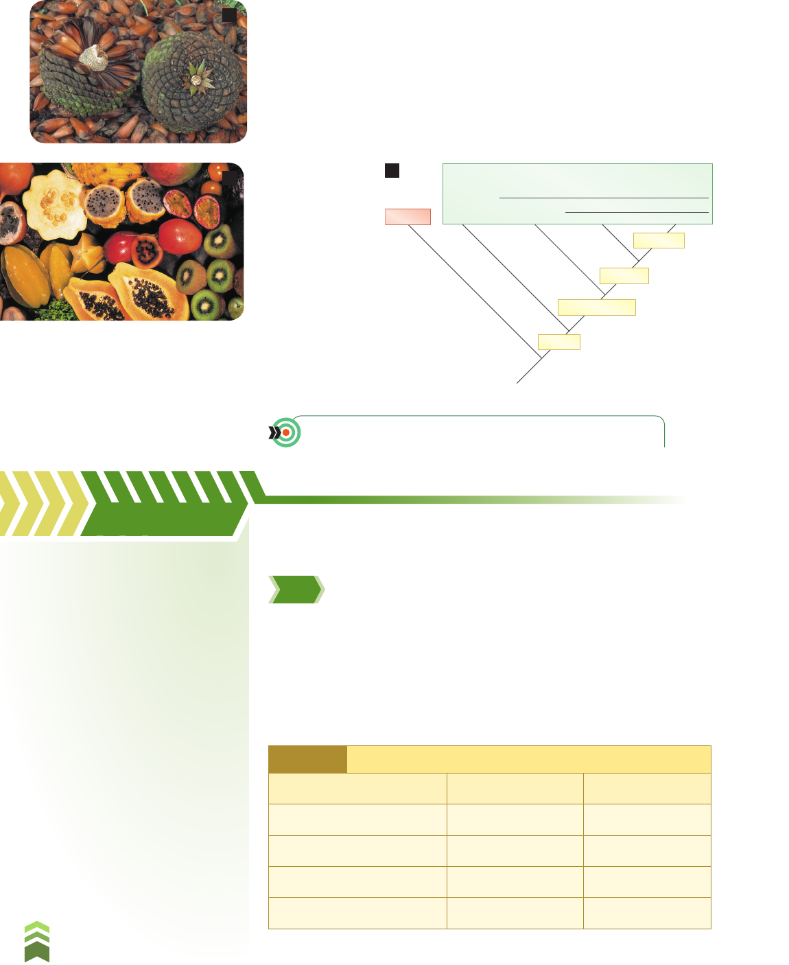 REINO PLANTAE TRAQUEÓFITAS ESPERMATÓFITAS BRIÓFITAS PTERIDÓFITAS GIMNOSPERMAS ANGIOSPERMAS Flor e fruto Semente Embrião ALGASALGAS Vasos condutores As plantas vasculares com sementes são chamadas de espermatófitas. Entre elas, há aquelas em que as sementes ficam expostas externamente no órgão reprodutivo, o que lhes valeu a denominação de gimnospermas (do grego gymnos, nu, e sperma, semente), e as que têm as sementes abri- gadas no interior do fruto, sendo por isso chamadas de angiospermas (do grego angion, vaso, e sperma, semente). Os representantes mais conhecidos das gimnospermas são os pinheiros. No pinheirodoparaná, por exemplo, as sementes (pinhões) ficam agrupadas no órgão reprodutivo, formando a pinha. (Fig. 6.3) Conteúdo digital Moderna PLUS http://www.modernaplus.com.br Texto: O sistema de classificação de Eichler Figura 6.3 A. Foto de pinhas do pinheirodoparaná; à direita, pinha intacta; à esquerda, pinha parcialmente desfeita pela liberação de algumas sementes. B. Frutos cortados de angiospermas mostrando as sementes em seu interior. C. Cladograma que mostra algumas das características compartilhadas pelos grupos de planta. A B C Seção 6.2 Objetivo❱❱❱❱ Identificar os principais CCCCCCC grupos de briófitas e descrever seu ciclo de vida, reconhecendo: a) a alternância entre gerações haploide e diploide; b) a relação de independência entre gametófito e esporófito; c) a predominância da fase gametofítica. Termos e conceitos❱❱❱❱ briófita• propágulo• anterídio• anterozoide• arquegônio• oosfera• esporângio• esporo• protonema• Plantas avasculares: briófitas 1 Diversidade das briófitas No sistema de classificação que adotamos nesta obra, as plantas avas- culares, conhecidas popularmente como briófitas, são distribuídas em três filos: Bryophyta (musgos), Hepatophyta (hepáticas) e Anthocerophyta (antóceros). É importante ressaltar que umas poucas espécies de musgo apresentam tecidos condutores de seiva, que são, no entanto, diferentes dos das plantas vasculares. (Tab. 6.2) Tabela 6.2 Número estimado de espécies de briófitas Filos Brasil Mundo Bryophyta (musgos) 1.964 8.000 Hepatophyta (hepáticas) 1.125 6.000 Anthocerophyta (antóceros) 36 80 TOTAL 3.125 14.080 Fonte: Sheperd, G. J., 2006. 156 U n id a d e C • D iv e rs id a d e , a n at o m ia e f is io lo g ia d a s p la n ta s R ep ro d uç ão p ro ib id a. A rt .1 84 d o C ód ig o P en al e L ei 9 .6 10 d e 19 d e fe ve re iro d e 19 98 . AMPLIE SEUS CONHECIMENTOS O que é turfa? R ep ro d uç ão p ro ib id a. A rt .1 84 d o C ód ig o P en al e L ei 9 .6 10 d e 19 d e fe ve re iro d e 19 98 . 157 C a p ít u lo 6 • D iv e rs id a d e e r e p ro d u çã o d a s p la n ta s 2 Características gerais das briófitas Briófitas (do grego brion, musgos) são plantas pequenas e delicadas que vivem geralmente em ambientes úmidos e sombrea dos, como barrancos e troncos de árvores no interior das matas. A maioria das espécies não ultrapassa 5 centímetros de altura, apesar de haver, na Nova Zelândia, briófitas que chegam a atingir 50 centímetros. As espécies mais conhecidas de briófita são os musgos, que podem formar densos tapetes verdes sobre pedras, troncos de árvores e barrancos. (Fig. 6.4) Há musgos que vivem em locais relativamente secos, como a superfície de rochas ou barrancos expostos ao sol, sendo capazes de suportar temperaturas altas durante o dia. Há espécies de mus- go capazes de tolerar temperaturas muito baixas, como ocorre em vastas áreas ao norte do Círculo Polar Ártico, onde musgos são as únicas plantas presentes. Há umas poucas hepáticas que vivem em água doce, mas não há nenhuma espécie marinha. Figura 6.4 A. Foto de gametófitos folhosos de uma hepática. B. Foto de musgos. As estruturas filamentosas marrons são os esporófitos, que crescem sobre os gametófitos folhosos verdes. A B Musgos do gênero Sphagnum formam as turfeiras, um tipo de vegetação de regiões úmidas que ocupa mais de 1% da superfície dos continentes, o que coloca essas plantas entre as mais abundantes no planeta. A turfa é formada pelo acúmulo de musgos mortos em terrenos pantanosos e pobres em gás oxigênio; isso os protege da decomposição e, consequentemente, seus átomos de carbono não retornam ao ambiente na forma de gás carbônico (CO2). Calcula-se que o carbono retido nas turfeiras de todo o mundo chegue a 400 bilhões de toneladas. Nas regiões do norte da Europa e da Ásia, a turfa seca é queimada para fornecer energia. Em jardinagem, é uma prática costumeira misturar restos de musgos do gênero Sphagnum ao solo para aumentar sua capacidade de reter água e torná-lo mais ácido. A intensa exploração comercial da turfa pode trazer consequências am- bientais indesejáveis, pois faz retornar rapidamente ao ambiente, na forma de CO2, o carbono retido por tanto tempo na matéria orgânica das turfeiras. (Fig. 6.5) Figura 6.5 Plantas vivas de musgo do gênero Sphagnum (esfagno) (à esquerda). Os musgos secos (à direita) misturados ao solo aumentam a capacidade de retenção de água do solo e elevam seu grau de acidez. R ep ro d uç ão p ro ib id a. A rt .1 84 d o C ód ig o P en al e L ei 9 .6 10 d e 19 d e fe ve re iro d e 19 98 . 158 U n id a d e C • D iv e rs id a d e , a n at o m ia e f is io lo g ia d a s p la n ta s Como todas as plantas, as briófitas apresentam alternância de gerações em seu ciclo de vida; o gametófito haploide é a geração mais desenvolvida e persistente. O esporófito das briófitas é diploide, tem tamanho reduzido e sempre se desenvolve sobre o gametófito, nutrindose à custa deste até atingir a maturidade, quando produz esporos e morre. 3 Organização corporal das briófitas O corpo das briófitas, denominado talo (do grego thallos, corpo vegetativo filamentoso ou laminar), é constituído por células pouco diferenciadas. Entre as células mais especializadas