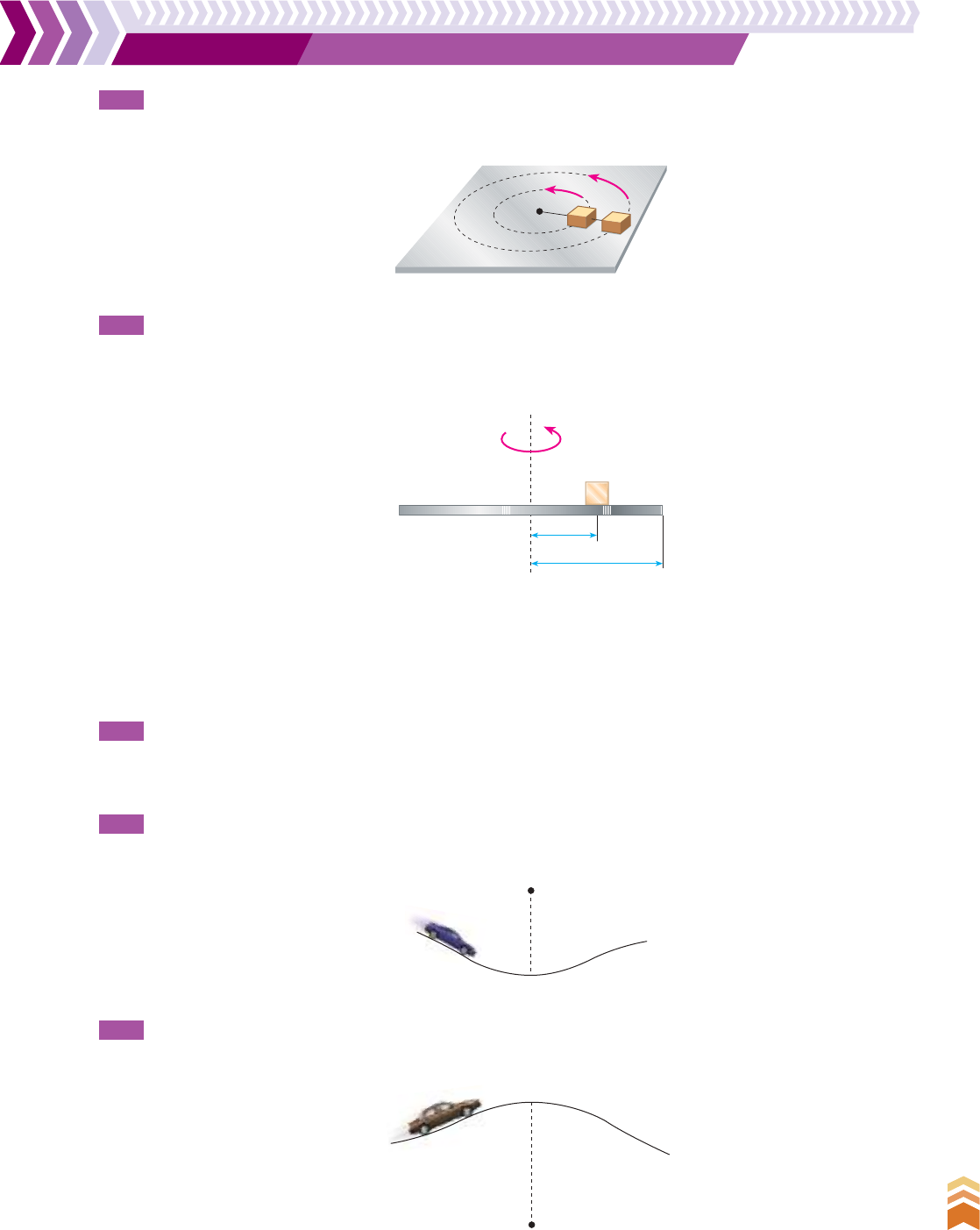 263 C a p ít u lo 1 3 • Fo rç a s e m t ra je tó ri a s cu rv ilí n e a s 263 R ep ro d uç ão p ro ib id a. A rt .1 84 d o C ód ig o P en al e L ei 9 .6 10 d e 19 d e fe ve re iro d e 19 98 . P. 303 A figura mostra um sistema de dois corpos de massas iguais a 0,2 kg, ligados por fios inextensíveis e de massas desprezíveis, de 0,3 m cada, girando num plano horizontal sem atrito, com velocidade angular h 4 rad/s, em torno do ponto fixo O. Determine as intensidades das trações nos fios. P. 304 (UFPR) Um disco de raio R está em movimento circular uniforme com velocidade angular h. Sobre esse disco está posicionado um pequeno bloco de madeira de massa m, a uma distância r do eixo de rotação, conforme mostra, em perfil, a figura abaixo. O coeficiente de atrito estático entre o bloco e o disco é j. Sabe-se que existe uma velocidade angular máxima hmáx. a partir da qual o bloco desliza para fora do disco. A aceleração da gravidade é representada por g. P. 305 Uma rodovia tem 8 m de largura. Calcule a diferença de nível que deve existir entre suas margens externa e interna para que um carro possa fazer uma curva de 600 m de raio a 72 km/h sem depender do atrito. Adote g 10 m/s2 e, para pequenos ângulos, considere sen J 7 tg J. P. 306 O veículo da figura tem peso P 10.000 N e passa no ponto inferior da depressão com 54 km/h. O raio da curva nesse ponto é 10 m. Determine a força de reação da pista no veículo nesse ponto. Adote g 10 m/s2. P. 307 (FEI-SP) Um veículo de massa 1.600 kg percorre um trecho de estrada (desenhada em corte na figura e contida num plano vertical) em lombada, com velocidade de 72 km/h. Adote g 10 m/s2. Determine a intensidade da força que o leito da estrada exerce no veículo quando este passa pelo ponto mais alto da lombada. O R r m ω Com base nesses dados, responda os itens a seguir. a) Represente na figura as forças que atuam sobre o bloco durante o movimento e indique os seus nomes. b) Obtenha uma equação para a velocidade angular máxima hmáx. com os dados fornecidos. c) O que acontecerá com a velocidade angular máxima hmáx. quando a distância r do bloco ao eixo de rotação for duplicada? Justifique. exercícios propostos de recapitulação R = 10 m R = 80 m V1_P2_UN_D_CAP_13.indd 263 25.07.09 17:16:37 264 U n id a d e D • Fo rç a s e m D in â m ic a 264 R ep ro d uç ão p ro ib id a. A rt .1 84 d o C ód ig o P en al e L ei 9 .6 10 d e 19 d e fe ve re iro d e 19 98 . P. 310 (Fuvest-SP) Um ventilador de teto, com eixo vertical, é consti- tuído por três pás iguais e rígidas, encaixadas em um rotor de raio R 0,10 m, formando ângulos de 120w entre si. Cada pá tem massa M 0,20 kg e comprimento L 0,50 m. No centro de uma das pás foi fixado um prego P, com massa mP 0,020 kg, que desequilibra o ventilador, principalmente quando este se movimenta. Suponha, então, o ventilador girando com uma velocidade de 60 rotações por minuto e determine: a) a intensidade da força radial horizontal F, em newtons, exercida pelo prego sobre o rotor; P Rotor120° 0,50 m T. 255 Uma partícula tem movimento circular uniforme em um referencial inercial. A força que age sobre a partícula é F. Se você quiser dobrar o raio da tra- jetória mantendo a velocidade angular constante, deverá exercer uma força igual a: a) 2F c) F __ 4 e) F b) F __ 2 d) 4F T. 256 Referindo-se ao teste anterior, se você quiser dobrar o raio da trajetória mantendo a velocidade escalar constante, deverá exercer uma força igual a: a) 2F c) F __ 4 e) F b) F __ 2 d) 4F T. 257 Um corpo de massa igual a 1,0 kg descreve, sobre uma mesa bem polida, uma circunferência hori- zontal de raio igual a 1,0 m quando preso por um fio a um ponto fixo na mesa. O corpo efetua 60 voltas T. 258 (PUC-SP) A figura mostra um sistema de dois corpos de massas iguais, ligados por fios inextensíveis e de massas desprezíveis, girando num plano horizontal, sem atrito, com velocidade angular h, constante, em torno do ponto fixo O. A razão T2 ___ T1 entre as trações T2 e T1, que atuam respectivamente nos fios (2) e (1), tem valor: a) 2 c) 1 e) 1 __ 2 b) 3 __ 2 d) 2 __ 3 L L (1) (2) Oω testes propostos P. 308 (UFG-GO) Um bloco de massa m, preso a uma mola de cons- tante elástica k, descreve um movimento circular uniforme numa mesa horizontal lisa (sem atrito), conforme a figura ao lado. A mola, quando não deformada, tem comprimento L. Quando o bloco gira com velocidade angular h, o raio da trajetória é R. Nessas condições, pede-se: a) o esquema das forças que atuam no bloco; b) o valor da constante elástica k da mola, considerando que: L 0,6 m; R 0,8 m; m 2 kg; h 5 rad/s. P. 309 Um pequeno bloco de massa m1 gira sobre uma mesa horizon- tal sem atrito. Esse bloco está ligado a outro, de massa m2, por um fio que passa por um orifício existente na mesa. O bloco de massa m1 descreve um movimento circular uniforme de raio R 0,50 m e velocidade v 5,0 m/s, e o bloco de massa m2 permanece em repouso. Sendo g 10 m/s2, determine a relação m2 ___ m1 . b) a massa M0, em kg, de um pequeno contrapeso que deve ser colocado em um ponto D0, sobre a borda do rotor, para que a resultante das forças horizontais, agindo sobre o rotor, seja nula; c) a posição do ponto D0, localizando-a no esquema dado acima. (Se necessário, utilize s 3.) completas por minuto. A força de tração exercida no fio, expressa em newtons, é mais aproximada- mente igual a: a) 1 c) 12 e) 80 b) 6 d) 40 R m1 m2 V1_P2_UN_D_CAP_13.indd 264 25.07.09 17:16:38 265 C a p ít u lo 1 3 • Fo rç a s e m t ra je tó ri a s cu rv ilí n e a s 265 R ep ro d uç ão p ro ib id a. A rt .1 84 d o C ód ig o P en al e L ei 9 .6 10 d e 19 d e fe ve re iro d e 19 98 . T. 259 (UFF-RJ) Uma pequena moeda está na iminência de se des- locar sobre uma plataforma horizontal circular, devido ao movimento dessa plataforma, que gira com velocidade angular de 2,0 rad/s. O coeficiente de atrito estático entre a moeda e a plataforma é 0
