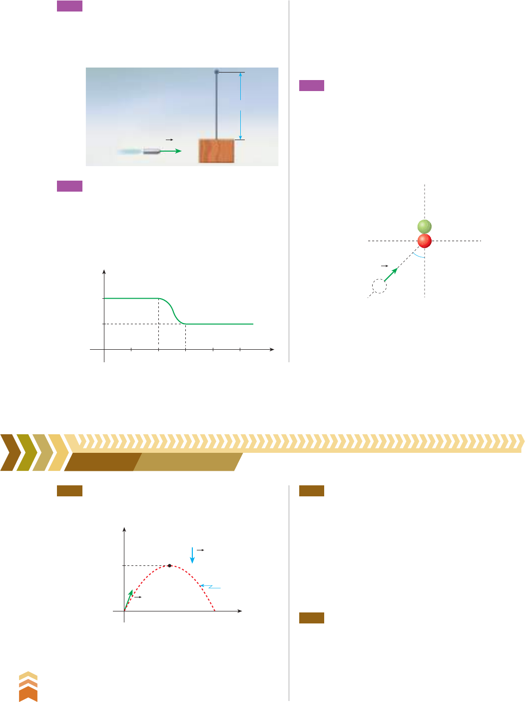 348 U n id a d e E • O s p ri n cí p io s d a c o n se rv a çã o 348 R ep ro d uç ão p ro ib id a. A rt .1 84 d o C ód ig o P en al e L ei 9 .6 10 d e 19 d e fe ve re iro d e 19 98 . a) Calcule as componentes x e y das velocidades de A e B logo após a colisão. b) Calcule a variação da energia (cinética de trans- lação) na colisão. (Nota: Despreze a rotação e o rolamento das bolas.) A A B α y x v0 P. 427 (Unifei-MG) Um projétil de massa m e velocidade v0 atravessa o bloco de massa M do pêndulo da figura. Sabendo que a velocidade do projétil após atraves- sar o pêndulo é v0 __ 2 , qual é o menor valor de v0 para que o bloco de massa M dê uma volta completa? P. 429 (Unicamp-SP) Jogadores de sinuca e bilhar sabem que, após uma colisão não frontal de duas bolas A e B de mesma massa, estando a bola B inicialmente parada, as duas bolas saem em direções que for- mam um ângulo de 90w. Considere a colisão de duas bolas de 200 g, representada na figura abaixo. A se dirige em direção a B com velocidade v0 2,0 m/s formando um ângulo a com a direção y tal que sen a 0,80. Após a colisão, B sai na direção y. 2,0 1,1 vA (m/s) t (s)1,2 1,3 1,4 1,5 1,0 Considerando desprezíveis as forças de atrito, de- ter mine: a) a velocidade do patinador B após o choque com o patinador A; b) a intensidade da força média de contato entre A e B, durante o choque. A quantidade de movimento adquirida pela partí- cula no ponto Q , de altura máxima, tem módulo: a) mv0 c) m dllll 2gh b) m dllllllll v0 2 2 2gh d) m dlllllll v0 2 ___ 2 2 gh T. 318 (AFA-SP) Uma partícula de massa m é lançada obli- quamente com velocidade v0 próxima à superfície terrestre, conforme indica a figura abaixo. T. 320 (UFRN) Na cobrança de uma penalidade máxima em um jogo de futebol, a bola, que está inicialmente parada na marca do pênalti, sai com velocidade de 20 m/s, imediatamente após ser chutada pelo jogador. A massa da bola é 0,45 kg, e o tempo de contato entre o pé do jogador e a bola é 0,25 s. A força média que o pé do jogador aplica sobre a bola, nessa cobrança, é: a) 23 N b) 2,3 N c) 3,6 N d) 36 N h x y v0 gQ Parábola T. 319 (Fatec-SP) Uma esfera se move sobre uma super- fície horizontal sem atrito. Num dado instante, sua energia cinética vale 20 J e sua quantidade de movimento tem módulo 20 N 3 s. Nestas condições, é correto afirmar que sua: a) velocidade vale 1,0 m/s. b) velocidade vale 5,0 m/s. c) velocidade vale 10 m/s. d) massa é de 1,0 kg. e) massa é de 10 kg. testes propostos P. 428 (Ufes) Um patinador A de massa mA 40 kg perse- gue um patinador B de massa mB 30 kg. Ambos se deslocam inicial mente em movimento retilíneo uniforme com velocidades vA 2,0 m/s e vB 1,0 m/s no mesmo sentido. A varia ção da velocidade do patinador A, devido ao choque com B, é medida experimentalmente em função do tempo, cujo resultado é mostrado no gráfico abaixo. M L v0 m V1_P2_UN_E_CAP_16B.indd 348 27.07.09 18:44:09 349 C a p ít u lo 1 6 • Im p u ls o e q u a n ti d a d e d e m o vi m e n to 349 R ep ro d uç ão p ro ib id a. A rt .1 84 d o C ód ig o P en al e L ei 9 .6 10 d e 19 d e fe ve re iro d e 19 98 . O módulo da velocidade máxima adquirida pelo carrinho é, em m/s: a) 5 b) 10 c) 15 d) 20 e) 25 Se a vazão de areia sobre a esteira é de 80 kg/s, a intensidade da força adicional necessária para manter o movimento da esteira à mesma veloci- dade de 0,5 m/s é, em newtons, igual a: a) 10 b) 20 c) 40 d) 60 e) 80 T. 322 (UFTM-MG) Uma esteira rolante, horizontal, que se move com velocidade constante de 0,5 m/s, é utilizada para transportar areia de um recipiente em forma de funil para dentro da caçamba de um caminhão basculante. Ao atingir a esteira, a areia imediatamente adquire a sua velocidade. T. 323 (Uesb-BA) Um projétil de massa 20 g é disparado perpendicularmente contra uma porta de ma- deira, de 8,0 cm de espessura. O projétil atinge a porta com velocidade de 250 m/s e a abandona com 150 m/s. O módulo de impulso que o projétil recebeu ao atravessar a porta, em N 3 s, foi de: a) 2,0 b) 10 c) 20 d) 100 e) 200 T. 324 (Ufla-MG) Em uma partida de tênis o jogador recebe a bola com componente horizontal de ve- locidade vi e a rebate com componente horizontal de velocidade 3vi, em sentido contrário. Considere g 5 10 m/s2. Supondo que a força aplicada na co- lisão da bola com a raquete seja 60 vezes o peso da bola e atue durante 0,2 s, a velocidade inicial da bola, em módulo, é de: a) 60 m/s c) 30 m/s e) 36 m/s b) 8 m/s d) 100 m/s T. 325 (Fatec-SP) Uma bola de massa 0,50 kg foi chutada diretamente para o gol, chegando ao goleiro com velocidade de 40 m/s. Este consegue espalmá-la para a lateral e a bola deixa as mãos do goleiro com velocidade de 30 m/s, perpendicularmente à direção inicial de seu movimento. T. 326 (FMTM-MG) A figura representa a vista superior da trajetória de uma esfera de aço de massa 0,10 kg, em movimento sobre um plano horizontal, que se choca contra uma parede rígida, plana e vertical. T. 327 (UFPI) Na figura a seguir, o peixe maior, de massa M 5 5,0 kg, nada para a direita a uma velocidade v 5 1,0 m/s e o peixe menor, de massa m 5 1,0 kg, se aproxima dele a uma velocidade u 5 8,0 m/s, para a esquerda. T. 328 (PUC-RS) O móvel A, de massa M, move-se com velocidade constante v ao longo de um plano ho- rizontal sem atrito. Quando o corpo B, de massa M ___ 3 é solto, encaixa-se perfeitamente na abertura do móvel A. 0 50 F (N) t (s)10 20 (Dados: sen 37w 5 cos 53w 5 0,60; sen 53w 5 cos 37w 5 0,80.) Admita que o módulo da velocidade, v 5 15 m/s, se mantenha constante antes e depois do choque. Nessas condições, o módulo do impulso exercido pela parede sobre a esfera de aço, em N 3 s, é de: a) 0,80 b) 1,6 c) 2,4 d) 3,0 e) 3,6 Despreze qualquer efeito de resistência da água. Após engolir o peixe menor, o peixe maior terá uma velocidade: a) de 0,50 m/s, para a esquerda. b) de 1,0 m/s, para a esquerda. c) nula. d) de 0,