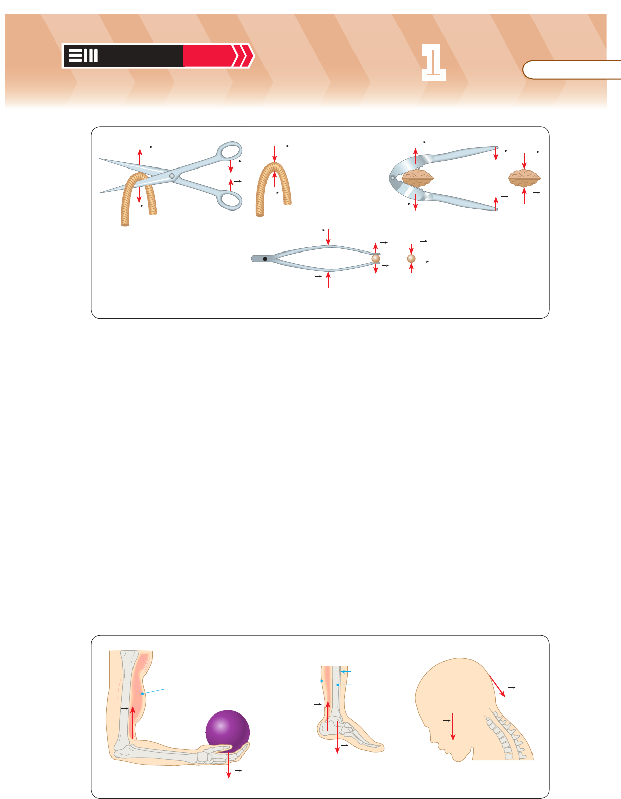 Física os Fundamentos da Física Moderna plus ramalho nicolau toledo w w w .m o d e rn a p lu s .c o m .b r 21 Parte III Unidade G Capítulo 19 equilíbrio dos corpos extensos A necessidade de existir um ponto de apoio para que uma alavanca possa funcionar está expressa na famosa frase atribuída ao grande sábio grego Arquimedes: “Dê-me um ponto de apoio e moverei o mundo”. alavancas no corpo humano As alavancas que existem no corpo humano são formadas pelos ossos, sen- do os músculos responsáveis pelas forças potentes. Vamos descrever algumas dessas alavancas. O antebraço é uma alavanca interpotente. O peso do corpo sustentado pela mão é a força resistente F r R; a força potente F r p é exercida pelo músculo bíceps. O ponto de apoio A é o cotovelo. O pé é uma alavanca inter-resistente quando estamos erguendo o corpo, ficando na ponta do pé. O peso do nosso corpo, transmitido através dos ossos tíbia e fíbula, é a força resistente F r R; a força potente F r p é exercida pelos mús- culos gêmeos, que formam a barriga da perna. Esses músculos prendem-se ao calcanhar pelo tendão calcâneo. O ponto de apoio A é a ponta do pé. A cabeça é uma alavanca interfixa quando a inclinamos para trás ou para a frente. O peso da cabeça é a força resistente F r R; a força potente F r p é exercida pelos músculos do pescoço. A articulação da cabeça com a coluna vertebral define o ponto de apoio A. Bíceps A Fíbula TíbiaMúsculos gêmeos A A Fp FR Fp FR FR Fp A Interfixa: tesoura A Inter-resistente: quebra-nozes FR Fp F’p –F’R –FR FR Fp –FR F’R F’R F’p –F’R Interpotente: pinça A Fp FR –FR F’p F’R –F’R Física os Fundamentos da Física Moderna plus ramalho nicolau toledo 3 w w w .m o d e rn a p lu s .c o m .b r 1 Parte III Unidade G Capítulo 19 equilíbrio dos corpos extensos teste sua leitura A FR Fp A FR Fp FR A Fp A FR Fp A FR Fp Bíceps Osso do braço Ossos do antebraço Cotovelo M d a d a F C P Fp FR A B L.33 (Unicamp-SP) O bíceps é um dos músculos envolvidos no processo de dobrar nossos braços. Esse músculo funciona num sistema de alavanca como é mostrado na figura abaixo. O simples ato de equilibrarmos um objeto na palma da mão, estando o braço em po- sição vertical e o antebraço em posição ho- rizontal, é o resultado de um equilíbrio das seguintes forças: o peso P do objeto, a força F que o bíceps exerce sobre um dos ossos do antebraço e a força C que o osso do bra- ço exerce sobre o cotovelo. A distância do cotovelo até a palma da mão é a 5 0,30 m e a distância do cotovelo ao ponto em que o bíceps está ligado a um dos ossos do ante- braço é de d 5 0,04 m. O objeto que a pes- soa está segurando tem massa M 5 2,0 kg. Despreze o peso do antebraço e da mão. Use g 5 10 m/s2. a) Determine a força F que o bíceps deve exer- cer no antebraço. b) Determine a força C que o peso do braço exerce nos ossos do antebraço. L.31 Considere a associação de polias esquemati- zada na figura. Os fios e as polias são supos- tos ideais e a barra AB tem peso desprezível. O peso da carga é de 600 N (intensidade da força resistente: FR 5 600 N). Determine: a) a intensidade da força potente Fp aplicada pelo operador para manter o sistema em equilíbrio; b) a vantagem mecânica da associação. L.32 Classifique cada alavanca em interfixa, inter- potente ou inter-resistente. a) d) b) e) c) Física os Fundamentos da Física Moderna plus 1 ramalho nicolau toledo w w w .m o d e rn a p lu s .c o m .b r 1 Parte III Unidade G Capítulo 20 hidrostática Estudo do teorema de Arquimedes Faça uma bola com massa de modelar e coloque-a em um recipiente contendo água. Verifique que ela afunda. Em seguida, pegue a bola e molde-a no formato de um barquinho. Coloque o “barquinho” na água do recipien te. Verifique que ele flutua. Atividade experimental Realize a experiência com supervisão do seu professor responda Por que a mesma quantidade de massa de modelar afundou num caso e • flutuou no outro? O empuxo variou de uma situação para outra? Por quê?• Em qual (ou quais) das situações o peso e o empuxo têm a mesma • intensidade? E d u a r d o s a n ta li E s t r a /c id E d u a r d o s a n ta li E s t r a /c id