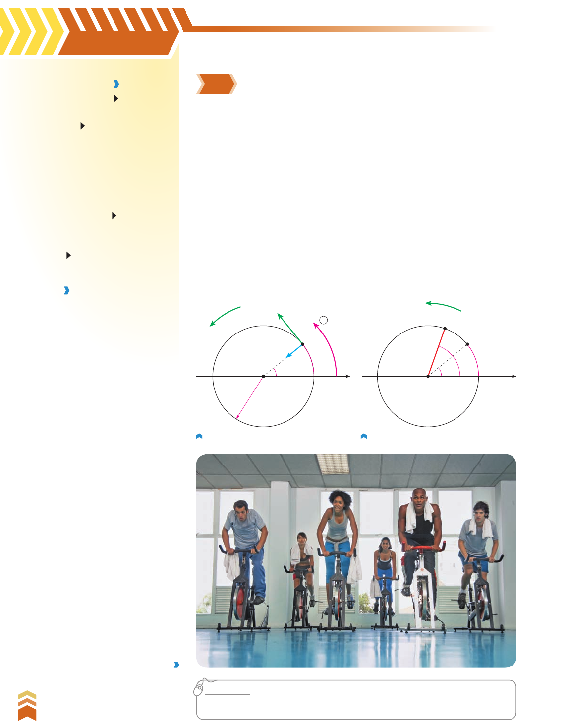 388 U n id a d e F • O n d a s 388 R ep ro d uç ão p ro ib id a. A rt .1 84 d o C ód ig o P en al e L ei 9 .6 10 d e 19 d e fe ve re iro d e 19 98 . Objetivos Relacionar o MHS e o MCU. Definir as funções cinemáticas (função horária, função da velocidade, função da aceleração) no MHS a partir da sua relação com o MCU. Analisar os gráficos das funções cinemáticas do MHS. Compreender o que é fase inicial no MHS. Termos e conceitos • pulsação • elongação • fase inicial Seção 16.3 1 O MHS e o movimento circular uniforme O MHS e o movimento circular uniforme (MCU) estão relacionados, de modo que um pode ser estudado por meio do outro. Esse estudo possibilita-nos chegar às equações cinemáticas do MHS. Assim, seja o ponto P em MCU na circunferência de raio R. Os espaços s são me didos na própria circunferência (fig. 7) e os espaços angulares A são os ângulos centrais que de ter minam os arcos s. O ponto descreve a circun- ferência com velocidade escalar v e velocidade angular h; a aceleração centrípeta acp é orientada para o centro. Se os ângulos A estão em radia- nos (reveja Volume 1, Capítulo 10), temos: s AR v hR acp v2 __ R h2R Considere que, no instante inicial t 0, o espaço inicial seja s0 (e A0, o espaço angular inicial), conforme a figura 8. A função horária do MCU é: s s0 vt ou A A0 ht (na forma angular) Funções horárias e gráficos do MHS x ϕ s + P acp ω O R v Figura 7. ϕ0 s0 P0 (t = 0) ω O P (t ) ϕ x Figura 8. No endereço eletrônico http://www.phy.ntnu.edu.tw/oldjava/portuguese/ mecanica/shm/shm.html (acesso em agosto/2009) você encontra animações que ilustram a relação entre o MHS e o MCU. Entre na redeEntre na rede Quando observamos frontalmente uma pessoa na bicicleta ergométrica, vemos que seus pés parecem apenas subir e descer, fato que nos leva a perceber a relação entre o MCU e o MHS. V2_P3_UN_F_CAP_16a.indd 388 02.09.09 09:14:10 389 C a p ít u lo 1 6 • M o vi m e n to h a rm ô n ic o s im p le s (M H S ) 389 R ep ro d uç ão p ro ib id a. A rt .1 84 d o C ód ig o P en al e L ei 9 .6 10 d e 19 d e fe ve re iro d e 19 98 . 2 Função horária do MHS Seja, agora, o ponto Q projeção ortogonal de P no eixo orientado Ox (fig. 9). Enquanto o ponto P descreve a circunferência em MCU, o ponto Q se move num e noutro sentido no diâ me tro horizon- tal orien tado Ox. A posição de Q no eixo Ox é dada pela abscissa x, que pode ser obtida no triân gulo destacado OPQ pela de finição do cosseno: x R 3 cos A A abscissa x, que define a posição do ponto Q, é chamada elongação. Enquanto P descreve um MCU, o ponto Q oscila no diâmetro com um movimento não uni- for me, cuja função horária é cossenoidal. Movimentos com fun ção horária idêntica à anterior são movimentos harmônicos simples, como iremos demonstrar no item 4, ao analisarmos a ace le ra ção e o tipo de força que gera o movimento. Assim, P descreve a circunferência com MCU e Q oscila em torno de O com MHS. A velo- cidade angular h do MCU é, no MHS, denominada pulsação ou frequência angular e ex pres sa em radianos por segundo (rad/s). O período T do MCU é o mesmo do MHS, pois a cada volta completa de P na circunferência corresponde uma oscilação completa de Q no diâmetro ho- rizontal. Po de mos, então, escrever: h 2s ___ T ou T 2s ___ h 3 Função da velocidade escalar do MHS A velocidade de Q em MHS pode ser obtida a partir da velocidade de P em MCU (fig. 10). No tri- ângulo destacado ABP da figura 10, a velocidade v de Q é a projeção da velocidade do ponto P (vP) no eixo Ox. Como o sentido dessa velocidade é con- trário ao sentido positivo de Ox, acrescentamos o sinal menos (): v vP 3 sen A v ha 3 sen (A0 ht) ] v ha 3 sen (ht A0) Figura 9. ϕ ω O P x Q R = a R x x a 3 cos A a 3 cos (A0 ht) ] x a 3 cos (ht A0) Figura 10. x ϕ O P v Q vp = ωR x ϕ vB A Sendo R a, isto é, o raio da circunferência igual à amplitude a, temos: x a 3 cos A. O ângulo A é o espaço angular do ponto P que rea liza MCU. Sendo A A0 ht, resulta: Como vP hR ou vP ha e A A0 ht, obtemos: V2_P3_UN_F_CAP_16a.indd 389 02.09.09 09:14:11 390 U n id a d e F • O n d a s 390 R ep ro d uç ão p ro ib id a. A rt .1 84 d o C ód ig o P en al e L ei 9 .6 10 d e 19 d e fe ve re iro d e 19 98 . 4 Função da aceleração escalar do MHS A aceleração de Q em MHS pode ser obtida a partir da aceleração centrípeta de P em MCU (fig. 12). No triângulo des- tacado da figura 12, a aceleração a de Q é a projeção de acp no eixo Ox. Como o sentido dessa aceleração é contrário ao sentido positivo de Ox, acrescentamos o sinal menos (): a acp 3 cos A Como acp h2R ou acp h2a e A A0 ht, obtemos: A fórmula , x a 3 cos (ht A0), substituída em nos conduz a: a h2x Como a velocidade angular h é constante, podemos afirmar: A aceleração no MHS é proporcional à abscissa que define a posição e tem sinal contrário ao desta abscissa. Sendo assim, quando x é positivo, a é negativo (ponto Q na figura 12) e, quando xe é negativo, ae é positivo (ponto Qe na figura 12). Na posição de equilíbrio, temos: • x 0 e a 0 Nos pontos de inversão do movimento: Nesses dois pontos a aceleração assume módulo máximo, ou seja: OaOmáx. h2a Figura 12. xO acp = ω2R acp Q' Qα' ϕ α xx' PP' A B xO P v ϕ = — radπ 2 vp O P v vp ϕ = –— rad3π 2 x Quando o ponto Q passa pela posição de equilíbrio O, podemos ter: • A s __ 2 rad (fig. 11A); como @ sen s __ 2 1 # , vem: v ha • A 3s ___ 2 rad (fig. 11B); como @ sen 3s ___ 2 1 # , vem: v ha Portanto, em O, a velocidade escalar assume os valores: Na posição O, o módulo da velocidade é máximo: OvOmáx. ha v ! ha A Figura 11. B a h2a 3 cos (A0 ht) ] a h2a 3 cos (ht A0) • x a e a h2a (valor mínimo) • x a e a h2a (valor máximo) V2_P3_UN_F_CAP_16a.indd 390 02.09.09 09:14:12