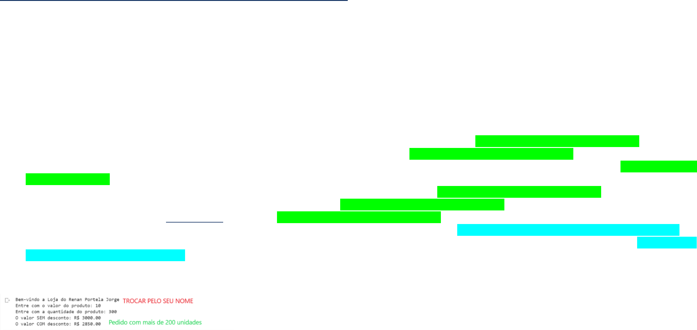QUESTÃO 1 de 4 - Conteúdo até Aula 03 Enunciado: Imagina-se que você é um dos programadores responsáveis pela construção de app de vendas para uma determinada empresa X que vende em atacado. Uma das estratégias de vendas dessa empresa X é dar desconto maior conforme o valor da compra, conforme a listagem abaixo: • Se valor for menor que 2500 o desconto será de 0%; • Se valor for igual ou maior que 2500 e menor que 6000 o desconto será de 4%; • Se valor for igual ou maior que 6000 e menor que 10000 o desconto será de 7%; • Se valor for igual ou maior que 10000 o desconto será de 11%; Elabore um programa em Python que: A. Deve-se implementar o print com uma mensagem de boas-vindas que apareça o seu nome [EXIGÊNCIA DE CÓDIGO 1 de 6]; B. Deve-se implementar o input do valor unitário e da quantidade do produto [EXIGÊNCIA DE CÓDIGO 2 de 6]; C. Deve-se implementar o desconto conforme a enunciado acima (obs.: atente-se as condições de menor, igual e maior) [EXIGÊNCIA DE CÓDIGO 3 de 6]; D. Deve-se implementar o valor total sem desconto e o valor total com desconto [EXIGÊNCIA DE CÓDIGO 4 de 6]; E. Deve-se implementar as estruturas if, elif e else (todas elas) [EXIGÊNCIA DE CÓDIGO 5 de 6]; F. Deve-se inserir comentários relevantes no código [EXIGÊNCIA DE CÓDIGO 6 de 6]; G. Deve-se apresentar na saída de console uma mensagem de boas-vindas com seu nome [EXIGÊNCIA DE SAÍDA DE CONSOLE 1 de 2]; H. Deve-se apresentar na saída de console um pedido recebendo desconto (valor total sem desconto maior ou igual a 2500) [EXIGÊNCIA DE SAÍDA DE CONSOLE 2 de 2]; EXEMPLO DE SAÍDA DE CONSOLE: Figura 1: Exemplo de saída de console que o aluno deve fazer. Em que se perguntar o valor do produto (pode ser qualquer valor) a quantidade (pode ser qualquer valor) o resultado da multiplicação produto pela quantidade deve ser maior que 2500 para que haja desconto. Apresentação de Código da Questão 1: SUBSTITUIR ESSE TEXTO QUE ESTÁ EM VERMELHO PELO SEU CÓDIGO DO EXERCÍCIO 1. NÃO ESQUECER DE CUMPRIR AS EXIGÊNCIAS DE CÓDIGO!! O CÓDIGO DEVE ESTAR IDENTADO!! SERÃO ACEITOS SOMENTE CÓDIGOS NO FORMATO TEXTO (NADA DE IMAGEM NEM PRINT, ZERA A QUESTÃO!). Apresentação de Saída do Console da Questão 1: SUBSTITUIR ESSE TEXTO QUE ESTÁ EM LARANJA PELA A SAÍDA DO CONSOLE DO EXERCÍCIO 1 NÃO ESQUECER DE CUMPRIR AS EXIGÊNCIAS SERÁ ACEITO SOMETE SAÍDAS DO CONSOLE NO FORMATO IMAGEM (NADA DE TEXTO AQUI! ZERA ESSA PARTE DA QUESTÃO!) QUESTÃO 2 de 4 - Conteúdo até aula 04 Enunciado: Você e sua equipe de programadores foram contratados para desenvolver um app de vendas para uma loja que vende Açaí e Cupuaçu. Você ficou com a parte de desenvolver a interface do cliente para retirada do produto. A Loja possui seguinte relação: • Tamanho P de Cupuaçu (CP) custa 9 reais e o Açaí (AC) custa 11 reais; • Tamanho M de Cupuaçu (CP) custa 14 reais e o Açaí (AC) custa 16 reais; • Tamanho G de Cupuaçu (CP) custa 18 reais e o Açaí (AC) custa 20 reais; Elabore um programa em Python que: A. Deve-se implementar o print com uma mensagem de boas-vindas que apareça o seu nome [EXIGÊNCIA DE CÓDIGO 1 de 8]; B. Deve-se implementar o input do sabor (CP/AC) e o print “Sabor inválido. Tente novamente" se o usuário entra com valor diferente de CP e AC [EXIGÊNCIA DE CÓDIGO 2 de 8]; C. Deve-se implementar o input do tamanho (P/M/G) e o print “Tamanho inválido. Tente novamente" se o usuário com entra valor diferente de P, M ou G [EXIGÊNCIA DE CÓDIGO 3 de 8]; D. Deve-se implementar if, elif e/ou else com cada uma das combinações de sabor e tamanho [EXIGÊNCIA DE CÓDIGO 4 de 8]; E. Deve-se implementar um acumulador para somar os valores dos pedidos [EXIGÊNCIA DE CÓDIGO 5 de 8]; F. Deve-se implementar o input com a pergunta: “Deseja pedir mais alguma coisa?”. Se sim repetir a partir do item B, senão encerrar o programa executar o print do acumulador [EXIGÊNCIA DE CÓDIGO 6 de 8]; G. Deve-se implementar as estruturas de while, break, continue (todas elas) [EXIGÊNCIA DE CÓDIGO 7 de 8]; H. Deve-se inserir comentários relevantes no código [EXIGÊNCIA DE CÓDIGO 8 de 8]; I. Deve-se apresentar na saída de console uma mensagem de boas-vindas com o seu nome [EXIGÊNCIA DE SAÍDA DE CONSOLE 1 de 4]; J. Deve-se apresentar na saída de console um pedido em que o usuário errou o sabor [EXIGÊNCIA DE SAÍDA DE CONSOLE 2 de 4]; K. Deve-se apresentar na saída de console um pedido em que o usuário errou o tamanho [EXIGÊNCIA DE SAÍDA DE CONSOLE 3 de 4]; L. Deve-se apresentar na saída de console um pedido com duas opções sabores diferentes e com tamanhos diferentes [EXIGÊNCIA DE SAÍDA DE CONSOLE 4 de 4]; EXEMPLO DE SAÍDA DE CONSOLE: Figura 2: Exemplo de saída de console que o aluno deve fazer. Em que se perguntar o sabor ao tamanho. Há uma tentativa de pedido que se erro o sabor e outra que se errou o tamanho. Há também dois pedidos com sabores e tamanhos. Apresentação de Código da Questão 2: Apresentação de Saída do Console da Questão 2: SUBSTITUIR ESSE TEXTO QUE ESTÁ EM LARANJA PELA A SAÍDA DO CONSOLE DO EXERCÍCIO 2 NÃO ESQUECER DE CUMPRIR AS EXIGÊNCIAS SERÁ ACEITO SOMETE SAÍDAS DO CONSOLE NO FORMATO IMAGEM (NADA DE TEXTO AQUI! ZERA ESSA PARTE DA QUESTÃO!) QUESTÃO 3 de 4 - Conteúdo até aula 05 Enunciado: Você foi contratado para desenvolver um sistema de cobrança de serviços de uma copiadora. Você ficou com a parte de desenvolver a interface com o funcionário. A copiadora opera da seguinte maneira: • Serviço de Digitalização (DIG) o custo por página é de um real e dez centavos; • Serviço de Impressão Colorida (ICO) o custo por página é de um real; • Serviço de Impressão Preto e Branco (IPB) o custo por página é de quarenta centavos; • Serviço de Fotocópia (FOT) o custo por página é de vinte centavos; • Se número de páginas for menor que 20 retornar o número de página sem desconto; • Se número de p