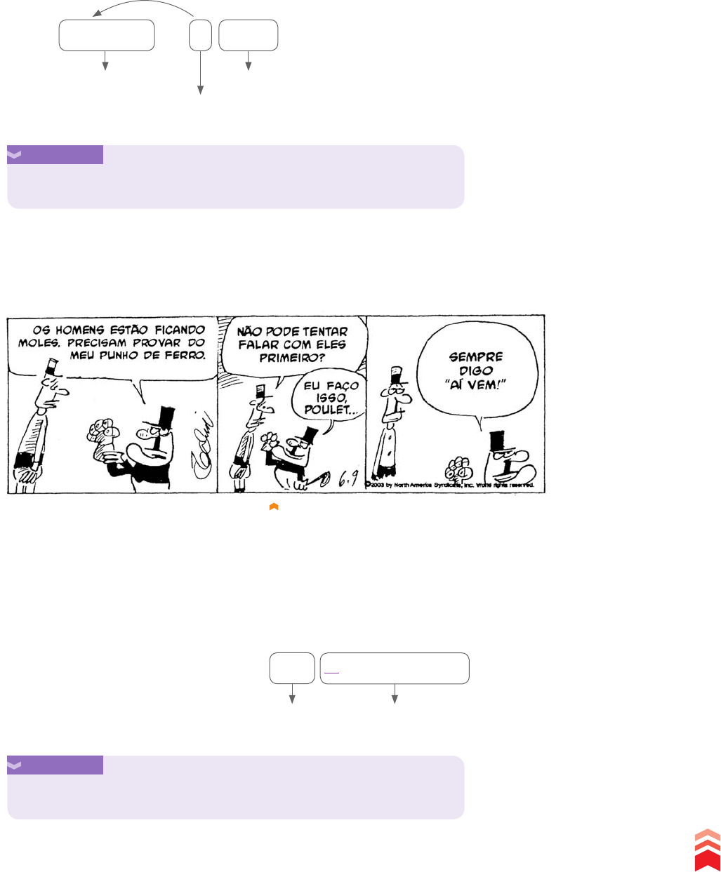 Objeto direto preposicionado Observe a tira abaixo. O verbo provar é transitivo direto. Deve, portanto, receber um com- plemento que se ligue a ele sem o auxílio de preposição. Em algumas construções sintáticas, porém, observamos a presença de objetos di- retos precedidos por uma preposição. o caso da fala do comandante Crock no primeiro quadrinho. objeto direto preposicionado “Os homens estão ficando moles. Precisam provar do meu punho de ferro.” VTD A LEGIÃO Bill echin & Don Wilder objeto direto do verbo comprar objeto direto pleonástico Aqueles livros, eu os comprei na livraria do shopping. VTD Alguns dos casos em que verbos transitivos diretos recebem objeto direto preposicionado são os seguintes: Objeto direto pleonástico Em alguns casos de complementação de verbos transitivos diretos, observamos que a ideia introduzida pelo objeto do verbo é retomada, na mesma oração, por um pronome oblíquo. Veja. EC IN, Bill & WILDER,!Don. A Legião. Jornal da Tarde. São Paulo, 26 set. 2003. Tome nota Objeto direto pleonástico é o que aparece repetido, sob a forma de um pronome oblíquo, no interior de uma mesma oração. Tome nota Objeto direto preposicionado é o objeto direto que se liga a um verbo transitivo direto por meio de uma preposição. 397 C ap ít u lo 2 2 • S in ta xe d o pe rí od o si m pl es R ep ro du çã o pr oi bi da . A rt . 1 84 d o C ód ig o P en al e L ei 9 .6 10 d e 19 d e fe ve re iro d e 19 98 . I_plus_gramatica_cap22_C.indd 397 10/12/10 5:02:51 PM Objeto indireto• Observe a tira. O verbo gostar precisa de um complemento que lhe integre o sentido. No exemplo acima, observa-se que o complemento (“do outono”) liga-se a esse verbo por meio da preposição de (do: de o). , portanto, um objeto indireto. Objeto indireto pleonástico Assim como ocorre com alguns verbos transitivos diretos, também encontramos casos em que o objeto de verbos transitivos indiretos ou bi- transitivos é retomado, na mesma oração, por um pronome oblíquo. Nesses casos, dizemos que ocorre um objeto indireto pleonástico. Veja. objeto indireto do verbo dar objeto indireto pleonástico Aos meus apelos, não lhes davam ouvidos. TDI objeto direto do verbo dar (O pronome oblíquo lhes retoma o objeto indireto aos meus apelos.) MACANUDO Liniers • Quando o objeto de determinados verbos transitivos diretos vem ex- presso por um dos pronomes pessoais t nicos mim, ti, si, ele(s), ela(s). Se eu pagar a conta, corro o risco de ofender a ela. • Quando o objeto de determinados verbos transitivos diretos é o nome próprio Deus. Mandam os preceitos da igreja que todos amem a Deus. • Quando o objeto direto é um pronome substantivo demonstrativo, indefinido ou interrogativo. Apreciei mais a este. O jornalista ofendeu a todos. A quem amas? • Quando é necessário desfazer uma ambiguidade. Na Copa do Mundo de 2002, venceram aos turcos os brasileiros. Complementos verbais Objeto direto: liga-se diretamente ao verbo. Objeto indireto: liga-se ao verbo através de preposição. LINIERS. Macanudo, N. 3. Campinas: Zarabatana Books, 2010. p. 63. Tome nota Objeto indireto é o termo da oração que integra o sentido dos verbos tran- sitivos indiretos. Tais objetos vinculam-se indiretamente aos verbos através de uma preposição. 398 U n id ad e 5 • S in ta xe : e st ud o da s re la çõ es e nt re a s pa la vr as R ep ro du çã o pr oi bi da . A rt . 1 84 d o C ód ig o P en al e L ei 9 .6 10 d e 19 d e fe ve re iro d e 19 98 . I_plus_gramatica_cap22_C.indd 398 10/12/10 5:02:52 PM Na tira, Frank reage ao encontrar uma placa especificando várias proibi- ções e pergunta ao amigo: “Ei, a gente não veio pra cá em busca da sensação de liberdade?”. O substantivo busca, nesse caso, necessita de um comple- mento que lhe integre o sentido, especificando-o. A expressão da sensação funciona, portanto, como complemento nominal. Essa expressão, por sua vez, contém um substantivo sensação que também necessita ter seu sentido especificado. A expressão de liberdade atua como complemento nominal desse substantivo. Complemento nominal Alguns nomes e advérbios, da mesma forma que os verbos, podem exigir um complemento para integrar o seu sentido. Observe. Veja exemplos em que os adjetivos e os advérbios têm seu sentido integrado por complementos nominais. Esses exemplos demonstram que os complementos nominais mantêm com os nomes o mesmo tipo de relação que os complementos verbais mantêm com os verbos transitivos. importante não se esquecer de que os nomes derivados de verbos transitivos conservam o princípio de transitividade desses verbos, ou seja, também precisam de termos (complementos nominais) que lhes integrem o sentido. Compare. VTI Confio nos meus amigos. objeto indireto substantivo A confiança nos amigos é uma característica das pessoas sinceras. complemento nominal advérbio Nossas previsões relativamente ao resultado das provas confirmaram-se. complemento nominal adjetivo As observações referentes às redações estão anotadas na margem. complemento nominal FRANK & ERNEST Bob Thaves Complemento nominal Termo da oração que integra o sentido de certos nomes (substantivos e adjetivos) e advérbios. Ligado por preposição ao termo cujo sentido complementa. T AVES, Bob. Frank & Ernest. São Paulo: Devir, 2009. p. 27. Tome nota Complemento nominal é o termo da oração que integra o sentido de cer- tos nomes (substantivos e adjetivos) e advérbios, es- pecificando-os. Sua relação com o termo cujo sentido complementa é feita por meio de uma preposição. 399 C ap ít u lo 2 2 • S in ta xe d o pe rí od o si m pl es R ep ro du çã o pr oi bi da . A rt . 1 84 d o C ód ig o P en al e L ei 9 .6 10 d e 19 d e fe ve re iro d e 19 98 . I_plus_gramatica_cap22_C.indd 399 10/12/10 5:02:53 PM