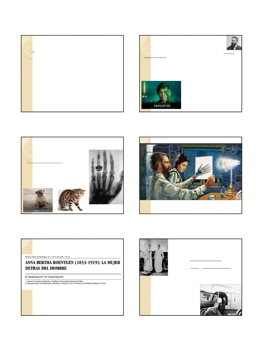 20/08/2023 1 Profª.Ariana Gayer Ferro Agosto / 2023 Disciplina de Diagnóstico Por Imagem Conceitos básicos e Anatomia Radiológica em Pequenos Animais e Radioproteção Faculdade de Medicina Veterinária Profª.Ariana Gayer Ferro Agosto / 2023 HISTÓRIA DA RADIOLOGIA Ao final do século 19 (1895), o Professor físico alemão, Wilhelm Conrad Röntgen, aos 50 anos de idade, descobriu acidentalmente os raios x. Prêmio Nobel de Física em 1901. Raio X – interage com os átomos do objeto; Não ultrapassa átomos mais pesados; Radiação ionizante – mutação direta e indireta com DNA de células; • 1898 - Marie Currie – Descobriu a radioatividade; • Primeira mulher a ganhar prêmio Nobel; • primeira pessoa e a única mulher a ganhá-lo duas vezes: Física e Química. Profª.Ariana Gayer Ferro Agosto / 2023 RADIOLOGIA Anna Bertha Roentgen, esposa de Wilhelm Conrad Röntgen; 20 minutos para realização da imagem. Profª.Ariana Gayer Ferro Agosto / 2023 Profª.Ariana Gayer Ferro Agosto / 2023 Profª.Ariana Gayer Ferro Agosto / 2023 Durante a Primeira Guerra Mundial desenvolveu unidades de radiografia móvel para fornecer serviços de raio-X a hospitais de campanha. Importantes para o tratamento de ferimentos de balas e fraturas. Marie Curie Leucemia - exposição à radiação durante sua pesquisa científica e seu trabalho radiológico em hospitais de campanha. 1 2 3 4 5 6 20/08/2023 2 Profª.Ariana Gayer Ferro Agosto / 2023 Profª.Ariana Gayer Ferro Agosto / 2023 O QUE FALTAVA? Profª.Ariana Gayer Ferro Agosto / 2023 COMPRIMENTO DE ONDA Profª.Ariana Gayer Ferro Agosto / 2023 Produção de raios x Elétrons em altas velocidades; Ocorrem em um tubo de Raios X. Profª.Ariana Gayer Ferro Agosto / 2023 CONCEITOS BÁSICOS DE RADIOLOGIA Radiografia é o registro produzido pela passagem de Raios X por corpos e estruturas; É uma arte por requerer prática e experiência para alcançar a habilidade necessária. Profª.Ariana Gayer Ferro Agosto / 2023 Obtenção da radiografia 7 8 9 10 11 12 20/08/2023 3 Profª.Ariana Gayer Ferro Agosto / 2023 SALA DE RADIOLOGIA Profª.Ariana Gayer Ferro Agosto / 2023 Profª.Ariana Gayer Ferro Agosto / 2023 Representação Esquemática de uma Ampola de RX mA (miliamperagem) – quantidade de raios; kV – penetração do RX; Tempo. Profª.Ariana Gayer Ferro Agosto / 2023 Representação Esquemática de uma Ampola de RX mA (miliamperagem). Função de aquecer o filamemento para produção de elétrons através da ionização do átomo de tungstênio. Ionização de átomo? Ocorre sempre que um átomo ganha ou perda elétrons através de calor ou radiação. kV – penetração do RX; Tempo. Profª.Ariana Gayer Ferro Agosto / 2023 mA (miliamperagem) Preparo mA adicionado Passa pelo filamento Ionização átomos de tungstênio Calor desprende os elétrons da órbita mais externa do átomo O mA é responsável pela produção de elétrons dentro da ampola. Logo, quanto mais mA, mais rx será produzido. Profª.Ariana Gayer Ferro Agosto / 2023 13 14 15 16 17 18 20/08/2023 4 Profª.Ariana Gayer Ferro Agosto / 2023 Formação da Imagem Radiográfica A imagem radiográfica é formada por uma reação física. Ao realizar o preparo do equipamento é acionado o lado negativo da ampola (mA), a qual é responsável por aquecer o filamento e produzir elétrons pela ionização dos átomos de tungstênio Cada fez ocorre a perda ou ganho ganha de elétrons, ocorre a ionização dos átomos de tungstênio, desprendendo (ionizando) os átomos de sua forma mais externa. Desprende os átomos A ionização de um átomo pode ocorrer por calor ou por radiação. Profª.Ariana Gayer Ferro Agosto / 2023 O disparo do equipamento se dá no lado positivo da ampola (kV). Formação da Imagem Radiográfica Profª.Ariana Gayer Ferro Agosto / 2023 kV (kilovolagem) Disparo kV adicionado e passa pelo filamento Elétrons atraídos para o lado positivo da ampola (ânodo) Elétrons se chocam no ânodo em alta velocidade Reagem com átomo de tungstênio do lado positivo (ponto focal) Produção de dois tipos de radiação O kV é responsável pela aceleração dos elétrons Logo, quanto maior p kV maior a acelaração do elétron, mais a penetração do rx. Profª.Ariana Gayer Ferro Agosto / 2023 Produção de dois tipos de radiação Radiação de frenagem (elétron acelerado, encontra o núcleo e desvia sua trajetória) – nesse desvio perde energia em forma de rx e calor. Radiação característica, que levam esse nome por ser características do rx, que ocorre quando um elétron colide com átomo do ânodon, “espirra” esse elétron do átomo do ânodon para fora e o elétron que está mais próximo salta para ocupar o espaço do elétron daquele que foi espirrado e nesse momento ocorre produção de rx e calor. Profª.Ariana Gayer Ferro Agosto / 2023 Como calcular a técnica radiográfica? Se o kV é responsável pela penetração, dos raios-x, ele será modulado de agora com a espessura da estrutura radiografada. E = Espessura C = Contraste do equipamento (cerca de 20 a 40) kV = E x 2 + (C) Profª.Ariana Gayer Ferro Agosto / 2023 19 20 21 22 23 24 20/08/2023 5 Profª.Ariana Gayer Ferro Agosto / 2023 Profª.Ariana Gayer Ferro Agosto / 2023 Quanto maior o peso atômico, mais dificuldade terão os raios de ultrapassar o corpo; Quanto maior a espessura, mais dificuldade terá a radiação de ultrapassar o corpo; Maior densidade da matéria requer maior capacidade de penetração dos raios. Profª.Ariana Gayer Ferro Agosto / 2023 DENSIDADE E OPACIDADE Profª.Ariana Gayer Ferro Agosto / 2023 mA – responsável pela quantidade de rx; Aumento o contraste da imagem. Escala de contraste curta. Técnica radiográfica Profª.Ariana Gayer Ferro Agosto / 2023 kV – responsável pela penetração do RX; Diminui o contraste da imagem – escala de cinzas. Técnica radiográfica Profª.Ariana Gayer Ferro Agosto / 2023 25 26 27 28 29 30 20/08/2023 6 Profª.Ariana Gayer Ferro Agosto / 2023 Técni