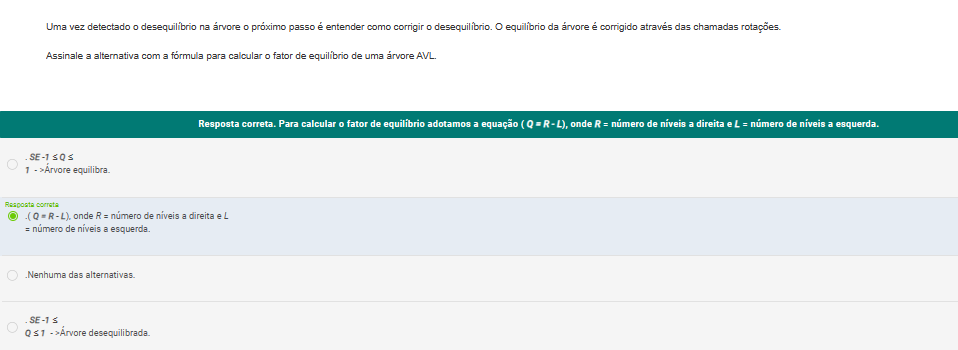Uma vez detectado o desequilíbrio na árvore o próximo passo é entender como corrigir o desequilíbrio. O equilíbrio da árvore é corrigido através das chamadas rotações. Assinale a alternativa com a fór