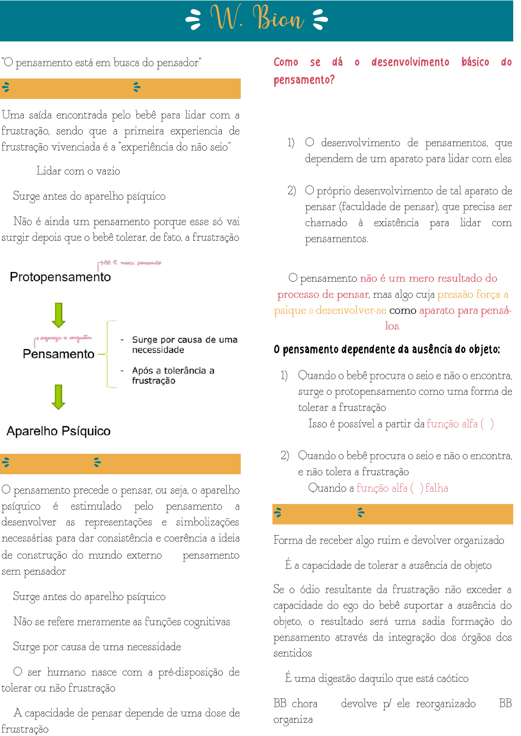 Protopensamento • ➽ ➽ Pensamento ➺ ➽ ➽ ➽ ➽ ➽ O pensar é resultante de dois processos mentais: • α • α Funcao Alfa ➽ ➽ ➺ ➺ elementos Alfa ➽ ➽ protopensamento elementos Beta β ➺ Os elementos Beta são armazenados não como forma de memória, mas como fatos não digeridos • Reverie α . • α β α α β