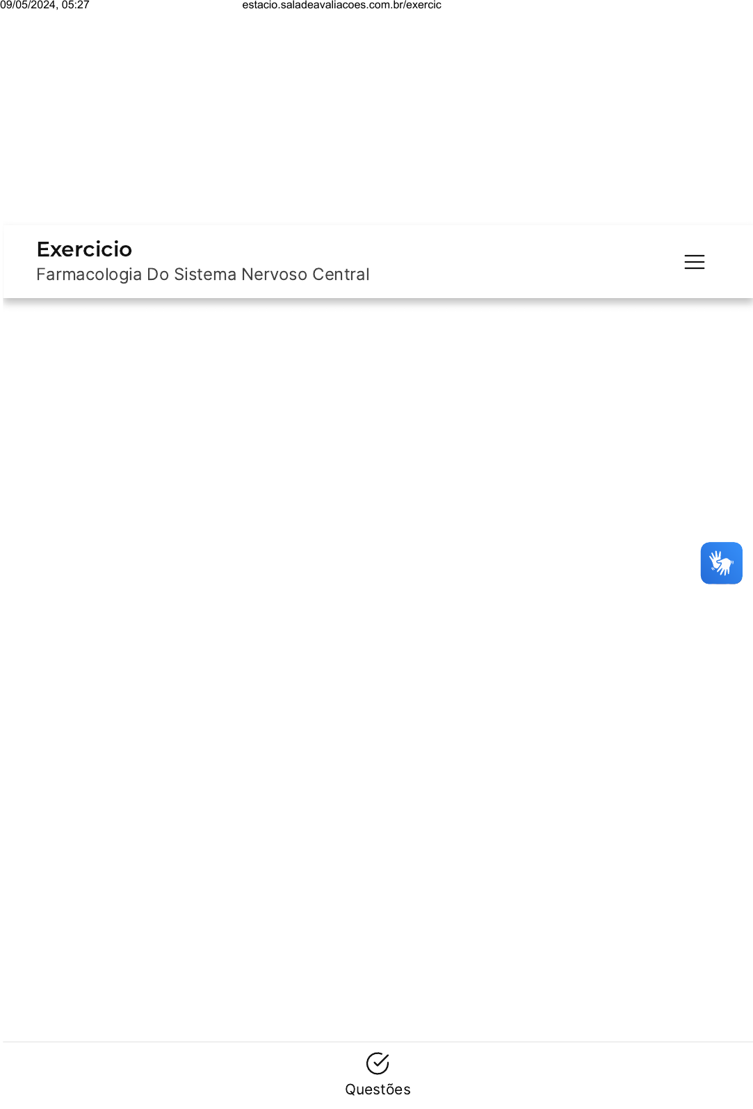 Questões Exercicio Farmacologia Do Sistema Nervoso Central 09/05/2024, 05:27 estacio.saladeavaliacoes.com.br/exercicio/663c8784139d33d9149d8a01/gabarito/ https://estacio.saladeavaliacoes.com.br/exercicio/663c8784139d33d9149d8a01/gabarito/ 1/11 Você acertou 6 de 10 questões Verifique o seu desempenho e continue treinando! Você pode refazer o exercício quantas vezes quiser. Verificar Desempenho A B C D E 1 Marcar para revisão O Fenobarbital, derivado do ácido barbitúrico e mais antigo anticonvulsivante, tem como mecanismo de ação: Bloquear canais de sódio ativados por voltagem Bloquear canais de cálcio ativados por voltagem Bloqueio dos receptores do tipo GABA�A Ativando receptores do tipo GABA�A Ativando canais de sódio ativados por voltagem Resposta incorreta Opa! A alternativa correta é a letra D. Confira o gabarito comentado! Gabarito Comentado O Fenobarbital, que é um anticonvulsivante, atua ativando os receptores do tipo GABA�A. O GABA (ácido gama-aminobutírico) é um neurotransmissor inibitório do sistema nervoso central. Quando o Fenobarbital ativa os 09/05/2024, 05:27 estacio.saladeavaliacoes.com.br/exercicio/663c8784139d33d9149d8a01/gabarito/ https://estacio.saladeavaliacoes.com.br/exercicio/663c8784139d33d9149d8a01/gabarito/ 2/11 A B C D E receptores GABA�A, ele aumenta a inibição neuronal, o que pode ajudar a prevenir convulsões. Portanto, a alternativa correta é a "D� Ativando receptores do tipo GABA�A". 2 Marcar para revisão Os antipsicóticos são fármacos amplamente utilizados no tratamento dos transtornos psiquiátricos. Em relação aos antipsicóticos, assinale a alternativa correta. A clorpromazina é um antipsicótico típico de alta potência, com redução na atividade dopaminérgica Alucinações, delírios, fala desorganizada e comportamento desorganizado ou agitado compreendem sintomas negativos Os sintomas positivos são apatia, avolição, alogia. Os sintomas positivos da esquizofrenia decorrem da hiperatividade na via serotoninérgica mesocortical Os antipsicóticos atípicos podem exercer um antagonismo simultâneo dos receptores de serotonina 5HT2A e agonismo dos receptores de dopamina D2 Resposta incorreta Opa! A alternativa correta é a letra E. Confira o gabarito comentado! Gabarito Comentado A alternativa correta é a letra E. Os antipsicóticos atípicos têm a capacidade de exercer um antagonismo simultâneo dos receptores de serotonina 5HT2A e agonismo dos receptores de dopamina D2. Isso significa que eles podem bloquear a ação da serotonina em certos receptores (antagonismo) e ao mesmo tempo aumentar a atividade da 09/05/2024, 05:27 estacio.saladeavaliacoes.com.br/exercicio/663c8784139d33d9149d8a01/gabarito/ https://estacio.saladeavaliacoes.com.br/exercicio/663c8784139d33d9149d8a01/gabarito/ 3/11 A B C D E dopamina em outros receptores (agonismo). Essa ação combinada é uma das características que diferenciam os antipsicóticos atípicos dos típicos e contribui para a sua eficácia no tratamento de transtornos psiquiátricos. 3 Marcar para revisão Qual dos seguintes medicamentos ansiolíticos é um agonista parcial dos receptores 5�HT1A e é eficaz após o tratamento crônico com inibidores seletivos de recaptação de serotonina �ISRS�? Benzodiazepínicos. Antagonistas β adrenérgicos. Antagonistas β adrenérgicos. Antagonistas β adrenérgicos. Buspirona. Resposta correta Parabéns, você selecionou a alternativa correta. Confira o gabarito comentado! Gabarito Comentado A buspirona é eficaz após o tratamento crônico com os ISRS. Ela atua por meio do sistema serotoninérgico, no qual é um agonista parcial dos receptores 5�HT1A. A buspirona também tem efeitos antagônicos nos receptores D2 da dopamina, mas a relação entre esse efeito e suas ações clínicas é incerta. 09/05/2024, 05:27 estacio.saladeavaliacoes.com.br/exercicio/663c8784139d33d9149d8a01/gabarito/ https://estacio.saladeavaliacoes.com.br/exercicio/663c8784139d33d9149d8a01/gabarito/ 4/11 A B C D E 4 Marcar para revisão Os efeitos colaterais são respostas indesejadas ou adversas que ocorrem como resultado do uso de medicamentos ou tratamentos médicos. Quais são os principais efeitos colaterais relacionados à estimulação excessiva dos receptores 5�HT2 causada por ISRS? Aumento da pressão arterial e taquicardia. Boca seca, retenção urinária e confusão. Sedação e sonolência. Insônia, ansiedade, irritabilidade e diminuição da libido. Aumento da atividade intelectual e de concentração. Resposta correta Parabéns, você selecionou a alternativa correta. Confira o gabarito comentado! Gabarito Comentado Os principais efeitos colaterais relacionados à estimulação excessiva dos receptores 5�HT2 causada por ISRS incluem insônia, aumento da ansiedade, irritabilidade e diminuição da libido. Esses sintomas podem piorar os sintomas depressivos proeminentes, demonstrando a complexa interação dos sistemas serotoninérgicos no cérebro. 5 Marcar para revisão Convulsões epilépticas são distúrbios neurológicos caracterizados por 09/05/2024, 05:27 estacio.saladeavaliacoes.com.br/exercicio/663c8784139d33d9149d8a01/gabarito/ https://estacio.saladeavaliacoes.com.br/exercicio/663c8784139d33d9149d8a01/gabarito/ 5/11 A B C D E A Convulsões epilépticas são distúrbios neurológicos caracterizados por episódios de atividade elétrica cerebral anormal e excessiva, que resultam em sintomas motores, sensoriais, comportamentais ou cognitivos. Qual é o segundo mecanismo de ação envolvido no tratamento de convulsões epilépticas? Manutenção dos canais de sódio ativados por voltagem em estado inativado. Inibição sináptica mediada por ácido γ-aminobutírico �GABA�. Ativação dos canais de cálcio. Estimulação da liberação de glutamato. Inibição dos canais de potássio. Resposta correta Parabéns, você selecionou a alternativa correta. Confira o gabarito comentado! Gabarito Comentado O segundo mecanism