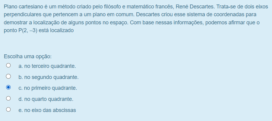 Plano cartesiano é um método criado pelo filósofo e matemático francês, René Descartes. Trata-se de dois eixos perpendiculares que pertencem a um plano em comum. Descartes criou esse sistema de coordenadas para a localização de alguns pontos no espaço. Com base nessas informações, podemos afirmar que ponto P(2, -3) está localizado a. no terceiro quadrante. b. no segundo quadrante. C. no primeiro quadrante. d. no quarto quadrante. e. no eixo das abscissas