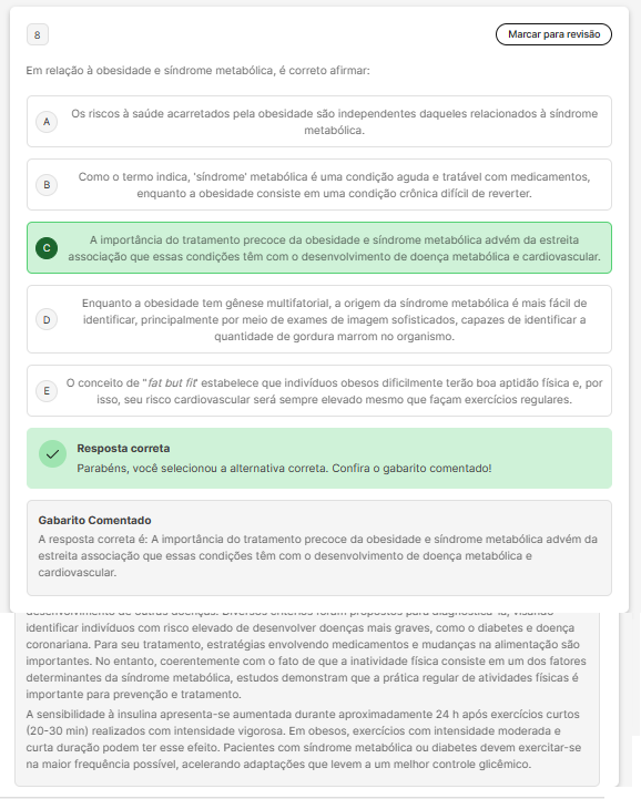 A) Os riscos à saúde acarretados pela obesidade são independentes daqueles relacionados à síndrome metabólica. B) Como termo indica, a síndrome metabólica é uma condição aguda e tratável com medicamentos, enquanto a obesidade consiste em uma condição crônica. C) A importância do tratamento precoce da obesidade e síndrome metabólica se deve à estreita associação que essas condições têm com o desenvolvimento de doença metabólica e à identificação de indivíduos com risco elevado de desenvolver doenças mais graves, como diabetes. D) Principalmente por meio de exames de imagem sofisticados, capazes de identificar a quantidade de gordura marrom no organismo. E) O conceito de 'fat but fit' estabelece que indivíduos obesos dificilmente terão boa aptidão física e, por isso, seu risco cardiovascular será sempre elevado mesmo que façam exercícios regulares.