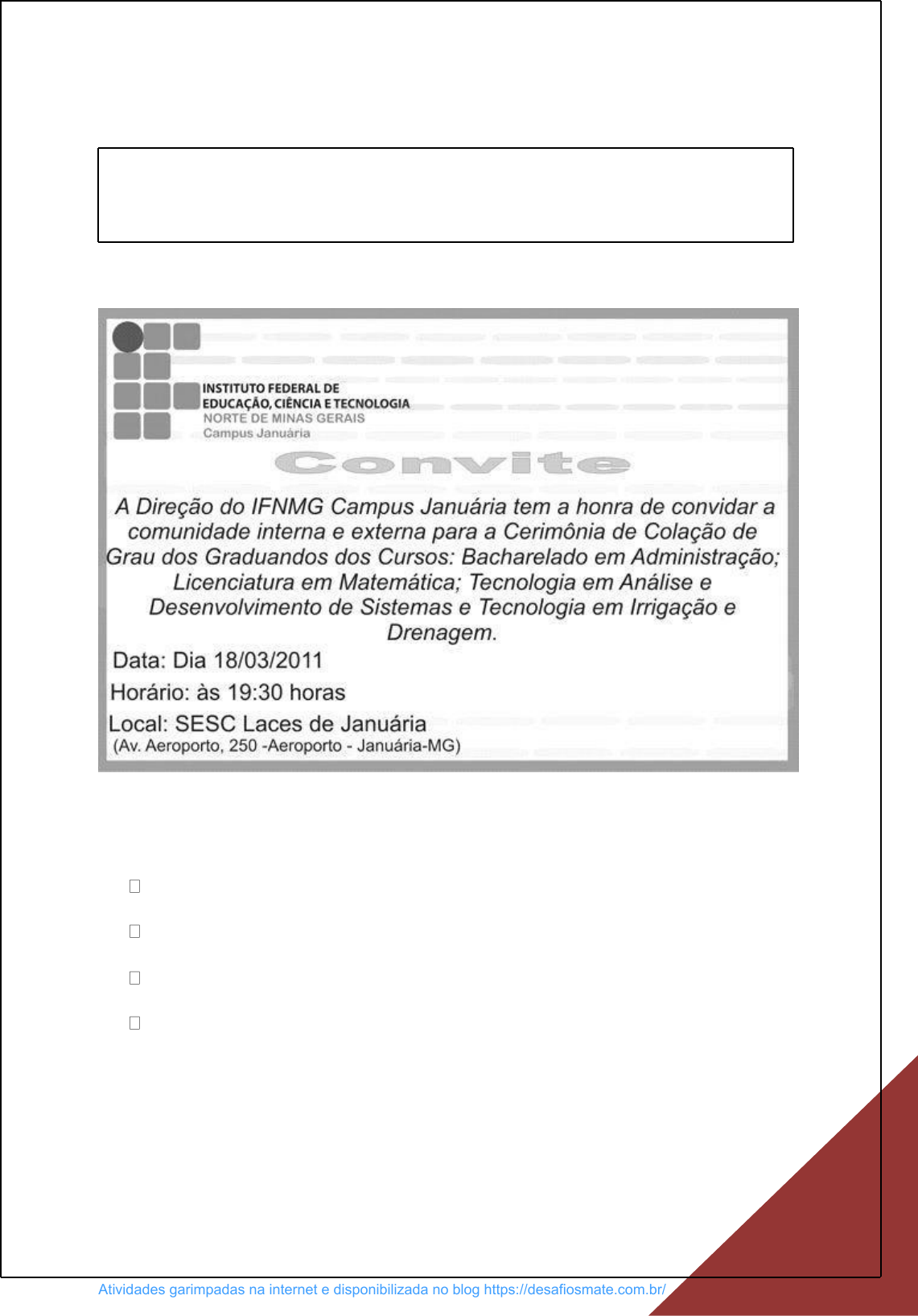 98 CONVITE Convite é a forma através da qual se convida alguém para algum evento de modo formal, seja aniversário casamento ou qualquer outro. Num convite não podem faltar: O nome do destinatário, ou a quem se destina; A mensagem; O remetente (o nome de quem envia); O local, a data e a hora da festa. Atividades garimpadas na internet e disponibilizada no blog https://desafiosmate.com.br/ 99 Agora é sua vez! Crie um convite para sua festa de aniversário. Convide alguém que você gosta muito para o evento. Para fazer o convite pense: - Quem está sendo convidado? - Qual é o motivo do convite? - Quem está convidando? - Qual o local da festa? - Qual é a data? E o horário? ____________________________________________________ __________________________________________________ __________________________________________________ __________________________________________________ __________________________________________________ __________________________________________________ __________________________________________________ __________________________________________________ __________________________________________________ __________________________________________________ __________________________________________________ __________________________________________________ Atividades garimpadas na internet e disponibilizada no blog https://desafiosmate.com.br/ 100 Observe o convite de aniversário: Agora, retire o que se pede do convite: a) Que está sendo convidado? ___________________________________ b) Que dia será realizada a festa? ________________________________ c) Onde será realizada a festa? __________________________________ d) Quem enviou o convite que você leu? ___________________________ e) Qual o horário da festa? ______________________________________ Atividades garimpadas na internet e disponibilizada no blog https://desafiosmate.com.br/ 101 RECEITA MÉDICA João esteve adoentado e teve que ir ao médico. Veja a receita que o Doutor deu para sua mãe. Responda: Qual é o nome do paciente? ________________________________________ Qual é o nome do médico? _________________________________________ Você já tomou algum desses medicamentos? ________________ Você já teve febre? ____________________________________ Que medicamento usou para combatê-la? _______________________________________________________________ Quando fica doente, você faz repouso? _____________________ Escreva o nome do remédio receitado pelo médico. _______________________________________________________________ Atividades garimpadas na internet e disponibilizada no blog https://desafiosmate.com.br/ 102 Visita ao médico Cole abaixo uma receita médica, sua de qualquer época. Escreva experiências que possa ter tido sobre quando você ficou doente (sintomas, dores, repouso, dieta, internação, etc). _________________________________________________ _________________________________________________ _________________________________________________ _________________________________________________ _________________________________________________ _________________________________________________ _________________________________________________ Atividades garimpadas na internet e disponibilizada no blog https://desafiosmate.com.br/ https://desafiosmate.com.br/ Mais atividades Como Essas, Acesse Materiais Gratuitos Para Concursos e Seleções https://questoesconcursopedagogia.com.br/ Cursos Gratuitos de Aperfeiçoamento e Qualificação https://superpreparadocursos.com.br/ SUPER MATERIAL COMPLETO PARA CONCURSOS E SELEÇÕES: https://questoesconcursopedagogia.com.br/mais1200questoes/ MATERIAIS PARA SALA DE AULA: https://desafiosmate.com.br/pacote-de-materiais-sala-de-aula Nossas Mídias Página no Facebook: https://www.facebook.com/desafiosmatematicossaladeaula/ Nosso Grupo no Facebook https://www.facebook.com/groups/467814469928014/ Nosso Canal no Youtube: https://www.youtube.com/channel/UCZ3D5VBLZW1lacEE89nMJgg https://desafiosmate.com.br/ https://questoesconcursopedagogia.com.br/ https://superpreparadocursos.com.br/ https://questoesconcursopedagogia.com.br/mais1200questoes/ https://desafiosmate.com.br/pacote-de-materiais-sala-de-aula https://www.facebook.com/desafiosmatematicossaladeaula/ https://www.facebook.com/groups/467814469928014/ https://www.youtube.com/channel/UCZ3D5VBLZW1lacEE89nMJgg 103 Leia o texto abaixo para responder a questão 01. O sanfoneiro só tocava isso! Geraldo Medeiros e Haroldo Lobo O baile lá na roça foi até o sol raiar A casa estava cheia, mal podia se andar. Estava tão gostoso aquele reboliço, Mas é que o sanfoneiro só tocava isso! De vez em quando alguém vinha pedindo pra mudar, O sanfoneiro ria, querendo agradar, Mas parece que a sanfona tinha qualquer enguiço, É que o sanfoneiro só tocava isso! Fonte: http://www.poesiasefrases.com.br/o-sanfoneiro-so-tocava-isso/ QUESTÃO 01 (SAEP 2012) Segundo o texto, a sanfona parecia com defeito porque (A) o sanfoneiro sempre tocava a mesma música. (B) o sanfoneiro ria, querendo agradar. (C) a casa estava cheia e tinha muito reboliço. (D) o baile na roça foi até o sol raiar. A raposa e a cegonha (Fábulas de Esopo.) A raposa sabida resolveu, em um belo dia, convidar a comadre cegonha para jantar em sua toca. Querendo pregar uma peça na cegonha, serviu uma suculenta sopa num prato raso. Como era de se esperar, a raposa tomou toda a sua sopa sem o menor problema, mas a pobre da cegonha, com seu bico comprido, mal pode tomar uma gota. Ainda que morta de fome, a cegonha não disse nada. A raposa fingiu que estava preocupada, perguntou se a sopa não estava do gosto da cegonha, mas ela nada falou. Agradeceu a gentileza da raposa e ainda a convidou para um jantar no dia seguinte em sua casa. Fazia questão de retribuir a gentileza da comadre raposa. No outro dia, na casa da cegonha, assim que chegou, a raposa se sentou lambendo os beiços de fome, curiosa para ver as delícias que a outra iria servir. O jan