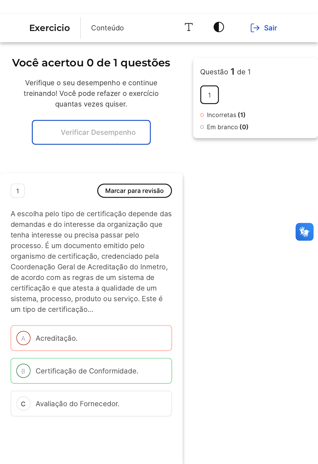Você acertou 0 de 1 questões Verifique o seu desempenho e continue treinando! Você pode refazer o exercício quantas vezes quiser. Verificar Desempenho A B C 1 Marcar para revisão A escolha pelo tipo de certificação depende das demandas e do interesse da organização que tenha interesse ou precisa passar pelo processo. É um documento emitido pelo organismo de certificação, credenciado pela Coordenação Geral de Acreditação do Inmetro, de acordo com as regras de um sistema de certificação e que atesta a qualidade de um sistema, processo, produto ou serviço. Este é um tipo de certificação... Acreditação. Certificação de Conformidade. Avaliação do Fornecedor. Questão 1 de 1 Incorretas �1� Em branco �0� 1 Exercicio Conteúdo Sair D E Certificação Compulsória. Certificação Voluntária. Resposta incorreta Opa! A alternativa correta é a letra B. Confira o gabarito comentado! Gabarito Comentado A resposta correta é: Certificação de Conformidade.