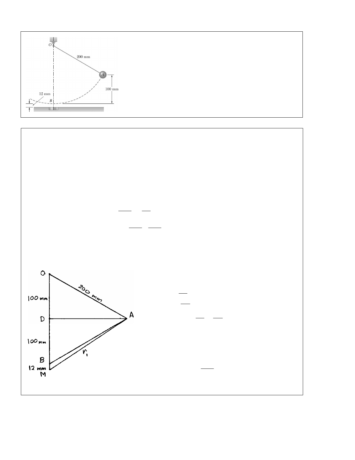 PROPRIETARY MATERIAL. © 2013 The McGraw-Hill Companies, Inc. All rights reserved. No part of this Manual may be displayed, reproduced or distributed in any form or by any means, without the prior written permission of the publisher, or used beyond the limited distribution to teachers and educators permitted by McGraw-Hill for their individual course preparation. If you are a student using this Manual, you are using it without permission. 820 PROBLEM 13.193 A 60-g steel sphere attached to a 200-mm cord can swing about Point O in a vertical plane. It is subjected to its own weight and to a force F exerted by a small magnet embedded in the ground. The magnitude of that force expressed in newtons is 23000/F r= where r is the distance from the magnet to the sphere expressed in millimeters. Knowing that the sphere is released from rest at A, determine its speed as it passes through Point B. SOLUTION Mass and weight: 0.060 kgm = (0.060)(9.81) 0.5886 NW mg= = = Gravitational potential energy: gV Wh= where h is the elevation above level at B. Potential energy of magnetic force: 2 2 3000 ( , in newtons, in mm) 3000 3000 N mm r m dV F F r drr V rr∞ = = − = − = ⋅ Use conservation of energy: 1 1 2 2T V T V+ = + Position 1: (Rest at A.) 1 1 1 1 0 0 100 mm ( ) (0.5886 N)(100 mm) 58.86 N mmg v T h V = = = = = ⋅ From the figure, 2 2 2 2200 100 (mm ) 100 12 112 mm AD MD = − = + = 2 22 1 2 2 2 2 1 200 100 112 42544 mm 206.26 mm r AD MD r = + = − + = = 1 1 3000 ( ) 14.545 N mmrV r = − = − ⋅ 3 1 58.86 14.545 44.3015 N mm 44.315 10 N mV −= − = ⋅ = × ⋅