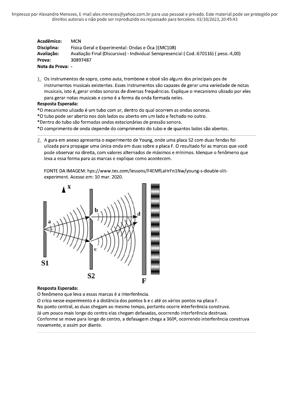 Física Geral e Experimental - Ondas e Ótica (EMC108) - Avaliação Final Discursiva