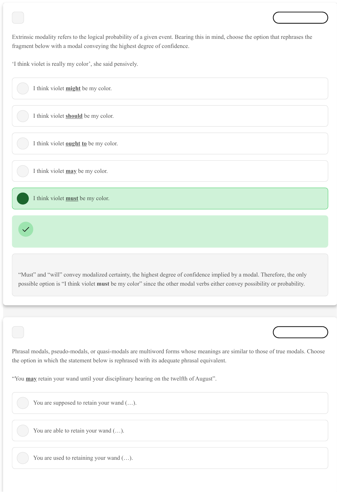 A B C D E A B C 1 Marcar para revisão Extrinsic modality refers to the logical probability of a given event. Bearing this in mind, choose the option that rephrases the fragment below with a modal conveying the highest degree of confidence. ‘I think violet is really my color’, she said pensively. I think violet might be my color. I think violet should be my color. I think violet ought to be my color. I think violet may be my color. I think violet must be my color. Resposta correta Parabéns, você selecionou a alternativa correta. Confira o gabarito comentado! Gabarito Comentado “Must” and “will” convey modalized certainty, the highest degree of confidence implied by a modal. Therefore, the only possible option is “I think violet must be my color” since the other modal verbs either convey possibility or probability. 2 Marcar para revisão Phrasal modals, pseudo-modals, or quasi-modals are multiword forms whose meanings are similar to those of true modals. Choose the option in which the statement below is rephrased with its adequate phrasal equivalent. “You may retain your wand until your disciplinary hearing on the twelfth of August”. You are supposed to retain your wand (…). You are able to retain your wand (…). You are used to retaining your wand (…). D E A B C D E You have to retain your wand (…). You are allowed to retain your wand (…). Resposta correta Parabéns, você selecionou a alternativa correta. Confira o gabarito comentado! Gabarito Comentado In the fragment “you may retain your wand”, “may” expresses the notion of permission, also conveyed by the phrasal equivalent “be allowed to”. The other alternatives express ability, advice, obligation and habit. 3 Marcar para revisão Certain modal verbs are charged with future meaning, such as ‘will’ and ‘shall’.Mark the option in which “shall” is used to express a prediction. So I daresay we shall meet again soon enough. Shall we get practising then? Well… shall I get started then? Shall we go up to your office, then, Minister? Shall we go and find a compartment, then? Resposta correta Parabéns, você selecionou a alternativa correta. Confira o gabarito comentado! Gabarito Comentado “Shall” in “So I daresay we shall meet again soon enough” could be replaced by the modal “will” and preserve its predictive tone. That is not the case, though, with the other options, in which “shall” could be replaced either by “may” or by “let’s”. 4 Marcar para revisão A B C D E A B C D E Simply put, each modal has a phrasal counterpart. Choose the correct option regarding the definition and the use of pseudo-modals. Pseudo-modals do not have to conform with the subject-verb agreement rule. Pseudo-modals do not require the to-infinitive to keep them apart from the main verb. Pseudo-modals are multiword forms whose meanings are similar to those conveyed by modals. “Be supposed to” is the phrasal equivalent of the modal “may”. “Be able to” is the phrasal counterpart of “must”. Resposta correta Parabéns, você selecionou a alternativa correta. Confira o gabarito comentado! Gabarito Comentado “Pseudo-modals”, also called “phrasal modals”, are indeed multi-word forms whose meanings share a lot in common with the meanings entailed by true modals. Nevertheless, they differ from modals in terms of syntax, in the sense that they conform to the subject-verb agreement and require the to-infinitive to keep them apart from the main verb. What’s more, ‘be supposed to” is the equivalent of “should”, whereas “be able to” shares with “can” and “could” the idea of ability. 5 Marcar para revisão In English there are multiword forms such as phrasal modals, pseudo-modals, or quasi-modals whose meanings are similar to those of true modals. Choose the option in which the statement below is rephrased with its adequate phrasal equivalent. “We should get out into the garden so we’re ready”. We are supposed to get out into the garden (…). We are able to get out into the garden (…). We are allowed to get out into the garden (…). We are used to getting out into the garden (…). We have to get out into the garden (…). A B C D E Resposta correta Parabéns, você selecionou a alternativa correta. Confira o gabarito comentado! Gabarito Comentado In order to give advice, speakers can resort to the modals “should” and “ought to” or to their phrasal counterpart “be supposed to”. The other phrasal counterparts either convey permission, obligation, past habit, or ability. 6 Marcar para revisão The difference in meaning conveyed by different modals can be quite subtle and sometimes only noticeable in the variety being used, whether British, American, Canadian and so on. Which alternative best explains the difference between “must” and “have got to” in American English? “Must” is often used to underscore the speakers’ emotions while “have got to” expresses logical deduction. “Must” typically expresses logical deduction, while “have got to” tends to be used to underscore the speaker’s feelings or the urgency of the situation. “Must” invites the interlocutor to face the obligation as a social necessity, while “have got to” depicts the social necessity as rules imposed by a particular social group. “Must” and “have got to” are most often used to describe a social necessity imposed by a particular group. “Must” and “have got to” are most often used to express logical deduction. Resposta correta Parabéns, você selecionou a alternativa correta. Confira o gabarito comentado! Gabarito Comentado In American English, “have got to” or the reduced “gotta” often signals the urgency of the situation and the emotional charge of the message, while “must” tends to be employed to suggest a logical deduction. 7 Marcar para revisão Modals are often used to convey ideas about time. Mark the