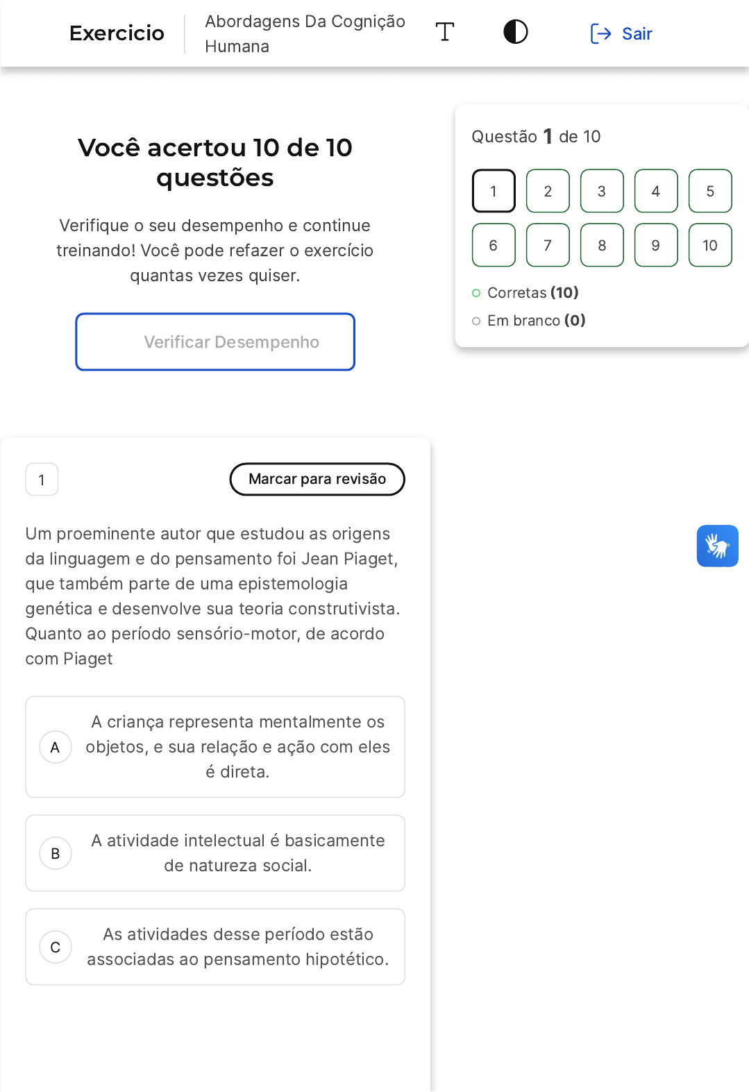 21/04/2024, 18:18 wyden.saladeavaliacoes.com.br/exercicio/6625701b257ea9c02633261a/gabarito/ https://wyden.saladeavaliacoes.com.br/exercicio/6625701b257ea9c02633261a/gabarito/ 1/16 Você acertou 10 de 10 questões Verifique o seu desempenho e continue treinando! Você pode refazer o exercício quantas vezes quiser. Verificar Desempenho A B C 1 Marcar para revisão Um proeminente autor que estudou as origens da linguagem e do pensamento foi Jean Piaget, que também parte de uma epistemologia genética e desenvolve sua teoria construtivista. Quanto ao período sensório-motor, de acordo com Piaget A criança representa mentalmente os objetos, e sua relação e ação com eles é direta. A atividade intelectual é basicamente de natureza social. As atividades desse período estão associadas ao pensamento hipotético. Questão 1 de 10 Corretas �10� Em branco �0� 1 2 3 4 5 6 7 8 9 10 Exercicio Abordagens Da Cognição Humana Sair 21/04/2024, 18:18 wyden.saladeavaliacoes.com.br/exercicio/6625701b257ea9c02633261a/gabarito/ https://wyden.saladeavaliacoes.com.br/exercicio/6625701b257ea9c02633261a/gabarito/ 2/16 D E O universo que circunda a criança é conquistado mediante a percepção e os movimentos. As interações da criança são marcadas pelo pensamento egocêntrico. Resposta correta Parabéns, você selecionou a alternativa correta. Confira o gabarito comentado! Gabarito Comentado De acordo com a teoria de Jean Piaget, o estágio sensório-motor é o primeiro período do desenvolvimento cognitivo da criança, no qual ela começa a entender o mundo ao seu redor principalmente através de suas sensações e movimentos. Nesse estágio, a criança não possui a capacidade de representar mentalmente os objetos, nem de ter uma atividade intelectual de natureza social, nem de associar suas atividades ao pensamento hipotético ou egocêntrico. Essas características são desenvolvidas nos estágios posteriores. Portanto, a alternativa D, que afirma que "O universo que circunda a criança é conquistado mediante a percepção e os movimentos", é a correta, pois reflete adequadamente a natureza do estágio sensório-motor na teoria de Piaget. 2 Marcar para revisão 21/04/2024, 18:18 wyden.saladeavaliacoes.com.br/exercicio/6625701b257ea9c02633261a/gabarito/ https://wyden.saladeavaliacoes.com.br/exercicio/6625701b257ea9c02633261a/gabarito/ 3/16 A B C D E Um processo cognitivo depende do outro, eles interagem entre si. Por meio da relação e influência dos processos cognitivos pode-se compreender a dinâmica da mente e o comportamento humano. A modificação que ocorre em nosso comportamento durante as experiências, tornando-o gradualmente mais eficiente para determinada atividade refere-se ao processo cognitivo denominado Aprendizagem Motivação Concentração Emoção Pensamento Resposta correta Parabéns, você selecionou a alternativa correta. Confira o gabarito comentado! Gabarito Comentado A alternativa correta é a "Aprendizagem". A aprendizagem é um processo cognitivo que se refere à modificação do comportamento durante as experiências, tornando-o gradualmente mais eficiente para determinada atividade. Este conceito de adaptação compreendido pela aprendizagem é justamente variar por efeito das consequências até formatos mais eficientes e menos frustrantes ou 21/04/2024, 18:18 wyden.saladeavaliacoes.com.br/exercicio/6625701b257ea9c02633261a/gabarito/ https://wyden.saladeavaliacoes.com.br/exercicio/6625701b257ea9c02633261a/gabarito/ 4/16 A B C D E punitivos. Este processo ocorre independentemente de estar ou não excitado àquela atividade, como operando quando motivado, exigindo uma focalização exclusiva tal qual ocorre quando concentrados, eliciados em atividades emocionais preparatórias ou representando mentalmente um resultado futuro desse processo, como quando pensando. 3 Marcar para revisão Existem experiências marcadas por uma alta motivação, alta concentração, alta energia (vigor) e alto desempenho. Para alcançar essa performance potenciada e esse estado de excelência, precisa-se ''mergulhar'' na experiência e dedicar mais atenção, ainda que a tarefa seja relativamente curta. Marque a alternativa que apresenta, corretamente, esse tipo de atenção. Atenção concentrada Atenção seletiva Atenção múltipla Atenção difusa Atenção alternada 21/04/2024, 18:18 wyden.saladeavaliacoes.com.br/exercicio/6625701b257ea9c02633261a/gabarito/ https://wyden.saladeavaliacoes.com.br/exercicio/6625701b257ea9c02633261a/gabarito/ 5/16 Resposta correta Parabéns, você selecionou a alternativa correta. Confira o gabarito comentado! Gabarito Comentado O tipo de atenção descrito no enunciado é a atenção concentrada. Este tipo de atenção não é definido pela duração da atividade, mas sim pelo nível de dedicação atencional empregada e pelo estado de envolvimento. Este estado otimizado de desempenho é também conhecido como "flow", um estado em que a pessoa se "entrega" completamente à tarefa, fluindo plenamente em satisfação, concentração e motivação. Este conceito difere da atenção seletiva, que envolve a seleção de estímulos em um cenário de figura-fundo, e da atenção alternada, que mantém diferentes focos em contextos de ampla estimulação. Os conceitos de atenção múltipla e difusa não são teoricamente válidos. 4 Marcar para revisão Piaget descreve que as crianças, na fase pré- operatória, apresentam o que chamou de ''pensamento egocêntrico''. Assinale a alternativa que caracteriza tal pensamento. 21/04/2024, 18:18 wyden.saladeavaliacoes.com.br/exercicio/6625701b257ea9c02633261a/gabarito/ https://wyden.saladeavaliacoes.com.br/exercicio/6625701b257ea9c02633261a/gabarito/ 6/16 A B C D E As crianças aderem a uma escala comum de referência, ou seja, apresentam definições idênticas às mesmas palavras. As crianças, durante uma conversa, conservam as definições tradicionais do grupo em que convivem. As crianças apresenta