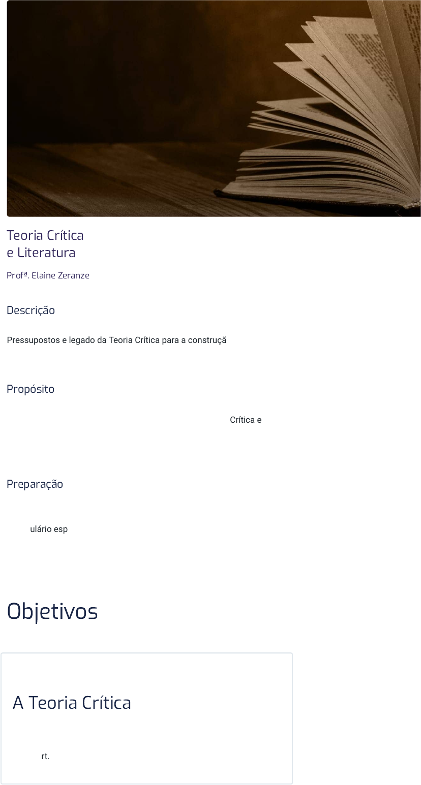 30/04/2024, 13:34 Teoria Crítica e Literatura https://stecine.azureedge.net/repositorio/00212hu/02819/index.html?brand=estacio# 1/57 Teoria Crítica e Literatura Profª. Elaine Zeranze Descrição Pressupostos e legado da Teoria Crítica para a construção do pensamento ocidental e a teoria literária. Propósito Compreender aspectos históricos e conceituais da Teoria Crítica e sua contribuição para os estudos literários para ampliar conhecimentos pertinentes à Teoria da Literatura. Preparação Tenha em mãos um dicionário de literatura para compreender o vocabulário específico da área. Na internet, você acessa gratuitamente o E-Dicionário de Termos Literários, de Carlos Ceia, e o Dicionário de Cultura Básica, de Salvatore D’Onofrio. Objetivos Módulo 1 A Teoria Crítica Reconhecer o contexto e as principais temáticas da Escola de Frankfurt. 30/04/2024, 13:34 Teoria Crítica e Literatura https://stecine.azureedge.net/repositorio/00212hu/02819/index.html?brand=estacio# 2/57 Módulo 2 Walter Benjamin Identificar os principais conceitos em Walter Benjamin. Módulo 3 A Teoria Crítica no Brasil Reconhecer algumas aplicações da Teoria Crítica no contexto brasileiro. A Teoria Crítica é uma escola de pensamento que foi decisiva para a revolução do pensamento científico no século XX e que possui grande influência, sobretudo nas ciências humanas, até os dias atuais. Com críticas pungentes a outros pensadores e tradições filosóficas, a Teoria Crítica lançará mão de escritas fragmentárias e inacabadas, mediante aforismos e ensaios, por exemplo, como forma de provocar o pensamento crítico e evitar, assim, o pensamento fechado e dogmático. Com temática variada, a Teoria Crítica, também chamada de Escola de Frankfurt, que conta com os pensadores alemães Theodor Adorno (1903-969), Walter Benjamin (1892-1940), Max Horkheimer (1895-1973) e Herbert Marcuse (18998-1979), traz à tona questões importantes, como a sociedade totalitária, a cultura de massa, a falsa ideia de progresso e o mundo da técnica, sempre sob um viés político, afinal, para esses intelectuais, o pensamento crítico é também político. Introdução 30/04/2024, 13:34 Teoria Crítica e Literatura https://stecine.azureedge.net/repositorio/00212hu/02819/index.html?brand=estacio# 3/57 1 - A Teoria Crítica Ao �nal deste módulo, você será capaz de reconhecer o contexto e as principais temáticas da Escola de Frankfurt. Contexto histórico e �losó�co da Teoria Crítica Memorial Karl Marx em Berlin-Stralau, em Berlim, na Alemanha. Antes de pensarmos a Teoria Crítica como escola filosófica, é importante demarcar o seu caminho de formação. A rápida modernização da Alemanha e de outros países europeus, como também a efervescência intelectual de meados do século XIX, são o germe da Teoria Crítica. Nas raízes da Teoria Crítica, encontramos o pensamento marxista, que é a sua pedra de toque, portanto será nossa primeira abordagem. Em seguida veremos nomes como Lukács e Weber com os célebres conceitos de consciência de classe e desencantamento do mundo, respectivamente. O marxismo: a “grande narrativa” 30/04/2024, 13:34 Teoria Crítica e Literatura https://stecine.azureedge.net/repositorio/00212hu/02819/index.html?brand=estacio# 4/57 O marxismo poderia ser visto como uma teoria “pau para toda obra”, servindo para tratar de qualquer tema, em qualquer época (SIM; VAN LOON, 2019). Já é mais que sabida a importância da crítica ao capitalismo de Marx para pensarmos a modernidade. A figura do velho barbudo já está “viralizada”, e alguns de seus principais conceitos foram banalizados – como alienação e luta de classes – de tanto utilizados e reutilizados, algumas vezes apropriadamente, mas em boa parte fora de contexto. Karl Marx em 1875. Além desses conceitos mais célebres, veremos o importante método dialético materialista. Por uma questão metodológica, começaremos pelo método dialético. A dialética hegeliana (idealista) x dialética marxista (materialista) Desde os gregos, com Heráclito e depois Platão, a dialética é pensada como um método filosófico que busca resolver as contradições do Ser e do Universo. É a partir da filosofia idealista de Hegel que virá a lógica da dialética materialista. Logo, para compreendermos o método marxista, precisamos conhecer um pouco do pensamento hegeliano. Para Hegel, toda Ideia/realidade (tese) inevitavelmente traz em si a sua negação (antítese), o que nomeou de princípio da contradição. A partir do princípio da contradição, ficaria explicado o devir/vir a ser/transformação. E dessa contradição inevitavelmente viria a sua resolução (síntese). Um dos exemplos dados por Hegel para ilustrar esse princípio é o da flor: 30/04/2024, 13:34 Teoria Crítica e Literatura https://stecine.azureedge.net/repositorio/00212hu/02819/index.html?brand=estacio# 5/57 Dialética Idealista Tese Antítese Síntese Semente Flor Fruto Ideia em si Ideia fora de si Ideia em si e para si Segundo Hegel, a Flor é a negação da Semente, assim como o Fruto é a negação da Flor, ou ainda, a negação da negação. Partindo dessa lógica, da superação das contradições, Hegel pretende resolver o devir contínuo, ou seja, as constantes transformações. A síntese se transformaria numa nova tese, que geraria sua antítese e caminharia para uma nova síntese, numa espiral contínua. A essa lógica, Hegel chamou de método dialético. Comentário A grande questão é a defesa de Hegel do método dialético como um inevitável caminho da mente humana para um nível mais elevado de síntese/autoconsciência, o que transmite a ideia de progresso da mente humana e, consequentemente, da humanidade. Nesse ponto irá divergir a dialética marxista, ao negar essa evolução histórica e, ainda, a própria concepção de história. Hegel A história é concebida como jornada do espírito no mundo, ou seja, a auto