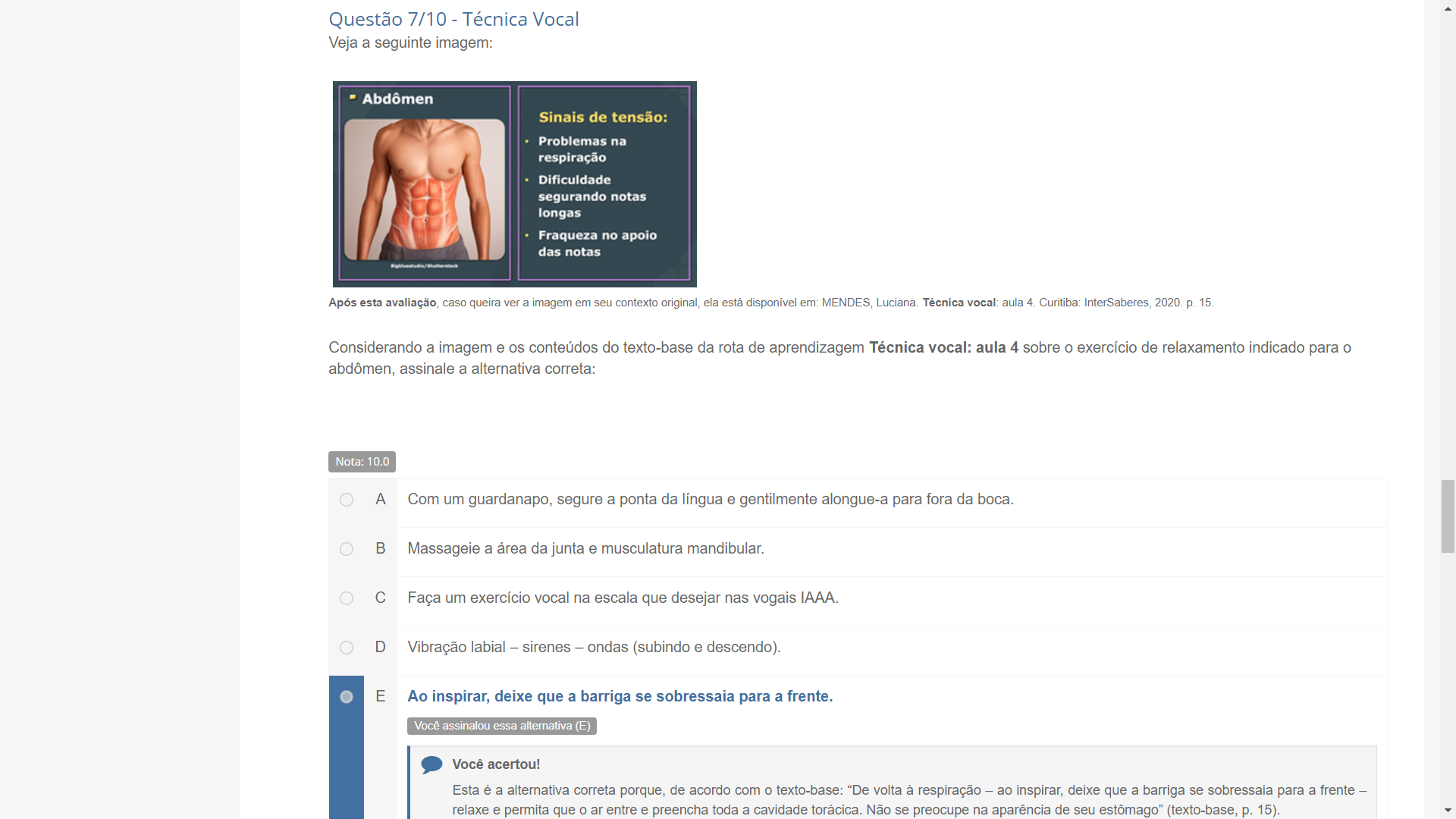 Veja a seguinte imagem: Abdômen Sinais de tensão: Problemas na respiração Dificuldade segurando notas longas Fraqueza no apoio das notas Após esta avaliação, caso queira ver a imagem em seu contexto original, ela está disponível em: MENDES, Técnica vocal: aula 4. Curitiba: InterSaberes, 2020. p. 15. Considerando a imagem e os conteúdos do texto-base da rota de aprendizagem Técnica vocal: aula 4 sobre o exercício de relaxamento indicado para o abdômen, assinale a alternativa correta: A Com um guardanapo, segure a ponta da língua e gentilmente alongue-a para fora da boca. B Massageie a área da junta e musculatura mandibular. C Faça um exercício vocal na escala que nas vogais IAAA. D Vibração labial - sirenes - ondas (subindo e descendo). E Ao inspirar, deixe que a barriga se sobressaja para a frente.