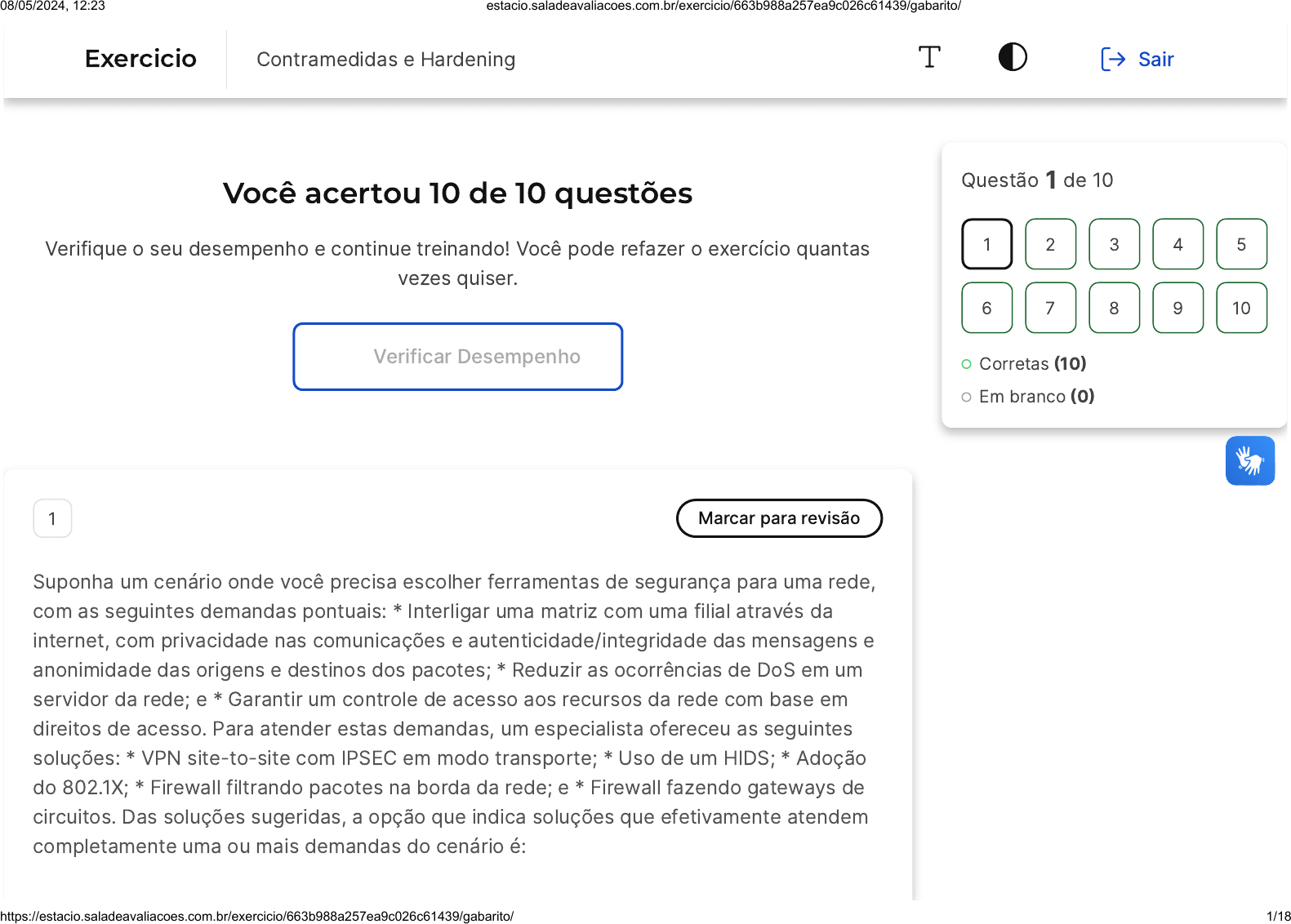Você acertou 10 de 10 questões Verifique o seu desempenho e continue treinando! Você pode refazer o exercício quantas vezes quiser. Verificar Desempenho 1 Marcar para revisão Suponha um cenário onde você precisa escolher ferramentas de segurança para uma rede, com as seguintes demandas pontuais: * Interligar uma matriz com uma filial através da internet, com privacidade nas comunicações e autenticidade/integridade das mensagens e anonimidade das origens e destinos dos pacotes; * Reduzir as ocorrências de DoS em um servidor da rede; e * Garantir um controle de acesso aos recursos da rede com base em direitos de acesso. Para atender estas demandas, um especialista ofereceu as seguintes soluções: * VPN site-to-site com IPSEC em modo transporte; * Uso de um HIDS; * Adoção do 802.1X; * Firewall filtrando pacotes na borda da rede; e * Firewall fazendo gateways de circuitos. Das soluções sugeridas, a opção que indica soluções que efetivamente atendem completamente uma ou mais demandas do cenário é: Questão 1 de 10 Corretas �10� Em branco �0� 1 2 3 4 5 6 7 8 9 10 Exercicio Contramedidas e Hardening Sair 08/05/2024, 12:23 estacio.saladeavaliacoes.com.br/exercicio/663b988a257ea9c026c61439/gabarito/ https://estacio.saladeavaliacoes.com.br/exercicio/663b988a257ea9c026c61439/gabarito/ 1/18 A B C D E I, II e III II e III I e IV I e V IV e V Resposta correta Parabéns, você selecionou a alternativa correta. Confira o gabarito comentado! Gabarito Comentado A VPN site-to-site endereça a ligação entre matriz e filial com confidencialidade e autenticidade/integridade, mas não garante ANONIMIDADE em modo transporte, o que apenas seria garantido em modo TÚNEL. O HIDS endereça a negação de serviço em um host específico, então atende. O 802.1X permite a implantação de um sistema de AAA (autenticação, autorização e accounting) baseado em direitos de acesso, logo, também atende. Um firewall filtrando pacotes apenas permitiria a criação de implantação de regras para pacotes IP, TCP, UDP e ICMP, então não endereça especificamente nenhuma das demandas. O firewall fazendo gateway de circuitos 08/05/2024, 12:23 estacio.saladeavaliacoes.com.br/exercicio/663b988a257ea9c026c61439/gabarito/ https://estacio.saladeavaliacoes.com.br/exercicio/663b988a257ea9c026c61439/gabarito/ 2/18 A B C controla conexões de transporte, contribuindo para mitigar alguns tipos de ataques de negação, mas não todas as possibilidades. Um IDS especificamente configurado para o HOST específico �HIDS� com as assinaturas de ataques DoS de vários tipos é a melhor e mais abrangente solução. 2 Marcar para revisão O protocolo TCP é um dos principais alvos de ataques de Negação de Serviço. Isso decorre das suas próprias características. Assinale a característica do TCP que facilita tais ataques: Ao receber uma mensagem de pedido de conexão, o TCP já aloca recursos para a conexão, responde ao solicitante e fica em espera uma confirmação. A numeração dos pacotes sempre inicia em 1, sendo trivial a adivinhação de números de sequência. O TCP aloca recursos para janelas de transmissão no tamanho limite máximo logo no início, esgotando rapidamente os recursos em um ataque. 08/05/2024, 12:23 estacio.saladeavaliacoes.com.br/exercicio/663b988a257ea9c026c61439/gabarito/ https://estacio.saladeavaliacoes.com.br/exercicio/663b988a257ea9c026c61439/gabarito/ 3/18 D E O TCP aceita múltiplas conexões de um único socket para uma mesma aplicação. O TCP não suporta criptografia. Resposta correta Parabéns, você selecionou a alternativa correta. Confira o gabarito comentado! Gabarito Comentado Ao receber uma mensagem de pedido de conexão, o TCP já aloca recursos para a conexão, responde ao solicitante e fica em espera uma confirmação. Justificativa: Opções erradas - algumas implementações bem antigas usam numeradores sequenciais iniciando em 1, mas isso não é uma característica do TCP. O ISN �Initial Sequence Number) é, por definição, um número randomicamente escolhido para numerar os segmentos em cada sentido da comunicação. Janelas de transmissão TCP sempre iniciam pequenas e vão aumentando ao longo da comunicação, caso não ocorram erros. Não é possível criar duas conexões DIFERENTES e SIMULTÂNEAS usando os mesmos sockets de origem e destino. A criptografia não é uma medida destinada a combater ataques de negação de serviço. Opção certa - a máquina de estados do TCP define um handshake onde, ao receber um pedido de conexão, o servidor cria um TCB �Transmission Control Block) e aloca recursos para atender ao pedido, enquanto aguarda o estabelecimento dela. Se o solicitante não concluir o handshake, o TCP aguarda um timeout antes de liberar os recursos. SE a quantidade 08/05/2024, 12:23 estacio.saladeavaliacoes.com.br/exercicio/663b988a257ea9c026c61439/gabarito/ https://estacio.saladeavaliacoes.com.br/exercicio/663b988a257ea9c026c61439/gabarito/ 4/18 A B C de solicitações for grande e não houver contramedidas para ataques DoS, o servidor rapidamente ficará sobrecarregado e deixará de atender a novos pedidos de conexão. 3 Marcar para revisão Algoritmos criptológicos simétricos são conhecidos da humanidade desde os tempos mais primórdios, e na segunda guerra mundial a máquina ENIGMA ficou conhecida por ter sido usada pelos alemães para as comunicações sigilosas estratégicas. Já a criptografia simétrica passou a ser conhecida da década de 70 em diante. Sobre a criptologia e seu uso atual, avalie as assertivas a seguir e a relação entre elas: I � A principal fragilidade da criptografia simétrica é resolvida com a substituição pela criptografia assimétrica. PORQUE II � A criptografia assimétrica oferece mecanismos para troca segura de chaves sem a demanda de contato direto entre os pares de uma comunicação privada. A respeito dessas assertivas, assinale a opção correta: As assertivas I e II são proposiç