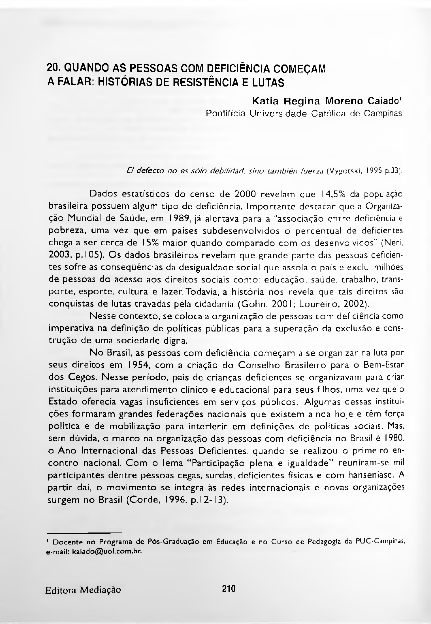 E! defecto no es sólo debiHdad, sino también fuerza (Vygotski, 1995 p.33). 210Editora Mediação 1 Docente no Programa de Pós-Graduação em Educação e e-mail: kaiado@uol.com.br. Katia Regina Moreno Caiado1 Pontifícia Universidade Católica de Campinas no Curso de Pedagogia da PUC-Campinas, 20. QUANDO AS PESSOAS COM DEFICIÊNCIA COMEÇAM A FALAR: HISTÓRIAS DE RESISTÊNCIA E LUTAS Dados estatísticos do censo de 2000 revelam que 14,5% da população brasileira possuem algum tipo de deficiência. Importante destacar que a Organiza ção Mundial de Saúde, em I989, já alertava para a “associação entre deficiência e pobreza, uma vez que em países subdesenvolvidos o percentual de deficientes chega a ser cerca de I5% maior quando comparado com os desenvolvidos" (Neri, 2003, p. 105). Os dados brasileiros revelam que grande parte das pessoas deficien tes sofre as conseqüências da desigualdade social que assola o país e exclui milhões de pessoas do acesso aos direitos sociais como: educação, saúde, trabalho, trans porte, esporte, cultura e lazer. Todavia, a história nos revela que tais direitos são conquistas de lutas travadas pela cidadania (Gohn, 2001; Loureiro, 2002). Nesse contexto, se coloca a organização de pessoas com deficiência como imperativa na definição de políticas públicas para a superação da exclusão e cons trução de uma sociedade digna. No Brasil, as pessoas com deficiência começam a se organizar na luta por seus direitos em I954, com a criação do Conselho Brasileiro para o Bem-Estar dos Cegos. Nesse período, pais de crianças deficientes se organizavam para criar instituições para atendimento clínico e educacional para seus filhos, uma vez que o Estado oferecia vagas insuficientes em serviços públicos. Algumas dessas institui ções formaram grandes federações nacionais que existem ainda hoje e têm força política e de mobilização para interferir em definições de políticas sociais. Mas, sem dúvida, o marco na organização das pessoas com deficiência no Brasil é 1980, o Ano Internacional das Pessoas Deficientes, quando se realizou o primeiro en contro nacional. Com o lema “Participação plena e igualdade” reuniram-se mil participantes dentre pessoas cegas, surdas, deficientes físicas e com hanseníase. A partir daí, o movimento se integra às redes internacionais e novas organizações surgem no Brasil (Corde, I996, p. I2-I3). mailto:kaiado@uol.com.br Denise Meyrelles de Jesus et al. 211 Editora Mediação Nesse período, avançam as mobilizações dos trabalhadores no país. A partir da luta contra a ditadura militar os movimentos urbanos ressurgem e se intensificam pela construção da cidadania. Trabalhadores e grupos até então si lenciados se reúnem e se organizam em sindicatos, associações e conselhos (Sader, 1995; Dagnino, 2002; Gohn, 2003). Em Campinas, São Paulo, no ano de 1981, é criada uma comissão para organizar no município as comemorações do Ano Internacional das Pessoas Defi cientes. Dessa comissão surgirá, posteriormente, o Conselho Municipal de aten ção à pessoa deficiente e com necessidades especiais. Em pesquisa anterior, intitulada “Conselho Municipal de Atenção à Pessoa Deficiente: Sociedade Civil Organizada” (Caiado, 2004), participei de inúmeras reuniões e atividades desse conselho e assim convivi com pessoas deficientes que trazem histórias de vida tecidas em diferentes lugares sociais, com diferentes ma nifestações orgânicas, singulares vivências afetivas, diferentes percursos escolares e profissionais. Muito interessante destacar é a intensa e crescente participação da pessoa com deficiência nesse movimento. Se no início eram pais e profissionais que por eles reivindicavam seus direitos, aos poucos tomam a palavra e, sem tutela, sua voz começa a ecoar. Dessa convivência logo percebi que, dentre os conselheiros deficientes, alguns representavam grupos já organizados enquanto outros vivenciavam suas primeiras experiências de participação social organizada. Compreendendo-se que movimentos sociais são “ações sociais coletivas de caráter sócio-político e cultural que viabilizam distintas formas da população se organizar e expressar suas demandas” (Gohn, 2003, p. I3), ao se organizarem as pessoas deficientes podem assumir um novo paradigma de sociedade e de homem, o que pode alterar as grades invisíveis do consenso que as proclama incapazes; construção secular de uma memória social que os identifica como excluídas. Assim, ao conviver com pessoas deficientes que participam desses movi mentos e refletir sobre essa histórica exclusão, uma forte pergunta se impôs: quais dimensões da vida as impulsionam para a luta emancipatória? Em nosso país nos acostumamos com pessoas deficientes caladas, sem voz. Impossibilitadas de sair de casa por barreiras materiais ou por uma visão de mundo hegemônica que as intitula incapazes e culpadas pela condição em que se encontram vítimas. No entanto, descobri vozes firmes que se colocam na luta pela constru ção da cidadania e me perguntei: qual é a trama que compõe o tecido dessas vidas? Que tecido é esse que os impulsiona para a participação social? De qual lugar social falam? Quais as lembranças que compõem o tempo de suas vidas? Que experiências de vida relatam? O que suas memórias nos revelam sobre a constru ção de suas identidades? 212 INCLUSÃO, PRÁTICAS PEDAGÓGICAS E TRAJETÓRIAS DE PESQUISA Objetivos Método e procedimentos Editora Mediação Conhecer a história de vida de pessoas deficientes que participam de grupos organizados na luta de seus direitos e analisar algumas das dimensões da vida que os impulsionam para a luta. Para alcançar os objetivos, busquei os fundamentos teórico-metodológicos do método dialético. Conforme Saviani (2000, prefácio à sexta edição), baseado no texto “Método da economia política”, de Marx, o método é caracterizado como um movimen