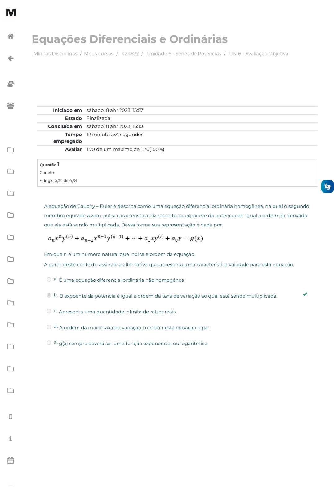 Minhas Disciplinas / Meus cursos / 424672 / Unidade 6 - Séries de Potências / UN 6 - Avaliação Objetiva Equações Diferenciais e Ordinárias Iniciado em sábado, 8 abr 2023, 15:57 Estado Finalizada Concluída em sábado, 8 abr 2023, 16:10 Tempo empregado 12 minutos 54 segundos Avaliar 1,70 de um máximo de 1,70(100%) Questão 1 Correto Atingiu 0,34 de 0,34 A equação de Cauchy – Euler é descrita como uma equação diferencial ordinária homogênea, na qual o segundo membro equivale a zero, outra característica diz respeito ao expoente da potência ser igual a ordem da derivada que ela está sendo multiplicada. Dessa forma sua representação é dada por: Em que n é um número natural que indica a ordem da equação. A partir deste contexto assinale a alternativa que apresenta uma característica validade para esta equação. a. É uma equação diferencial ordinária não homogênea. b. O expoente da potência é igual a ordem da taxa de variação ao qual está sendo multiplicada. c. Apresenta uma quantidade in�nita de raízes reais. d. A ordem da maior taxa de variação contida nesta equação é par. e. g(x) sempre deverá ser uma função exponencial ou logarítmica. https://avap.multivix.edu.br/my/ https://avap.multivix.edu.br/course/view.php?id=20515 https://avap.multivix.edu.br/course/view.php?id=20515§ion=7 https://avap.multivix.edu.br/mod/quiz/view.php?id=1307990 https://avap.multivix.edu.br/my/ https://avap.multivix.edu.br/course/view.php?id=20515 https://avap.multivix.edu.br/user/index.php?id=20515 https://avap.multivix.edu.br/course/view.php?id=20515§ion=1 https://avap.multivix.edu.br/course/view.php?id=20515§ion=2 https://avap.multivix.edu.br/course/view.php?id=20515§ion=3 https://avap.multivix.edu.br/course/view.php?id=20515§ion=4 https://avap.multivix.edu.br/course/view.php?id=20515§ion=5 https://avap.multivix.edu.br/course/view.php?id=20515§ion=6 https://avap.multivix.edu.br/course/view.php?id=20515§ion=7 https://avap.multivix.edu.br/course/view.php?id=20515§ion=8 https://avap.multivix.edu.br/course/view.php?id=20515§ion=9 https://avap.multivix.edu.br/course/view.php?id=20515§ion=10 https://avap.multivix.edu.br/course/view.php?id=20515§ion=11 https://avap.multivix.edu.br/course/view.php?id=20515§ion=12 https://avap.multivix.edu.br/hooks/portal/ https://avap.multivix.edu.br/mod/page/view.php?id=1252%2F%22%20target%3D%22_blank https://avap.multivix.edu.br/calendar/view.php/ https://avap.multivix.edu.br/local/staticpage/view.php?page=biblioteca https://avap.multivix.edu.br/ Questão 2 Correto Atingiu 0,34 de 0,34 Questão 3 Correto Atingiu 0,34 de 0,34 No estudo das séries numéricas, têm-se que a partir de uma série Existe a enésima soma parcial, indicada por Caso esta seja convergente e existir como um número real, a série é considerada: a. convergente parcial. b. divergente. c. divergente parcial d. convergente. e. semi-convergente. Considerando uma equação diferencial de segunda ordem cuja descrição é dada por: É possível estabelecer uma classi�cação quanto a um ponto, podendo este ser ordinário ou singular. Nesse sentido, quando admite um ponto: a. b. c. d. e. https://avap.multivix.edu.br/my/ https://avap.multivix.edu.br/course/view.php?id=20515 https://avap.multivix.edu.br/user/index.php?id=20515 https://avap.multivix.edu.br/course/view.php?id=20515§ion=1 https://avap.multivix.edu.br/course/view.php?id=20515§ion=2 https://avap.multivix.edu.br/course/view.php?id=20515§ion=3 https://avap.multivix.edu.br/course/view.php?id=20515§ion=4 https://avap.multivix.edu.br/course/view.php?id=20515§ion=5 https://avap.multivix.edu.br/course/view.php?id=20515§ion=6 https://avap.multivix.edu.br/course/view.php?id=20515§ion=7 https://avap.multivix.edu.br/course/view.php?id=20515§ion=8 https://avap.multivix.edu.br/course/view.php?id=20515§ion=9 https://avap.multivix.edu.br/course/view.php?id=20515§ion=10 https://avap.multivix.edu.br/course/view.php?id=20515§ion=11 https://avap.multivix.edu.br/course/view.php?id=20515§ion=12 https://avap.multivix.edu.br/hooks/portal/ https://avap.multivix.edu.br/mod/page/view.php?id=1252%2F%22%20target%3D%22_blank https://avap.multivix.edu.br/calendar/view.php/ https://avap.multivix.edu.br/local/staticpage/view.php?page=biblioteca Questão 4 Correto Atingiu 0,34 de 0,34 Questão 5 Correto Atingiu 0,34 de 0,34 Existem diversas séries de potência que são signi�cativamente conhecidas por deterem propriedades que facilitam a realização de diversos cálculos em matemática, inclusive a solução de uma EDO. Uma destas recebe o nome de Série de Maclaurin e possui como característica principal: a. ser uma Série de Taylor cuja expansão ocorre em torno de b. ser uma Equação de Cauchy – Euler com coe�ciente c. ser uma Equação de Cauchy – Euler com coe�ciente d. ser uma Série de Taylor cuja expansão ocorre em torno de e. ser uma Série de Taylor cuja expansão ocorre em torno de Na dinâmica da Série de Taylor ocorre uma expansão, ou seja, a função é representada em torno de um ponto x qualquer com base no valor da função em outro ponto e das derivadas de ordem n da função no ponto . Essa representação é dada por: Nesse sentido, considerando a função em torno de assinale a alternativa que apresenta a representação em série de Taylor. a. b. c. d. e. ◄ Conteúdo online Seguir para... Exercícios de Fixação ► https://avap.multivix.edu.br/mod/scorm/view.php?id=1307989&forceview=1 https://avap.multivix.edu.br/mod/quiz/view.php?id=1307991&forceview=1 https://avap.multivix.edu.br/my/ https://avap.multivix.edu.br/course/view.php?id=20515 https://avap.multivix.edu.br/user/index.php?id=20515 https://avap.multivix.edu.br/course/view.php?id=20515§ion=1 https://avap.multivix.edu.br/course/view.php?id=20515§ion=2 https://avap.multivix.edu.br/course/view.php?id=20515§ion=3 https://avap.multivix.edu.br/course/view.php?id=20515§ion=4 https://avap.multivix.edu.br/course/view.