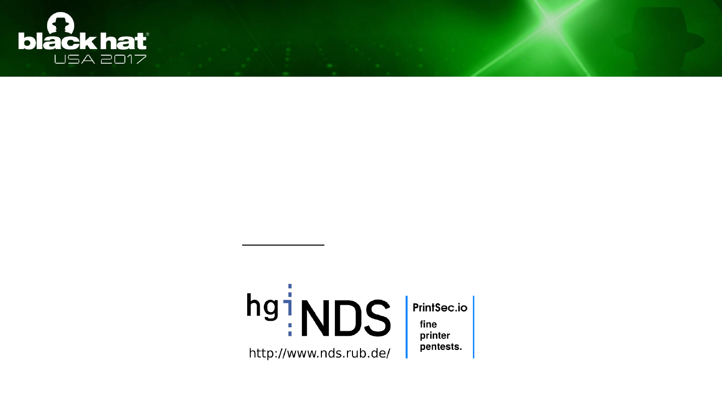 Exploiting Network Printers Jens Müller, Vladislav Mladenov, Juraj Somorovsky, Jörg Schwenk 1 Why printers? 1987 2017 2 Evolution 3 Yet another T in the IoT? • Systematization of printer attacks • Evaluation of 20 printer models • PRinter Exploitation Toolkit (PRET) • Novel attacks beyond printers • New research directions 4 Contributions 1. Background 2. Attacks 3. Evaluation 4. PRET 5. Beyond printers 6. Countermeasures 5 Overview 1. Printing channel (USB, network, …) 2. Printer language (PJL, PostScript, …) 6 How to print? 7 What to attack? Printing Unit Printer USB RAW IPP LPD SMB PJL Interpreter PostScript Interpreter Further Interpreter (PCL, PDF, …) • Printer Job Language • Manages settings like output tray or paper size @PJL SET PAPER=A4 @PJL SET COPIES=10 @PJL ENTER LANGUAGE=POSTSCRIPT • NOT limited to the current print job 8 PJL • Invented by Adobe (1982 – 1984) • Heavily used on laser printers • Turing complete language 9 PostScript 1. Background 2. Attacks 3. Evaluation 4. PRET 5. Beyond printers 6. Countermeasures 10 Overview • Is your copy room always locked? 11 Attacker model: Physical access • Who would connect a printer to the Internet? 12 Attacker model: Network access 13 Attacker model: Network access Attacker (Insider) Attacker 14 Attacker model: Web attacker Carrier Attacker (Website) • Denial of service • Protection bypass • Print job manipulation • Information disclosure 15 Four classes of attacks • Postscript infinite loop {} loop 16 Denial of service 16 Next level DoS • NVRAM has limited # of write cycles • Can be set in print jobs themselves! • Continuously set long-term value for number of copies @PJL DEFAULT COPIES=X 17 Physical damage • Reset to factory defaults • Can be done with a print job (HP) @PJL DMCMD ASCIIHEX= "040006020501010301040106" 17 Protection bypass • Redefinition of Postscript showpage operator 18 Print job manipulation • Access to memory • Access to file system • Capture print jobs Save on file system or in memory 19 Information disclosure 20 Attacker model: Web attacker Carrier Attacker (Website) 21 Same-origin policy Carrier evil.org internal.bank.com 22 CORS spoofing Carrier evil.org JavaScript (PS file) (HTTP/1.0 OK) print (Access-Control-Allow-Origin: evil.org) print … printer.bank.com:9100 1. Background 2. Attacks 3. Evaluation 4. PRET 5. Beyond printers 6. Countermeasures 23 Overview • How would you proceed? Our approach: Contacted university system administrators 24 Obtaining printers 25 Printers. Lots of printers 26 Evaluation results Overview 1. Background 2. Attacks 3. Evaluation 4. PRET 5. Beyond printers 6. Countermeasures 27 Overview Translator PJL PostScript PRET Result /str 256 string def (%*%../../../*) {==} str filenameforall PostScript Request PJL Request PJL Response (%disk0%../../../ init) (%disk0%../../../.profile) (%disk0%../../../tmp) Postscript Response init TYPE=FILE SIZE=1276 .profile TYPE=FILE SIZE=834 tmp TYPE=DIR @PJL FSDIRLIST NAME="0:\..\..\" ENTRY=1 COUNT=3User command - 834 .profile - 1276 init d - tmp ConnectorAttacker ls 28 PRinter Exploitation Toolkit (PRET) 29 PRET commands 1. Background 2. Attacks 3. Evaluation 4. PRET 5. Beyond printers 6. Countermeasures 30 Overview 31 Google Cloud Print Target: Google Attacker Converting PostScript = interpreting PostScript • PS conversion websites • Image conversion sites • Thumbnail preview 32 PostScript in the web? 1. Background 2. Attacks 3. Evaluation 4. PRET 5. Beyond printers 6. Countermeasures 33 Overview 34 Countermeasures “Hacker Stackoverflowin made 160,000 printers spew out ASCII art around the world” -- theregister.co.uk 35 Do not connect printers to the Internet https://www.theregister.co.uk/2017/02/06/hacker_160000_printers/ Employees: always lock the copy room Administrators: sandbox printers in a VLAN accessible only via print server Printer vendors: undo insecure design decisions (PostScript, proprietary PJL) Browser vendors: block port 9100 36 Countermeasures Christian Slater was right: Printers are insecure • PostScript and PJL considered dangerous • Exploitation through lots of channels (websites, even ☺) • No real countermeasures yet 37 Black Hat sound bytes PRET („Printer Exploitation Toolkit“) https://github.com/RUB-NDS/PRET Hacking Printers Wiki http://hacking-printers.net/ Questions? 38 Thanks for your attention... https://github.com/RUB-NDS/PRET http://hacking-printers.net/