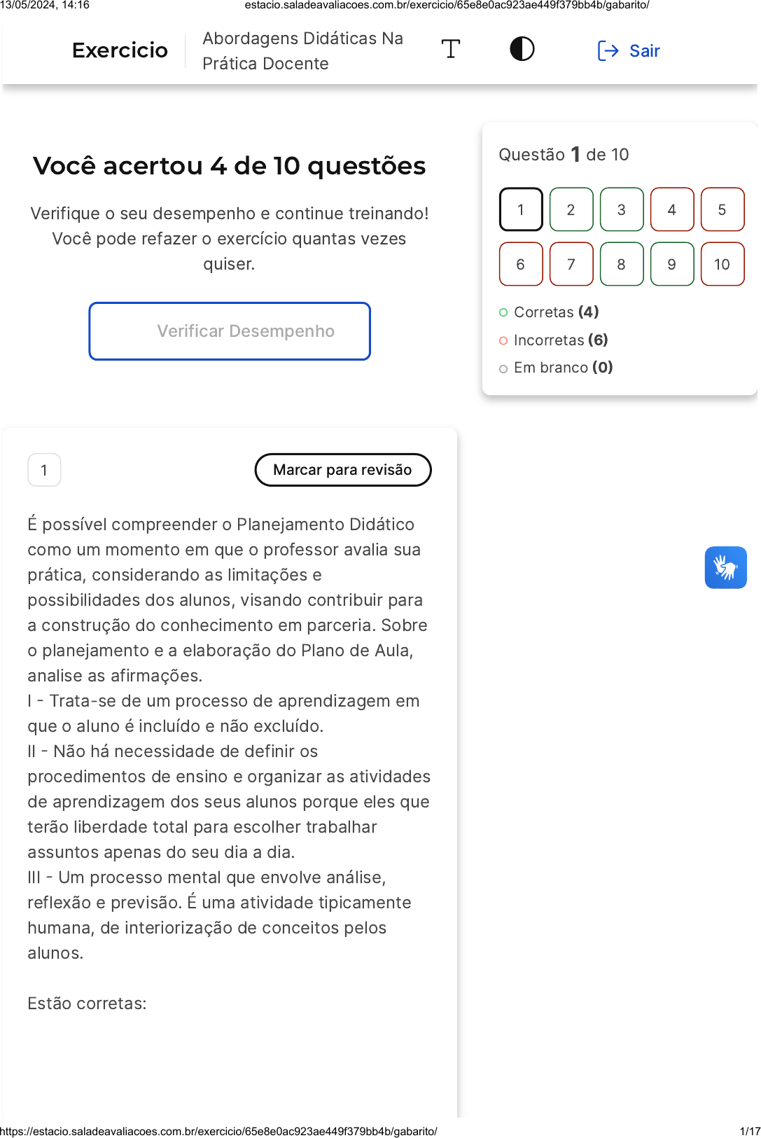 Você acertou 4 de 10 questões Verifique o seu desempenho e continue treinando! Você pode refazer o exercício quantas vezes quiser. Verificar Desempenho 1 Marcar para revisão É possível compreender o Planejamento Didático como um momento em que o professor avalia sua prática, considerando as limitações e possibilidades dos alunos, visando contribuir para a construção do conhecimento em parceria. Sobre o planejamento e a elaboração do Plano de Aula, analise as afirmações. I � Trata-se de um processo de aprendizagem em que o aluno é incluído e não excluído. II � Não há necessidade de definir os procedimentos de ensino e organizar as atividades de aprendizagem dos seus alunos porque eles que terão liberdade total para escolher trabalhar assuntos apenas do seu dia a dia. III � Um processo mental que envolve análise, reflexão e previsão. É uma atividade tipicamente humana, de interiorização de conceitos pelos alunos. Estão corretas: Questão 1 de 10 Corretas �4� Incorretas �6� Em branco �0� 1 2 3 4 5 6 7 8 9 10 Exercicio Abordagens Didáticas Na Prática Docente Sair 13/05/2024, 14:16 estacio.saladeavaliacoes.com.br/exercicio/65e8e0ac923ae449f379bb4b/gabarito/ https://estacio.saladeavaliacoes.com.br/exercicio/65e8e0ac923ae449f379bb4b/gabarito/ 1/17 A B C D E Apenas as afirmativas I e II Apenas as afirmativas II e III Apenas a afirmativa I Apenas a afirmativa II Apenas as afirmativas I e III Resposta incorreta Opa! A alternativa correta é a letra E. Confira o gabarito comentado! Gabarito Comentado O planejamento didático é um processo que envolve a inclusão do aluno (afirmativa I� e um processo mental que envolve análise, reflexão e previsão (afirmativa III�. A afirmativa II está incorreta, pois, apesar de o aluno ter liberdade para explorar assuntos do seu dia a dia, é fundamental que o professor defina os procedimentos de ensino e organize as atividades de aprendizagem. Portanto, as afirmativas I e III estão corretas, o que corresponde à alternativa E. O planejamento didático é uma ferramenta essencial para o professor, pois permite que ele estruture suas aulas de maneira eficaz, considerando as necessidades e possibilidades dos alunos, e contribua para a construção do conhecimento de forma colaborativa. 13/05/2024, 14:16 estacio.saladeavaliacoes.com.br/exercicio/65e8e0ac923ae449f379bb4b/gabarito/ https://estacio.saladeavaliacoes.com.br/exercicio/65e8e0ac923ae449f379bb4b/gabarito/ 2/17 A B C D E 2 Marcar para revisão Vygotsky defende a teoria Sócio-Interacionista de desenvolvimento e aprendizagem, a partir de uma perspectiva histórico-cultural de educação. Considerando esta abordagem, assinale a alternativa que apresenta um aspecto de grande impacto para o Sócio-Interacionismo. Família. Escola. Interação exclusivamente familiar para aprendizagem. Interação social humana sobre a aprendizagem e o desenvolvimento. Interação doméstica. Resposta correta Parabéns, você selecionou a alternativa correta. Confira o gabarito comentado! Gabarito Comentado De acordo com a teoria Sócio-Interacionista de Vygotsky, a interação social humana tem um papel fundamental no desenvolvimento e na aprendizagem. Esta teoria, que é baseada em uma perspectiva histórico-cultural, argumenta que o desenvolvimento do indivíduo ocorre através das relações sociais. Portanto, os processos humanos, incluindo a 13/05/2024, 14:16 estacio.saladeavaliacoes.com.br/exercicio/65e8e0ac923ae449f379bb4b/gabarito/ https://estacio.saladeavaliacoes.com.br/exercicio/65e8e0ac923ae449f379bb4b/gabarito/ 3/17 aprendizagem, são influenciados pela interação do indivíduo com um ambiente ou mundo humanizado. Assim, a alternativa D é a correta, pois destaca a importância da interação social humana para o desenvolvimento e a aprendizagem, conforme defendido por Vygotsky. 3 Marcar para revisão �SESI/DF � 2013 � Adaptada) Um planejamento educacional eficaz traz diversos benefícios para uma instituição de ensino, como o aperfeiçoamento das tarefas do dia a dia. Entretanto, apesar dessa planificação ser de conhecimento de muitos gestores, pode haver certa dificuldade de colocá-la em prática. O planejamento educacional abriga todos os aspectos educacionais planejados, segmentados e desenvolvidos pelas próprias instituições de ensino; além disso, torna os objetivos mais tangíveis, auxiliando na sua concretização. Disponível em: https://minhabiblioteca.com.br/blog/planejamento- educacional/. Acesso em: 27 jan. 2023. Sobre o planejamento, considere as afirmativas: I. A ação de planejar não deve se restringir ao simples preenchimento de formulários para o controle administrativo. II. A ação de planejar não se restringe à sala de aula, pois está diretamente ligada a exigências sociais. III. O Plano de Aula, uma vez construído, não deve ser modificado, pois trata-se de um documento formal que é arquivado na secretaria escolar para credenciamento da Instituição. IV. O Planejamento Escolar é um projeto político no sentido de buscar o bem comum de forma 13/05/2024, 14:16 estacio.saladeavaliacoes.com.br/exercicio/65e8e0ac923ae449f379bb4b/gabarito/ https://estacio.saladeavaliacoes.com.br/exercicio/65e8e0ac923ae449f379bb4b/gabarito/ 4/17 A B C D E democrática. Estão corretas as afirmativas: I e II, apenas. II e III, apenas. III e IV, apenas. I, II e IV, apenas. I, II e III, apenas. Resposta correta Parabéns, você selecionou a alternativa correta. Confira o gabarito comentado! Gabarito Comentado O planejamento educacional é uma ferramenta essencial para a gestão eficaz de uma instituição de ensino. Ele não deve ser visto apenas como um preenchimento de formulários para controle administrativo, mas como uma ação que vai além da sala de aula e está diretamente ligada às exigências sociais (afirmativas I e II�. Além disso, o planejamento escolar é um projeto político que busca o bem comum de forma democrática (