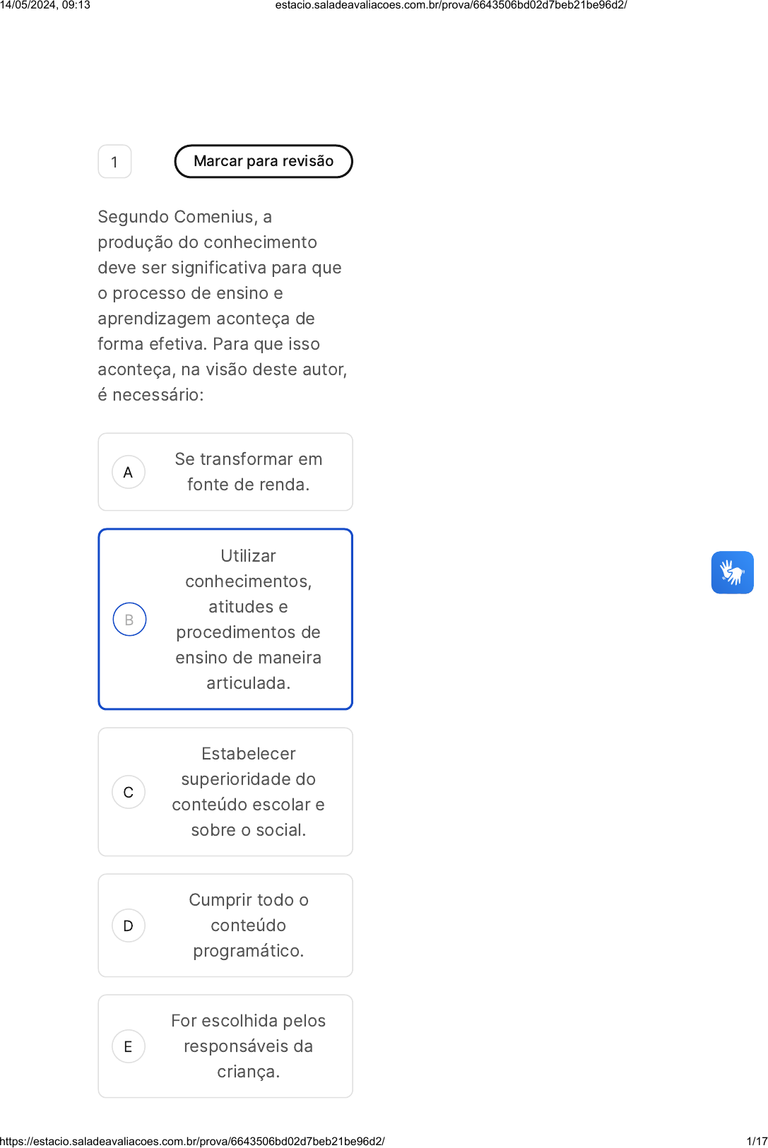 A B C D E 1 Marcar para revisão Segundo Comenius, a produção do conhecimento deve ser significativa para que o processo de ensino e aprendizagem aconteça de forma efetiva. Para que isso aconteça, na visão deste autor, é necessário: Se transformar em fonte de renda. Utilizar conhecimentos, atitudes e procedimentos de ensino de maneira articulada. Estabelecer superioridade do conteúdo escolar e sobre o social. Cumprir todo o conteúdo programático. For escolhida pelos responsáveis da criança. 14/05/2024, 09:13 estacio.saladeavaliacoes.com.br/prova/6643506bd02d7beb21be96d2/ https://estacio.saladeavaliacoes.com.br/prova/6643506bd02d7beb21be96d2/ 1/17 A B C D E 2 Marcar para revisão "O processo da educação não é apenas o conteúdo a ser estudado, mas a aprendizagem de valores e de atitudes que ajudarão a pessoa a ser melhor no presente e no futuro". Esta concepção acerca da Didática, definida quando essa área do conhecimento se estruturou historicamente, tinha então como princípio central: Ensinar tudo a todos. Educar com base nos cinco pilares da educação. Educação e moral para formar o cidadão. Educação para todos. Ensinar o pensamento crítico como fundamento. 3 Marcar para revisão Ao falarmos de Tendências Pedagógicas, estamos 14/05/2024, 09:13 estacio.saladeavaliacoes.com.br/prova/6643506bd02d7beb21be96d2/ https://estacio.saladeavaliacoes.com.br/prova/6643506bd02d7beb21be96d2/ 2/17 assumindo a seguinte posição: o professor, a escola, o aluno e o ensino estão marcados por pensamentos que exercem forte influência sobre as práticas educativas. A partir daí, somos capazes de perceber como tais tendências influenciam o processo de ensino-aprendizagem, especialmente na escola. Considerando a existência das Tendências Liberal e Progressista e o contexto histórico que permitiu o desenvolvimento de cada uma delas, considere as seguintes afirmativas: I � As Tendências Liberal e Progressista se diferenciam e possuem visões particulares sobre a relação Homem � Sociedade, que também permeia o ambiente escolar. II � A Tendência Liberal surge no contexto do emergente processo de industrialização, em fins do século XX, quando era necessário adequar o indivíduo à sociedade em que estava. III � A Tendência Progressista surge no contexto da Guerra Fria, quando o mundo passa a ser polarizado tanto política como ideologicamente, bem como com o avanço das Tecnologias de Informação e Comunicação. Das afirmativas acima: 14/05/2024, 09:13 estacio.saladeavaliacoes.com.br/prova/6643506bd02d7beb21be96d2/ https://estacio.saladeavaliacoes.com.br/prova/6643506bd02d7beb21be96d2/ 3/17 A B C D E Somente III é falsa. Somente II é verdadeira. Somente III é verdadeira. Somente I é verdadeira. Somente II é falsa. 4 Marcar para revisão As tendências pedagógicas se constituíram no âmago dos movimentos sociopolíticos do País e representam diferentes concepções de ser humano e de sociedade. Compreender as tendências pedagógicas no âmbito educativo significa apresentar pressupostos metodológicos e teóricos e reflexões acerca da prática educativa. SILVA, Araceli G. da. Tendências pedagógicas: perspectivas históricas e reflexões para a educação brasileira. Unoesc & Ciência � ACHS Joaçaba, v. 9, n. 1, p. 97� 106, jan./jun. 2018. Assinale a alternativa que apresenta a tendência pedagógica em que o papel da 14/05/2024, 09:13 estacio.saladeavaliacoes.com.br/prova/6643506bd02d7beb21be96d2/ https://estacio.saladeavaliacoes.com.br/prova/6643506bd02d7beb21be96d2/ 4/17 A B C D E escola é o de estimular a conscientização da realidade social para transformá-la. Tendência Liberal Tradicional. Tendência Progressista Libertadora. Tendência Progressista Crítico- social. Tendência Liberal Renovadora. Tendência Liberal Tecnicista. 5 Marcar para revisão A Teoria Cognitivista Sociointeracionista tem em Lev Vygotsky seu maior representante. Para ele, a mediação é um fato fundamental para o processo cognitivo do sujeito, sendo realizada por meio da relação interpessoal e dos sistemas de signos: linguagem, escrita, símbolos e objetos (geralmente resumidos como CULTURA�. 14/05/2024, 09:13 estacio.saladeavaliacoes.com.br/prova/6643506bd02d7beb21be96d2/ https://estacio.saladeavaliacoes.com.br/prova/6643506bd02d7beb21be96d2/ 5/17 A B Assinale a alternativa que não pode ser identificada com a Teoria Cognitivista Sociointeracionista. Obs.� Os fragmentos foram retirados de obra dos autores em domínio público. "Quando está começando a ser apreendida, a nova palavra não está no fim, mas no início do seu desenvolvimento. Nesse período ela é sempre uma palavra imatura..." "A criança está mais desenvolvida do ponto de vista sensório-motor do que do da lógica verbal. Por isso é fundamental buscar compreender os processos internos desta fase da vida humana, como gênese da aprendizagem". 14/05/2024, 09:13 estacio.saladeavaliacoes.com.br/prova/6643506bd02d7beb21be96d2/ https://estacio.saladeavaliacoes.com.br/prova/6643506bd02d7beb21be96d2/ 6/17 C D E "O que nos interessa é a ideia que nos parece absolutamente verdadeira: o caminho entre o primeiro momento em que a criança trava conhecimento com o novo conceito e o momento em que a palavra e o conceito se tornam propriedade da criança é um complexo processo psicológico interior". "É difícil admitir a ideia de que a criança assimilou, mas não reelaborou a seu modo os conceitos científicos, que estes lhe chegaram imediatamente aos lábios da forma mais tranquila". "No momento em que a criança toma conhecimento pela primeira vez do significado de uma nova palavra, o processo de desenvolvimento dos conceitos não termina, mas está apenas começando...". 00 hora : 28 min : 56 seg Ocultar Questão 10 de 10 Respondidas �10� Em branco �0� Finalizar prova 1 2 3 4 5 6 7 8 9 10 SM2 Didática 14/05/2024, 09:13 estacio.saladeavaliacoes.com.br/prova/6643506bd02d7beb21be96d2