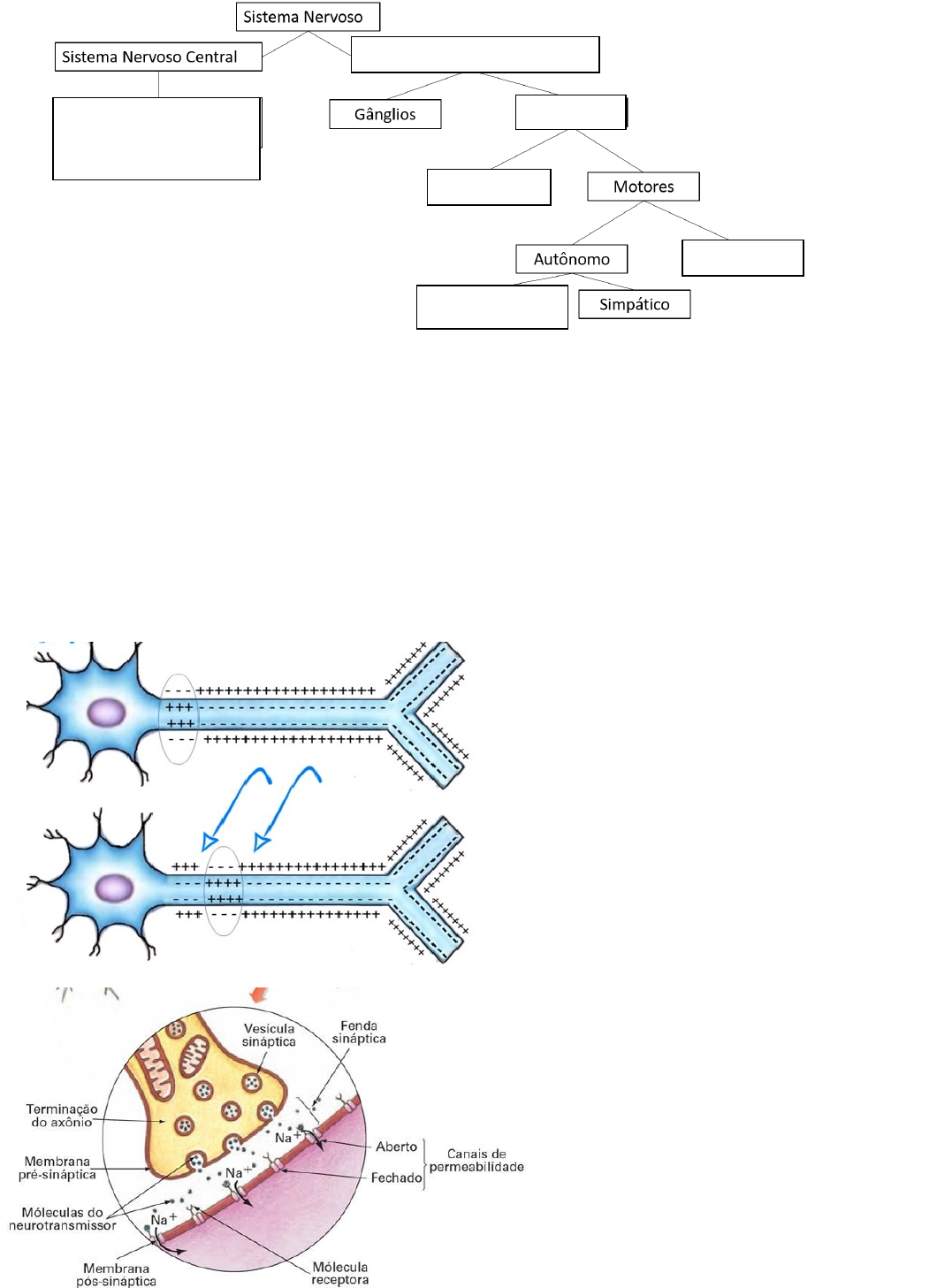 Atividade Tecido Nervoso Disciplina de Citologia e Histologia Nome: Rayssa da Silva Lopes ________________________________________________________________________________________ 1. Complete as divisões do Sistema Nervoso.Parassimpático Somático SENSITIVO NERVOS Sistema Nervoso Periférico 1.ENCÉFALO 2.MEDULA . 2. Analise a figura abaixo e descreva passo a passo o que está ocorrendo. RESPOSTA A primeira imagem passa pelo processo de despolarização e a segunda por repolarização. A principal diferença entre despolarização e repolarização é que a despolarização é a perda do potencial de membrana em repouso devido à conversão da polarização da membrana celular, enquanto a repolarização é a restauração do potencial de membrana em repouso após cada ocorrência de despolarização. 3. Explique na ordem cronológica os eventos que ocorrem na sinapse química. RESPOSTA · Chegada do Impulso Nervoso: Quando um impulso nervoso atinge o terminal axônico do neurônio pré-sináptico, ocorre a despolarização da membrana celular, levando à abertura dos canais de cálcio voltagem-dependentes. · Influxo de Íons Cálcio: Com a despolarização da membrana, os canais de cálcio voltagem-dependentes se abrem, permitindo que íons cálcio (Ca²⁺) entrem no terminal axônico. O cálcio é essencial para o processo de liberação do neurotransmissor. · Liberação do Neurotransmissor: O influxo de íons cálcio desencadeia a fusão das vesículas sinápticas com a membrana pré-sináptica, liberando neurotransmissores para a fenda sináptica por meio de exocitose. · Difusão do Neurotransmissor: Os neurotransmissores liberados se difundem através da fenda sináptica e se ligam aos receptores específicos na membrana do neurônio pós-sináptico. · Ativação dos Receptores: Quando os neurotransmissores se ligam aos receptores na membrana pós-sináptica, ocorrem mudanças conformacionais nos receptores, desencadeando a abertura ou fechamento de canais iônicos específicos. · Alteração no Potencial de Membrana: A abertura ou fechamento dos canais iônicos na membrana pós-sináptica resulta em uma alteração no potencial de membrana, levando à despolarização (excitação) ou hiperpolarização (inibição) do neurônio pós-sináptico. · Transmissão do Sinal: Se a despolarização alcançar o limiar de excitação, um potencial de ação pode ser gerado no neurônio pós-sináptico, propagando o sinal ao longo do neurônio e iniciando uma nova fase do processo sináptico. · Terminação do Sinal: Após a transmissão do sinal, os neurotransmissores remanescentes na fenda sináptica são removidos por meio de processos de reciclagem ou degradação enzimática, permitindo que a sinapse esteja pronta para receber e transmitir novos sinais. 4. O filme O Óleo de Lorenzo conta a história de um menino afetado por uma doença chamada leucodistrofa, que leva a deficiências auditivas, visuais e motoras. Essas deficiências devem-se à destruição da bainha de mielina das células nervosas. Analise a figura a seguir, referente a uma célula nervosa, na qual alguns componentes foram numerados de 1 a 4. Assinale a alternativa que contém o número correspondente à bainha de mielina: a) 1 b) 2 c) 3 d) 4 5. A observação do desenho a seguir nos permite concluir que, na passagem do impulso nervoso pelas sinapses, ocorre: a) a liberação de mediadores químicos ou de neurormônios. b) o contato direto do axônio de uma célula com os dendritos de outra célula. c) o fenômeno da bomba de sódio e potássio entre as células. d) a troca de cargas elétricas ao nível das sinapses. e) o envolvimento da bainha de mielina, que atua como um isolante elétrico. 6. Os anestésicos, largamente usados pela Medicina, tornam regiões ou todo o organismo insensível à dor porque atuam: a) nos axônios, aumentando a polarização das células. b) nas sinapses, impedindo a transmissão do impulso nervoso. c) nos dendritos, invertendo o sentido do impulso nervoso. d) no corpo celular dos neurônios, bloqueando o metabolismo. e) na membrana das células, aumentando a bomba de sódio. 7. A região de encontro entre os neurônios e entre neurônios e órgãos, onde ocorre a transmissão química de impulsos elétricos, é denominada: a) desmossomos b) axônio c) neuroglia d) bainha de mielina e) sinapse 8. Correlacione: (1) Neurônios sensitivos ou aferentes (2) Neurônios motores ou eferentes (3) Interneurônios (3) São neurônios que se situam inteiramente dentro do SNC. (1) São neurônios que trazem impulsos da pele ou outros órgãos sensoriais para o SNC. (2) São neurônios que levam impulsos do SNC para músculos e glândulas. 9. Descreva a diferença entre fibra nervosa e nervos. R- As fibras nervosas nada mais são do que axônios (prolongamento dos neurônios, que atuam garantindo a passagem do impulso nervoso) e suas bainhas envoltórias. Os nervos são revestidos por uma camada fibrosa mais externa, formada de tecido conjuntivo denso, o chamado epineuro. 10. Sobre a figura abaixo, descreva a diferença na constituição do tecido nervoso, quando falamos de substância branca e substância cinzenta. RESPOSTA- A substância branca não contém corpos de neurônio já a substância cinzenta é formada de corpos de neurônios, dendritos, a porção inicial não mielinizada dos axônios e células da glia. Na substância cinzenta têm lugar as sinapses do sistema nervoso central. 11. O que são Meninges? Descreva os nomes das meninges e espaços encontrados no Sistema nervoso. RESPOSTAS- As meninges são três membranas que revestem o sistema nervoso central, garantindo a proteção contra choques mecânicos e a regulação da pressão no interior desse importante sistema. Essas membranas são denominadas de dura-máter, aracnoide e pia-máter. 12. Onde está localizado o líquido cefalorraquidiano chamado de líquor? a) Espaço subdural b) Subaracnóideo c) Epidural d) Extra-d