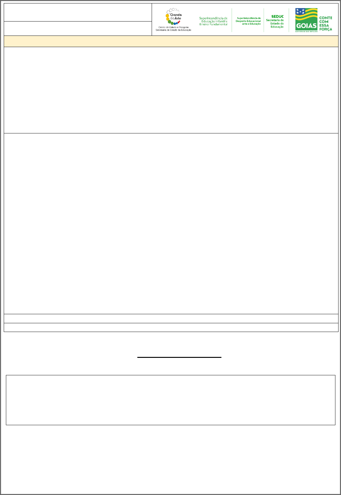 6º ANO ARTES VISUAIS ATIVIDADE 004 Tema: Objetos de conhecimento/conteúdos: Elementos das linguagens: Elementos constitutivos das Artes Visuais. Sistemas (Espaços e Atuações) da Linguagem: Categorias profissionais. Materialidades e Imaterialidades: Formas de expressão artística; Componentes fundamentais para a composição da produção artística. Processos de criação: Relações processuais e as conexões entre as diversas linguagens artísticas; Sentidos plurais; Processos de criação e ressignificação em artes visuais. Habilidades: (GO-EF06AR02-A) Explorar, reconhecer e produzir criativamente os elementos constitutivos das artes visuais, tais como: o ponto, a linha, a forma, a cor, o espaço, o movimento, a textura, os planos, a perspectiva, a partir de narrativas pessoais, sociais e estéticas. (GO-EF06AR04-A) Distinguir, explorar e empregar diferentes formas de expressão artística existentes, tais como: desenhos, pinturas, colagens, gravuras, HQ, zines, memes, dobraduras, esculturas, modelagens, instalações, vídeos, fotografias, performances, grafite, intervenções artísticas, tecelagens fazendo uso sustentável de materiais, instrumentos, recursos, técnicas convencionais e não convencionais. Compreender os processos de criação artística bem como suas possibilidades distintas na bidimensionalidade e tridimensionalidade, articulados com a poética pessoal. GO-EF06AR04-B) Reconhecer e explorar suportes, ferramentas, materiais, técnicas tradicionais e alternativas, como componentes fundamentais para a composição da produção artística, valorizando o processo de criação e refletindo sobre as representações imagéticas, bem como suas simbologias. (GO-EF06AR07-B) Conhecer, valorizar e respeitar os artistas, tais como: artistas plásticos, ilustradores, designers, grafiteiros, artesãos e os curadores locais, estabelecendo relações com os nacionais e internacionais de forma investigativa, crítica e sensível. (GO-EF06AR23) Reconhecer e experimentar, em projetos temáticos, as relações processuais e as conexões entre as diversas linguagens artísticas, a produção autônoma e autoral, respeitando os contextos pessoais, sociais e culturais. NOME: UNIDADE ESCOLAR: RITMO E MOVIMENTO O Ritmo expressa a sensação de movimento com a repetição de algumas formas tanto no real, com esculturas e instalações, quanto na representação visual com o desenho, a pintura ou mesmo a fotografia. O nosso olhar pode seguir a direção vertical, horizontal ou até mesmo circular. IMAGEM 1 IMAGEM 2 Imagem 1 - Artista: Poteiro, Antônio Título: Ciranda II Técnica: Óleo Sobre Tela. Fonte: https://www.google.com/search?q=ciranda+na+escultura+goiana&source= acesso em 02/02/2023 Imagem 2 - Loveland, Colorado/USA, o Benson Garden é uma galeria a céu aberto. Fonte: https://br.pinterest.com/pin/317151998752963772/ acesso em 01/02/2023 ATIVIDADE I Apesar das obras de pintura e escultura das imagens 1 e 2 serem estáticas, ou seja, paradas, elas transmitem a ideia de movimento. a) Observe a pintura da imagem 1, do artista considerado brasileiro, Antônio Poteiro. Que título você daria a ela? ______________________________________________________________________________________ b) Na imagem 2 podemos ver uma escultura tridimensional que está em um parque. Em qual das duas imagens podemos perceber mais movimento? Explique: ______________________________________________________________________________________ ______________________________________________________________________________________ ______________________________________________________________________________________ ______________________________________________________________________________________ ATIVIDADE II Observe as imagens 3 e 4. Nada melhor que observar o movimento das pessoas no campo de futebol, nas ruas ou dos brinquedos em um parque de diversões. Muitos artistas aproveitam o cenário a sua volta para se inspirar e criar seus trabalhos artísticos. IMAGEM 3 IMAGEM 4 Imagem 3 - Fonte: https://blog.emania.com.br/como-fazer-imagens-em-movimento-sem-erros/ acesso em 02/02/2023. Imagem 4 - Fonte: https://www.sabra.org.br/site/a-relacao-da-musica-com-movimentos-corporais/ acesso em 02/02/2023. https://www.google.com/search?q=ciranda+na+escultura+goiana&source= https://br.pinterest.com/pin/317151998752963772/ https://blog.emania.com.br/como-fazer-imagens-em-movimento-sem-erros/ https://www.sabra.org.br/site/a-relacao-da-musica-com-movimentos-corporais/ Agora crie a seguir, um trabalho artístico, com o tema “vento”. Imagine o que ele pode proporcionar ao movimento dos cabelos, roupas e objetos ao redor. Seu título com a palavra vento: “___________________________________________________________” ATIVIDADE III Observe a imagem 5 e assista ao vídeo descrito no link. IMAGEM 5 Pira Olímpica, artista americano Anthony Howe – Jogos Olímpicos de 2016 - Rio de Janeiro. Arte Cinética - Fonte: https://conexaoplaneta.com.br/blog/o-sopro-dos-renovaveis-na-pira-olimpica/ acesso em 01/02/2023. Assista ao vídeo; Fonte: https://www.google.com/search?q=movimento+da+pira+olimpica+2016&rlz=1C1GCEA&source=lnms&tbm=vid&sa=X&ved= 2ahUKEwji4Ivg6fb8AhVDLbkGHfMwDk8Q_AUoAXoECAEQAw&biw=1366&bih=568&dpr=1#fpstate=ive&vld=cid:313dff 38,vid:Xl-ghKQ1bek/ acesso em 02/02/2023. ATIVIDADE IV Pesquise sobre Arte Cinética no link: Fonte: https://pt.wikipedia.org/wiki/Arte_cin%C3%A9tica /acesso em 02/02/2023. ______________________________________________________________________________________ ______________________________________________________________________________________ ______________________________________________________________________________________ ______________________________________________________________________________________ ATIVIDADE V Os elementos formais da Pira Olímpica no vídeo da atividade anterior, criam um ritmo. Escreva quais as formas e os movimentos que você vê nessa escultura ci