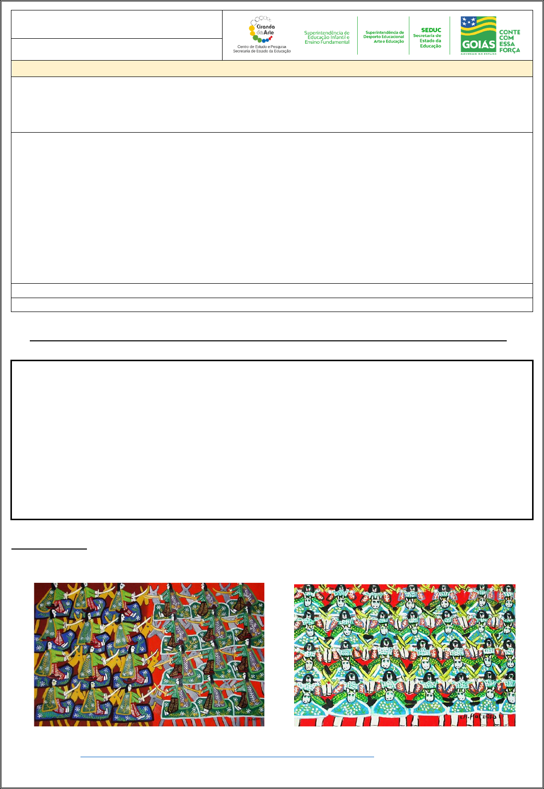 6º ANO ARTES VISUAIS ATIVIDADE 006 Tema: Objetos de Conhecimento/Conteúdo: Matrizes Estéticas e Culturais: Matrizes Estéticas e Culturais. Materialidades e Imaterialidades: Patrimônio cultural material e imaterial. Habilidades: (GO-EF06AR25) Conhecer e valorizar o patrimônio cultural, material e imaterial, de culturas diversas, em especial da brasileira, incluindo suas matrizes indígenas, africanas e europeias, de diferentes épocas, favorecendo a compreensão, a construção de vocabulário e repertório relativos às diferentes linguagens artísticas, estabelecendo o sentido de pertencimento, reconhecimento da alteridade e desconstruindo estereótipos. (GO-EF06AR03-A) Conhecer, reconhecer, analisar e valorizar a influência de distintas matrizes estéticas e culturais das artes visuais nas manifestações artísticas das culturas locais, regionais, nacionais e universais, assim como as representações que estas fazem dos sujeitos, observando papéis de gênero e outros marcadores sociais, partindo de um olhar reflexivo que busque compreender como e porque as representações imagéticas e estéticas interferem nas identidades culturais. NOME: UNIDADE ESCOLAR: MANIFESTAÇÕES ARTÍSTICAS E CULTURAIS NAS OBRAS DE ARTISTAS GOIANOS As obras de artes podem ser apreciadas de várias formas. Podemos investigar e caracterizar os elementos visuais explorados pelos artistas e também como estes dão novos significados às ideias, aos pensamentos e aos sentimentos. Podemos além disso, imaginar como as obras de artes nos dizem muito a respeito de diferentes culturas, épocas e lugares. A nossa cultura apresenta costumes e características diversas, dos povos indígenas, africanos e europeus e isso contribui para a diversidade das manifestações artísticas e culturais no Brasil. É possível observar que vários artistas plásticos exploram essa temática em suas obras de arte de diferentes formas, cada um à sua maneira, pois arte é representação, transformação, participação, troca simbólica. ATIVIDADE I As duas imagens abaixo tratam-se de obras do artista plástico Antônio Poteiro. Observe-as e responda: Cavalhada de Lado – Antônio Poteiro Cavalhada de frente – Antônio Poteiro Fonte: http://www.antoniopoteiro.com/obras-IAP/cavalhada-de-lado /Acesso em 17/04/2021 http://www.antoniopoteiro.com/obras-IAP/cavalhada-de-lado a) Que manifestação cultural elas representam? b) Que elementos da linguagem visual foram explorados pelo artista: c) Compare as duas imagens e indique as diferenças e semelhanças entre elas: ATIVIDADE II Faça uma pesquisa sobre a manifestação cultural representada na obra do artista e anote: a) Em quais cidades ela é realizada? b) Qual a data da comemoração? c) Qual seu significado ou tema? d) Qual a sua origem? ATIVIDADE III Agora observe a imagem abaixo e responda: Fogaréu- Paixão - Helena Vasconcelos Fonte: http://aldeiatem.com/post/8090/exposicao-senhora-das-cores-no-mag /acesso em 17/04/2021. http://aldeiatem.com/post/8090/exposicao-senhora-das-cores-no-mag a) Qual é a temática da obra? b) Quais são os elementos visuais explorados pela artista? c) Faça uma pesquisa sobre a biografia da artista plástica, autora da obra e anote abaixo, o lugar de nascimento, as características e temáticas exploradas em suas obras: d) Estas festas tradicionais e outras tantas manifestações artísticas, fazem parte do nosso patrimônio cultural. Você sabe a diferença entre patrimônio material e imaterial? Faça uma pesquisa sobre o significado desses termos e anote abaixo: ATIVIDADE IV A partir da observação das obras anteriores, escolha uma das manifestações culturais e faça um trabalho artístico no espaço abaixo, utilizando a técnica de recorte e colagem.