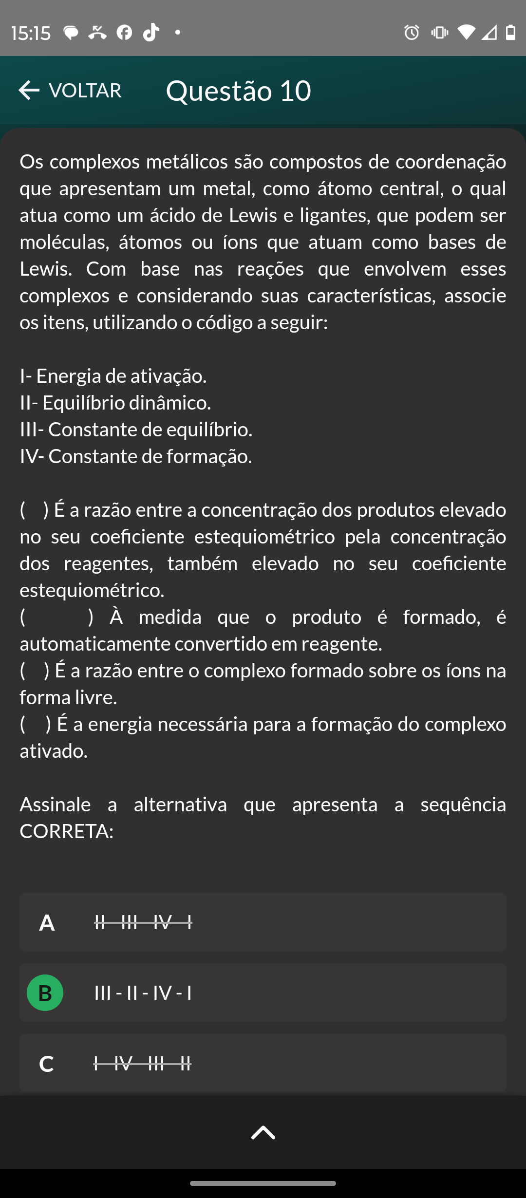 Os complexos metálicos são compostos de coordenação que apresentam um metal, como átomo central, O qual atua como um ácido de Lewis e ligantes, que podem ser moléculas, átomos ou íons que atuam como bases de Lewis. Com base nas reações que envolvem esses complexos e considerando suas características, associe os itens, utilizando código a seguir: Assinale a alternativa que apresenta a sequência CORRETA: ( ) É a razão entre a concentração dos produtos elevado no seu coeficiente estequiométrico pela concentração dos reagentes, também elevado no seu coeficiente estequiométrico. ( ) À medida que O produto é formado, é automaticamente convertido em reagente. ( ) É a razão entre complexo formado sobre os íons na forma livre. ( ) É a energia necessária para a formação do complexo ativado. A IV B C C IV III D II I