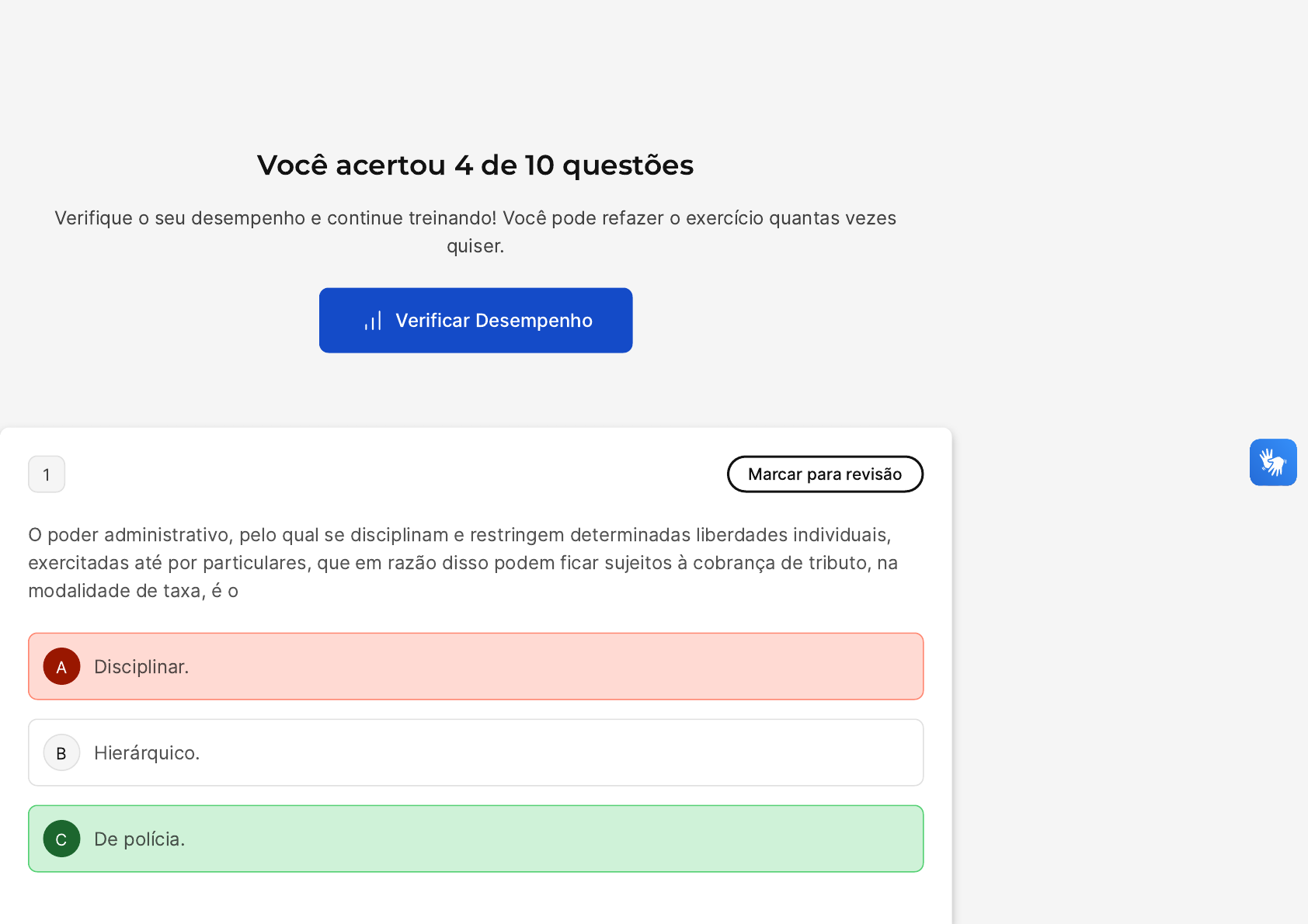 Você acertou 4 de 10 questões Verifique o seu desempenho e continue treinando! Você pode refazer o exercício quantas vezes quiser. Verificar Desempenho A B C 1 Marcar para revisão O poder administrativo, pelo qual se disciplinam e restringem determinadas liberdades individuais, exercitadas até por particulares, que em razão disso podem ficar sujeitos à cobrança de tributo, na modalidade de taxa, é o Disciplinar. Hierárquico. De polícia. D E A B Regulamentar. Discricionário. Resposta incorreta Opa! A alternativa correta é a letra C. Confira o gabarito comentado! Gabarito Comentado O poder de polícia é o poder administrativo que permite ao Estado restringir e disciplinar liberdades individuais em prol do interesse público. Nesse contexto, o poder de polícia pode ser exercido até mesmo por particulares, que podem ficar sujeitos à cobrança de tributos na modalidade de taxa. Portanto, a alternativa correta é a "C", que se refere ao poder de polícia. 2 Marcar para revisão A aplicação de uma penalidade administrativa a um servidor pela prática de infração administrativa prevista em lei configura manifestação do poder Disciplinar do Estado. Hierárquico do Estado. C D E De polícia do Estado. De punir do Estado. Discricionário do Estado. Resposta incorreta Opa! A alternativa correta é a letra A. Confira o gabarito comentado! Gabarito Comentado A alternativa correta é a letra A. O poder disciplinar do Estado é o que permite a aplicação de penalidades administrativas a servidores que cometem infrações previstas em lei. Este poder é exercido com o objetivo de manter a ordem e a disciplina dentro da administração pública. As outras alternativas não são corretas porque o poder hierárquico se refere à relação de subordinação entre os diferentes níveis da administração, o poder de polícia é o que permite ao Estado limitar o exercício dos direitos individuais em benefício do interesse público, o poder de punir é uma característica do poder penal do Estado e não do administrativo, e o poder discricionário é o que permite ao administrador público tomar decisões com base em sua própria avaliação e julgamento. 3 Marcar para revisão Considere a seguinte situação: Pedro, servidor público, incide em acumulação remunerada de cargos públicos. O ato de sua punição pode se graduar entre a demissão ou a devolução dos valores A B C D E percebidos, a critério da autoridade. Neste exemplo, o poder discricionário do ato administrativo de punição encontra-se no seguinte elemento: Forma Finalidade Objeto Competência Motivo Resposta correta Parabéns, você selecionou a alternativa correta. Confira o gabarito comentado! Gabarito Comentado O poder discricionário do ato administrativo de punição, neste caso, encontra-se no elemento "Motivo". Isso porque a autoridade tem a liberdade de escolher entre a demissão ou a devolução dos valores percebidos como forma de punição para Pedro, que acumulou cargos públicos de forma remunerada. Portanto, a decisão sobre qual punição aplicar é baseada no motivo da infração cometida por Pedro, o que caracteriza o poder discricionário no elemento "Motivo". A B C D E 4 Marcar para revisão A interpretação dos princípios no ordenamento jurídico é uma questão importante no direito. Sobre as características dos princípios, qual a diferença entre o que são expressos e os que são implícitos? Princípios expressos são aqueles reconhecidos pela doutrina e pela jurisprudência a partir da interpretação sistemática do ordenamento jurídico, enquanto princípios implícitos são mencionados explicitamente nas leis. Princípios expressos e princípios implícitos são a mesma coisa e podem ser usados indistintamente. Princípios expressos são aqueles mencionados explicitamente nas leis, enquanto princípios implícitos são reconhecidos pela doutrina e pela jurisprudência a partir da interpretação sistemática do ordenamento jurídico. Princípios expressos e princípios implícitos são a mesma coisa e podem ser usados indistintamente. Princípios expressos são citados na doutrina jurídica, enquanto princípios implícitos são mencionados nas leis. Resposta correta Parabéns, você selecionou a alternativa correta. Confira o gabarito comentado! A B C Gabarito Comentado Princípios expressos são aqueles expressamente mencionados no texto de uma norma como, por exemplo, os princípios da Administração Pública, citados no art. 37 da CRFB. Princípios implícitos são os princípios reconhecidos pela doutrina e pela jurisprudência a partir da interpretação sistemática do ordenamento jurídico, como os princípios da razoabilidade e da proporcionalidade, da segurança jurídica. 5 Marcar para revisão �FGV/2020� Um particular proprietário de veículo automotor, atendendo ao que determina o ordenamento jurídico, levou seu veículo para ser submetido à fiscalização pelo DETRAN no Estado da Federação Alfa. No caso em tela, o poder administrativo que embasou a realização de vistoria veicular é o poder: De polícia, para adequar e condicionar a propriedade individual em prol do interesse público. De império, que emana do Legislativo em razão de sua supremacia sobre o Executivo. Hierárquico, para limitar direitos individuais de acordo com a discricionariedade do administrador público. D E Regulamentar, que permite inovação na atividade legislativa para satisfazer à coletividade. Disciplinar, que pode ser delegado para pessoa jurídica de direito privado para alcançar o bem comum. Resposta correta Parabéns, você selecionou a alternativa correta. Confira o gabarito comentado! Gabarito Comentado O poder de polícia é o poder administrativo que permite ao Estado limitar o exercício de direitos individuais em prol do interesse público. No caso apresentado, o proprietário de um veículo automotor levou seu veículo para ser submetido à fiscalização pelo DET