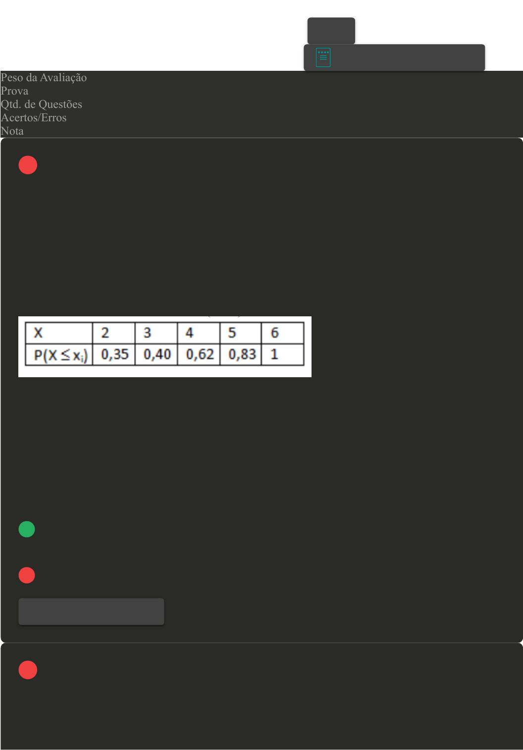 Prova Impressa GABARITO | Avaliação Final (Objetiva) - Individual (Cod.:955580) Peso da Avaliação 4,00 Prova 80540062 Qtd. de Questões 12 Acertos/Erros 8/4 Nota 8,00 De início, a teoria da probabilidade era utilizada para prever resultados de jogos de azar. Contudo, com o passar do tempo, as aplicações de probabilidade se expandiram notavelmente, sobretudo em processos de tomada de decisão ligados a acontecimentos sujeitos aos efeitos do acaso, tais como previsão meteorológica e de safras agrícolas; risco de apólices de seguro; cotação de ações em bolsa de valores; controle de qualidade; marketing, entre outros. Portanto, as probabilidades têm a função de mostrar a chance de ocorrência de um evento. Considere a distribuição de probabilidade acumulada a seguir e calcule P(X>3): Com base nesse cálculo, assinale a alternativa CORRETA: A P(X > 3) = 0,65. B P(X > 3) = 0,75. C P(X > 3) = 0,60. D P(X > 3) = 0,38. Os dados são pequenos poliedros gravados com determinadas instruções. O dado mais clássico é o cubo (seis faces), gravado com números de um a seis. Imagine que, em um suposto lançamento de um dado, obteve-se um número ímpar. VOLTAR A+ Alterar modo de visualização 1 Revisar Conteúdo do Livro 2 30/04/2024, 18:44 Avaliação Final (Objetiva) - Individual about:blank 1/7 Sobre a probabilidade do número ímpar sorteado, ser primo, assinale a alternativa CORRETA: A A probabilidade é de 1/3. B A probabilidade é de 2/3. C A probabilidade é de 1/2. D A probabilidade é de 1. A turma A tem 48 alunos e a turma B tem 32. As duas turmas fizeram uma prova e a média aritmética das notas dos alunos da turma A foi de 5,0 e dos alunos da turma B foi de 6,5. Qual é a média aritmética das notas de todos os 80 alunos? Acerca do resultado, assinale a alternativa CORRETA: A 5,9. B 5,8. C 5,6. D 6,1. Formulário - Probabilidade e Estatística (Saulo)Clique para baixar o anexo da questão Média é um valor significativo de uma lista de valores. Se todos os números da lista são os mesmos, então este número será a média dos valores. Em outros casos, a média é calculada através da combinação de valores de um conjunto de um modo específico e gerando um valor, a média do conjunto. Numa coleta estatística, foram obtidos os seguintes resultados: 14 - 10 - 27 - 25 - 22 - 19 - 18 - 28 - 32 - 18 - 12 - 19 - 32 - 18. Qual a média dessa amostra? Acerca do resultado, assinale a alternativa CORRETA: A A média dessa amostra é 29. Revisar Conteúdo do Livro 3 4 30/04/2024, 18:44 Avaliação Final (Objetiva) - Individual about:blank 2/7 B A média dessa amostra é 21. C A média dessa amostra é 19. D A média dessa amostra é 24. A probabilidade é um campo da matemática que estuda as chances de ocorrência de um evento qualquer A, dentro de um espaço amostal S. Em um experimento aleatório, em que P(A) representa a probabilidade de ocorrer A, n(S) é o número de elementos do espaço amostral e n(A) é o número de elementos de A. Assinale a alternativa CORRETA que contém uma das propriedades relacionadas à probabilidade de A: A P(A) < 1. B P(A) = 1. C 0 ≤ P(A) ≤ 1. D 0 < P(A) < 1. Em um grandioso baile de formatura, os organizadores notaram que a razão entre o número de homens e o número de mulheres presentes no início do evento era de 3:5. Durante o baile, nenhum homem e nenhuma mulher saiu ou entrou. Ao final do baile, os organizadores observaram um aumento de mais 120 homens e que 100 mulheres deixaram o local, de modo que a razão entre o número de homens e o número de mulheres presentes depois disto passou a ser 9:10. Qual o número total de pessoas que estavam presentes durante o baile? Acerca do resultado, assinale a alternativa CORRETA: A Estavam presentes durante o baile 980 pessoas. B Estavam presentes durante o baile 1240 pessoas. 5 6 30/04/2024, 18:44 Avaliação Final (Objetiva) - Individual about:blank 3/7 C Estavam presentes durante o baile 890 pessoas. D Estavam presentes durante o baile 1120 pessoas. Suponha que as alturas dos estudantes de uma escola de Ensino Médio seguem uma distribuição normal com média de 1,65 m e desvio padrão 0,30 m. Selecionando um estudante ao acaso, calcule a probabilidade dele ter menos de 1,50 m. Com base nesse cálculo, assinale a alternativa CORRETA: A A probabilidade é de 44,46%. B A probabilidade é de 53,98%. 7 30/04/2024, 18:44 Avaliação Final (Objetiva) - Individual about:blank 4/7 C A probabilidade é de 30,85%. D A probabilidade é de 69,15%. Numa olaria existem três máquinas destinadas à produção de tijolos de seis furos. A máquina A produz diariamente 1.000 tijolos, a B 4.000 tijolos e a C 5.000 tijolos. Sabe-se que a máquina A produz 4% de tijolos defeituosos, a B 3% e a C 1%. Qual a probabilidade de, ao final do dia, o chefe do setor de qualidade sortear um tijolo defeituoso? Assinale a alternativa CORRETA: A A probabilidade é de 1,5%. B A probabilidade é de 2,1%. C A probabilidade é de 1,2%. D A probabilidade é de 1,8%. A história da teoria das probabilidades teve início com os jogos de cartas, de dados e de roleta. Esse é o motivo da grande existência de exemplos de jogos de azar no estudo da probabilidade. A teoria da probabilidade permite que se calcule a chance de ocorrência de um número em um experimento aleatório. Considere a variável aleatória X com a seguinte distribuição de probabilidade e calcule o valor esperado dessa variável. Revisar Conteúdo do Livro 8 9 30/04/2024, 18:44 Avaliação Final (Objetiva) - Individual about:blank 5/7 Com base nesse cálculo, assinale a alternativa CORRETA: A O valor esperado é 5,9. B O valor esperado é 7. C O valor esperado é 5,4. D O valor esperado é 8,4. Em um encontro de jovens, os organizadores notaram que a razão entre o número de rapazes e moças presentes no evento foi 4:5. Se houvessem mais 14 homens, a razão entre o número de rapazes e moças seria igual a 1, ou seja, haveria o mesmo número de moç