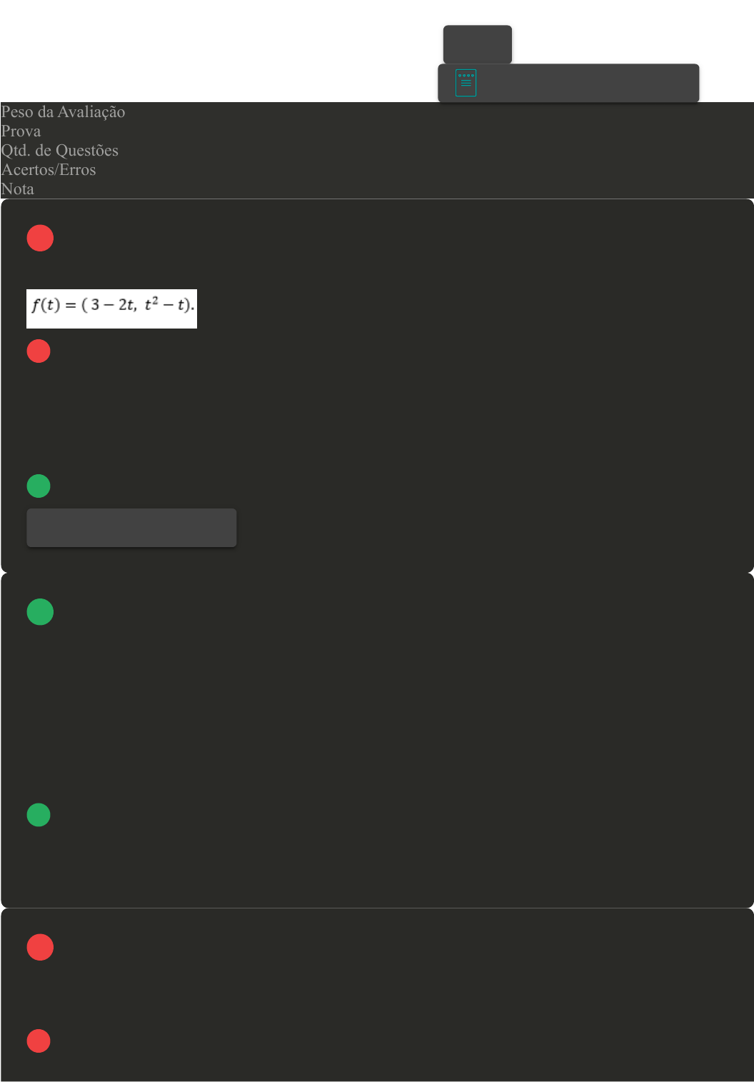 Prova Impressa GABARITO | Avaliação Final (Objetiva) - Individual (Cod.:884355) Peso da Avaliação 3,00 Prova 75099384 Qtd. de Questões 12 Acertos/Erros 2/10 Nota 2,00 O movimento de uma partícula sobre o plano no ponto (x, y) é dado por uma função vetorial que depende de tempo t em segundos. Determine o ponto (x, y) da posição inicial da partícula e o instante de tempo que a partícula está no ponto (-7, 20), sabendo que a função movimento da partícula é: A A posição inicial é (1, 0) e a partícula está no ponto (-7, 20) quando t = 0 segundos. B A posição inicial é (-3, 6) e a partícula está no ponto (-7, 20) quando t = 10 segundos. C A posição inicial é (5, -2) e a partícula está no ponto (-7, 20) quando t = 15 segundos. D A posição inicial é (3, 0) e a partícula está no ponto (-7, 20) quando t = 5 segundos. No estudo de integrais, há uma conexão entre as integrais duplas com integrais de linha de um campo vetorial. Assinale a alternativa CORRETA que apresenta o teorema que faz essa conexão e torna a resolução do exercício mais simples: A Teorema de Conexão. B Teorema de Fubini. C Teorema de Green. D Teorema de Newton. O centro de massa de um objeto é o ponto onde este objeto fica em equilíbrio, caso esse objeto seja homogêneo. Determine a coordenada y do centro de massa de uma lâmina triangular com vértices (0, 0), (1, 0) e (0, 2), sabendo que a função densidade é f (x, y) = 3 - x + 2y e que a massa do objeto é igual a m = 4: A 19/6 VOLTAR A+ Alterar modo de visualização 1 Revisar Conteúdo do Livro 2 3 14/05/2024, 15:59 Avaliação Final (Objetiva) - Individual about:blank 1/6 B 24/19 C 19/24 D 6/19 Assim como acontece com as integrais duplas, quando calculamos uma integral tripla, precisamos utilizar certas regras. Sobre o valor da integral tripla apresentada, analise as opções a seguir e, em seguida, assinale a alternativa CORRETA: A Somente a opção IV está correta. B Somente a opção III está correta. C Somente a opção I está correta. D Somente a opção II está correta. Tabela: Derivados, Integrais e Identidades Trigonométricas1Clique para baixar o anexo da questão O teorema de Gauss muitas vezes é chamado de Teorema da divergência, pois transforma uma integral de superfície de um campo vetorial em uma integral tripla do divergente desse campo Revisar Conteúdo do Livro 4 Revisar Conteúdo do Livro 5 14/05/2024, 15:59 Avaliação Final (Objetiva) - Individual about:blank 2/6 vetorial, ou seja, o Teorema de Gauss relaciona duas integrais: A Somente a opção III está correta. B Somente a opção II está correta. C Somente a opção IV está correta. D Somente a opção I está correta. Desde que as hipóteses sejam satisfeitas, podemos utilizar o Teorema de Gauss para calcular o fluxo exterior do um campo vetorial através de uma superfície. Determine o fluxo exterior da superfície delimitada pelos planos coordenados e pelos planos x=1, y=2 e z=4 e pelo campo de vetores: A O fluxo exterior é igual a 32. B O fluxo exterior é igual a 16. C O fluxo exterior é igual a 64. D O fluxo exterior é igual a 8. O momento de inércia de um corpo é o grau de dificuldade que o corpo tem de alterar o seu estado de movimento. Podemos calcular o momento de inércia em torno do eixo x e do eixo y. Determine o momento de inércia de um disco homogêneo com centro (0, 0) e raio igual a 2 e com densidade f (x, y) = 3 em torno do eixo x: Revisar Conteúdo do Livro 6 Revisar Conteúdo do Livro 7 14/05/2024, 15:59 Avaliação Final (Objetiva) - Individual about:blank 3/6 A 8 pi. B 12 pi. C 6 pi. D 4 pi. Chamado de Teorema da Divergência, estabelece uma relação entre uma integral tripla sobre um sólido W com uma integral de superfície em sua fronteira. Esse teorema é um dispositivo de cálculo para modelos físicos tais como o fluxo de fluidos, fluxos de campos elétricos ou magnéticos e calor. Assinale a alternativa CORRETA que apresenta esse teorema: A Teorema da Iteração. B Teorema de Newton. C Teorema de Gauss. D Teorema da Conexão. Uma das aplicações de derivada na física é a velocidade de uma partícula, porém outra aplicação muito utilizada de derivada é a reta tangente. Determine a reta tangente da função vetorial: A A reta tangente é (1, 3 + t, 2t). B A reta tangente é 4 + 3t. C A reta tangente é 3 + 4t. D A reta tangente é (t, 1 + 3t, 2). Revisar Conteúdo do Livro 8 Revisar Conteúdo do Livro 9 Revisar Conteúdo do Livro 14/05/2024, 15:59 Avaliação Final (Objetiva) - Individual about:blank 4/6 O comprimento do arco da curva A Somente a opção III é correta. B Somente a opção I é correta. C Somente a opção IV é correta. D Somente a opção II é correta. (ENADE, 2014) Deseja-se pintar a superfície externa e lateral de um monumento em forma de um paraboloide, que pode ser descrita pela equação z = x² + y², situada na região do espaço de coordenadas cartesianas (x, y, z) dada pela condição z <= 9. Os eixos coordenados estão dimensionados em metros e gasta-se um litro e meio de tinta a cada metro quadrado de área da superfície a ser pintada. A quantidade de tinta, em litros, necessária para se pintar a superfície lateral do monumento é dada pela integral dupla: 10 Revisar Conteúdo do Livro 11 14/05/2024, 15:59 Avaliação Final (Objetiva) - Individual about:blank 5/6 A Item D. B Item C. C Item A. D Item B. (ENADE, 2011) Em um plano de coordenadas cartesianas xOy, representa-se uma praça de área P, que possui em seu interior um lago de área L, limitado por uma curva C fechada, suave, orientada no sentido contrário ao dos ponteiros de um relógio. Considere que, sobre o lago, atua um campo de forças F(x,y)=(-y, x). Supondo que T representa o trabalho realizado por F(x,y) para mover uma partícula uma vez ao longo da curva C e que, comparando-se apenas os valores numéricos das grandezas, a área não ocupada pelo lago é igual a T/2, conclui-se que: A P=2T B T=L C P=T D 
