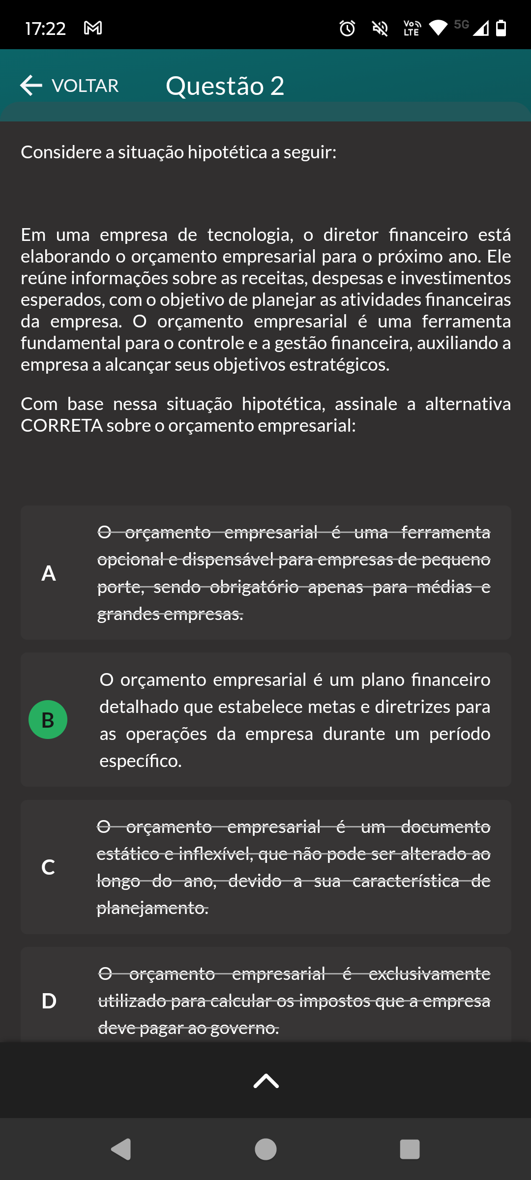 Em uma empresa de tecnologia, diretor financeiro está elaborando orçamento empresarial para próximo ano. Ele reúne informações sobre as receitas, despesas e investimentos esperados, com objetivo de planejar as atividades financeiras da empresa. O orçamento empresarial é uma ferramenta fundamental para controle e a gestão financeira, auxiliando a empresa a alcançar seus objetivos estratégicos. Com base nessa situação hipotética, assinale a alternativa CORRETA sobre orçamento empresarial: a- orçamento empresarial é uma ferramenta opcional e dispensável para empresas de pequeno porte, sendo obrigatório apenas para médias e grandes empresas. b- O orçamento empresarial é um plano financeiro detalhado que estabelece metas e diretrizes para as operações da empresa durante um período específico. c- orçamento empresarial é um documento estático e inflexível, que não pode ser alterado ao longo do ano, devido a sua característica de planejamento. d- orçamento empresarial é exclusivamente utilizado para calcular os impostos que a empresa deve ao governo.