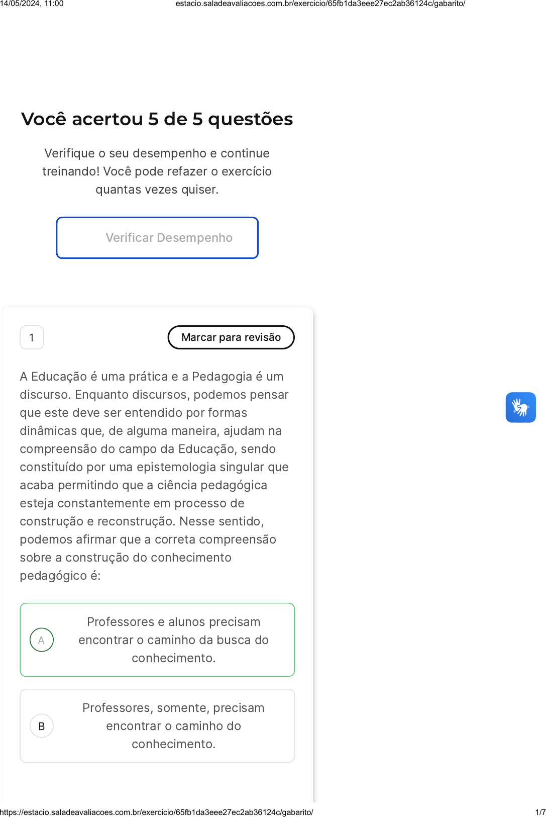 Você acertou 5 de 5 questões Verifique o seu desempenho e continue treinando! Você pode refazer o exercício quantas vezes quiser. Verificar Desempenho A B 1 Marcar para revisão A Educação é uma prática e a Pedagogia é um discurso. Enquanto discursos, podemos pensar que este deve ser entendido por formas dinâmicas que, de alguma maneira, ajudam na compreensão do campo da Educação, sendo constituído por uma epistemologia singular que acaba permitindo que a ciência pedagógica esteja constantemente em processo de construção e reconstrução. Nesse sentido, podemos afirmar que a correta compreensão sobre a construção do conhecimento pedagógico é: Professores e alunos precisam encontrar o caminho da busca do conhecimento. Professores, somente, precisam encontrar o caminho do conhecimento. 14/05/2024, 11:00 estacio.saladeavaliacoes.com.br/exercicio/65fb1da3eee27ec2ab36124c/gabarito/ https://estacio.saladeavaliacoes.com.br/exercicio/65fb1da3eee27ec2ab36124c/gabarito/ 1/7 C D E Alunos, somente, precisam encontrar o caminho do conhecimento. O caminho do conhecimento não depende nem do aluno nem do professor. Cientistas e estudiosos fora da prática devem estabelecer os debates e construir o saber pedagógico. Resposta correta Parabéns, você selecionou a alternativa correta. Confira o gabarito comentado! Gabarito Comentado A alternativa correta é a letra A� "Professores e alunos precisam encontrar o caminho da busca do conhecimento". Isso se dá porque a construção do conhecimento pedagógico é um processo dinâmico e contínuo que envolve tanto os professores quanto os alunos. A Pedagogia, sendo um discurso, precisa ser compreendida e aplicada de maneira dinâmica, permitindo a constante construção e reconstrução do conhecimento. Portanto, tanto professores quanto alunos têm um papel ativo nesse processo, buscando juntos o caminho do conhecimento. 2 Marcar para revisão 14/05/2024, 11:00 estacio.saladeavaliacoes.com.br/exercicio/65fb1da3eee27ec2ab36124c/gabarito/ https://estacio.saladeavaliacoes.com.br/exercicio/65fb1da3eee27ec2ab36124c/gabarito/ 2/7 A B C D E Que elemento está presente na definição de Filosofia por diferentes autores e em diferentes épocas? A importância do conteúdo em detrimento da forma. Conhecimento em prol da humanidade. A beleza da verdade eterna. A constante melhoria da raça humana. A base da construção da ciência. Resposta correta Parabéns, você selecionou a alternativa correta. Confira o gabarito comentado! Gabarito Comentado A alternativa correta é "Conhecimento em prol da humanidade". A Filosofia, em diferentes épocas e por diversos autores, é frequentemente definida como uma busca pelo conhecimento que beneficia a humanidade. Ela busca entender e explicar os fenômenos do mundo e da existência humana, sempre com o objetivo de contribuir para o bem-estar e o progresso da humanidade. Portanto, o elemento comum nas definições de Filosofia é o conhecimento em prol da humanidade. Questão 3 de 5 Corretas �5� Em branco �0� 1 2 3 4 5 Exercicio Pedagogia Como Ciência Da Educação Sair 14/05/2024, 11:00 estacio.saladeavaliacoes.com.br/exercicio/65fb1da3eee27ec2ab36124c/gabarito/ https://estacio.saladeavaliacoes.com.br/exercicio/65fb1da3eee27ec2ab36124c/gabarito/ 3/7 A B C D E 3 Marcar para revisão Como a Pedagogia do Sujeito encara a finalidade da Educação? Não se deve enfatizar resultados, pois não há metodologia adequada para testá-los. Os resultados imediatos habilitarão o aluno para o mercado e essa é a finalidade da Educação. O caráter utilitário é essencial à objetividade e à eficiência em qualquer treinamento. A finalidade da Educação não é a de desenvolver objetos, e sim sujeitos. Todas as alternativas estão incorretas. Resposta correta Parabéns, você selecionou a alternativa correta. Confira o gabarito comentado! Gabarito Comentado A Pedagogia do Sujeito entende que a finalidade da Educação não é a de desenvolver objetos, mas sim sujeitos. Isso significa que a educação deve ser centrada no indivíduo, em seu desenvolvimento integral e em sua formação como ser humano, e não apenas em resultados ou habilidades específicas. Portanto, a 14/05/2024, 11:00 estacio.saladeavaliacoes.com.br/exercicio/65fb1da3eee27ec2ab36124c/gabarito/ https://estacio.saladeavaliacoes.com.br/exercicio/65fb1da3eee27ec2ab36124c/gabarito/ 4/7 A B C D E alternativa D é a correta, pois reflete essa visão da Pedagogia do Sujeito sobre a finalidade da Educação. 4 Marcar para revisão A Educação precisa ser pensada na percepção do sujeito. Essa palavra que parece corriqueira deve ser interpretada à luz da Filosofia para que possa ser corretamente aplicada. Nesse sentido, quando tratamos do sujeito, devemos analisar que: Um sujeito nada é sem o outro. Um sujeito depende de tudo. Tudo depende do outro. O outro não precisa existir. Sujeito é sinônimo de pessoa, logo, tratamos como a valorização das pessoas ao tratar o entendimento de sujeito. Resposta correta Parabéns, você selecionou a alternativa correta. Confira o gabarito comentado! Gabarito Comentado 14/05/2024, 11:00 estacio.saladeavaliacoes.com.br/exercicio/65fb1da3eee27ec2ab36124c/gabarito/ https://estacio.saladeavaliacoes.com.br/exercicio/65fb1da3eee27ec2ab36124c/gabarito/ 5/7 A B C A alternativa correta é "Um sujeito nada é sem o outro". Isso se deve ao fato de que, na Filosofia, o conceito de sujeito é entendido como um ser que se relaciona com outros, e essa relação é fundamental para a sua existência e identidade. Portanto, um sujeito não pode ser compreendido isoladamente, mas sempre em relação com outros sujeitos. Essa compreensão é essencial para a Educação, pois permite valorizar a interação e a cooperação entre os indivíduos no processo de aprendizagem. 5 Marcar para revisão Em relação à Epistemologia, indique a única afirmação correta: Originada como apontamento das condições necessárias à pr