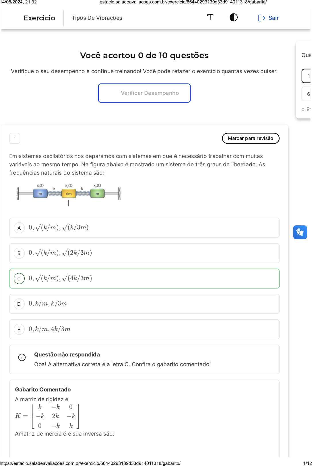 Você acertou 0 de 10 questões Verifique o seu desempenho e continue treinando! Você pode refazer o exercício quantas vezes quiser. Verificar Desempenho A B C D E 1 Marcar para revisão Em sistemas oscilatórios nos deparamos com sistemas em que é necessário trabalhar com muitas variáveis ao mesmo tempo. Na figura abaixo é mostrado um sistema de três graus de liberdade. As frequências naturais do sistema são: 0, √(k/m), √(k/3m) 0, √(k/m), √(2k/3m) 0, √(k/m), √(4k/3m) 0, k/m, k/3m 0, k/m, 4k/3m Questão não respondida Opa! A alternativa correta é a letra C. Confira o gabarito comentado! Gabarito Comentado A matriz de rigidez é Amatriz de inércia é e sua inversa são: K = ⎡ ⎢ ⎣ k −k 0 −k 2k −k 0 −k k ⎤ ⎥ ⎦ Que Em 1 6 Exercicio Tipos De Vibrações Sair 14/05/2024, 21:32 estacio.saladeavaliacoes.com.br/exercicio/66440293139d33d914011318/gabarito/ https://estacio.saladeavaliacoes.com.br/exercicio/66440293139d33d914011318/gabarito/ 1/12 A matriz dinâmica é: Para encontrar a equação característica é preciso resolver o determinante e igualá-lo a zero: Ξ = ⎡ ⎢ ⎣ m 0 0 0 6m 0 0 0 m ⎤ ⎥ ⎦ ; Ξ−1 = ⎡ ⎢ ⎣ (1/m) 0 0 0 (1/(6m)) 0 0 0 (1/m) ⎤ ⎥ ⎦ A = Ξ−1 K A = ⎡ ⎢ ⎣ (1/m) 0 0 0 (1/6m) 0 0 0 (1/m) ⎤ ⎥ ⎦ ⎡ ⎢ ⎣ k −k 0 −k 2k −k 0 −k k ⎤ ⎥ ⎦ = ⎡ ⎢ ⎣ (k/m) −(k/m) 0 −(k/6m) (k/3m) −(k/6m) 0 −(k/m) (k/m) ⎤ ⎥ ⎦ det(A − λI) = ∣ ∣ ∣ ∣ ∣ {(k/m) − λ} −(k/m) 0 −(k/6m) {(k/3m) − λ} −(k/6m) 0 −(k/m) {(k/m) − λ} ∣ ∣ ∣ ∣ ∣ = 0 2 Marcar para revisão Sistemas oscilatórios podem ser encontrados em diversas situações. Um exemplo clássico são o sistema de amortecimento presente nos veículos. Sabendo disso, as frequências naturais do Sistema Automóvel representado na figura abaixo sẵ Os autovetores correspondentes sẵo, na ordem: O vetor grau de liberdade está arrumado da seguinte forma: Avaliando os valores, e conhecendo o vetor grau de liberdade, é correto afirmar que, enquanto o veículo trafega em uma pista ondulada de perfil senoidal, à medida que sua velocidade aumenta, o primeiro e oúltimo grau de liberdade a entrar em ressonância são, respectivamente Agora considere no modelo do automóvel de quatro graus de liberdade, as molas que representam os pneus foram substituídas por outras mais rigidas, enquanto todos os outros parâmetros permaneceram os mesmos. Essa mudança alterou o com portamento oscilatório do sistema. Quanto às frequências naturais, o resultado esperado é que: f1 = 1, 04 Hz, f2 = 1, 45 Hz, f3 = 8, 15 Hz e f4 = 10, 89 Hz u1 = ⎡ ⎢⎢⎢⎢ ⎣ 1 −0, 5132 0, 1281 0, 0199 ⎤ ⎥⎥⎥⎥ ⎦ , u2 = ⎡ ⎢⎢⎢⎢ ⎣ 0, 8014 1 −0, 0290 0, 2715 ⎤ ⎥⎥⎥⎥ ⎦ , u3 = ⎡ ⎢⎢⎢⎢ ⎣ −0, 0138 −0, 0142 0, 0005 1 ⎤ ⎥⎥⎥⎥ ⎦ , u4 = ⎡ ⎢⎢⎢⎢ ⎣ −0, 055 0, 0041 1 0, 0001 ⎤ ⎥⎥⎥⎥ ⎦ Z = ⎡ ⎢⎢⎢ ⎣ zch θ z1 z2 ⎤ ⎥⎥⎥ ⎦ zchez1 14/05/2024, 21:32 estacio.saladeavaliacoes.com.br/exercicio/66440293139d33d914011318/gabarito/ https://estacio.saladeavaliacoes.com.br/exercicio/66440293139d33d914011318/gabarito/ 2/12 A B C D E A B C As duas frequências naturais mais altas aumentem mais do que as duas mais baixas As duas frequências naturais mais altas aumentem menos do que as duas mais baixas Somente as duas frequências naturais mais baixas aumentam, enquanto que as duas mais altas permanecem as mesmas Somente as duas frequências naturais mais altas diminuem, enquanto que as duas mais baixas permanecem as mesmas Todos os valores das frequências naturais caem Questão não respondida Opa! A alternativa correta é a letra A. Confira o gabarito comentado! Gabarito Comentado A ressonância é identificada nos autovetores pela coordenada de maior valor absoluto, e examinando os valores, vê-se que o primeiro grau de liberdade a entrar em ressonância é , e o último é . zch z1 3 Marcar para revisão Quer-se instalar um conjunto de antenas de telefonia móvel que pesa 32 kg no alto de uma torre, e para cobrir a área desejada, é preciso que o equipamento esteja a 30 m de altura. A região é conhecida por registrar eventuais rajadas de vento que atingem 45 km/h, epara garantir o bom funcionamento, as oscilaçốes não podem ultrapassar 30 mm nessas condições. A torre é cilíndrica, e o diâmetro de sua seção transversal circular mede 1,5 m. Calcule qual deve ser a rigidez equivalente da torre, em kN/m, para atender os requisitos. Considere e desconsidere o amortecimento.ρAr = 1, 2 kg/m3 13,88 138,8 1.388 14/05/2024, 21:32 estacio.saladeavaliacoes.com.br/exercicio/66440293139d33d914011318/gabarito/ https://estacio.saladeavaliacoes.com.br/exercicio/66440293139d33d914011318/gabarito/ 3/12 D E A B 13.880 138.800 Questão não respondida Opa! A alternativa correta é a letra B. Confira o gabarito comentado! Gabarito Comentado A expressãoo para o cálculo da amplitude de oscilação é: A constante é igual a: Entâo: Afrequência de excitação a depende da velocidade do vento: Daí, tem-se que: A rigidez equivalente do postée, então: X = ( )[ ] ( ) = [ ] ⇒ (ω/ωn)2 = [1 − (ω/ωn)2]( ) (ω/ωn)2 [1 + ( )] = ( ) ⇒ (ω/ωn)2 = Φ ml (ω/ωn)2 1 − (ω/ωn)2 Xml Φ (ω/ωn)2 1 − (ω/ωn)2 Xml Φ Xml Φ Xml Φ (Xml/Φ) 1 + (Xml/Φ) Φ Φ = 0, 317ρArHD3 Φ = 0, 317(1, 20)(30)(1, 50)3 = 38, 52 (ω/ωn)2 = = 2, 43 × 10−2 ω/ωn = √2, 43 × 10−2 = 0, 156 (30 × 10−3) (32)/(38, 52) 1 + [(30 × 10−3) (32)/(38, 52)] ω = v = ( ) = 10, 47rad/s 0,4π D 0,4π (1,50) 45 3,6 ω/ωn = 0, 156 ⇒ ωn = = = 65, 86rad/sω 0,156 10,47 0,156 kθq = m2ω2 n = (32) (65, 862) = 138, 81kN/m 4 Marcar para revisão Sistemas matriciais são utilizados na resolução de sistemas com várias incógnitas. A equação característica do sistema de três graus de liberdade mostrado na figura abaixo é: λ3 − 8(k / m)λ2 + 8(k / m)2λ − (k / m)3 = 0 λ3 − 8