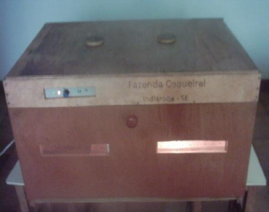 PROJETO DE CHOCADEIRA PARA 200 OVOS DE GALINHA CAIXA DE MADEIRA Autor: Randolfo Ribeiro PROJETO DE CHOCADEIRA EM CAIXA DE MADEIRA Capacidade 200 ovos de galinha Autor: Randolfo Ribeiro Este projeto contém todas as medidas e materiais envolvidos na construção dessa chocadeira de ovos ou incubadora. Vamos utilizar uma caixa de madeira com as seguintes medidas externa: Começamos pela grade de rolagem dos ovos. Definimos a quantidade de ovos que vamos processar em 200 Ovos de Galinha. Período de incubação: 21 dias. Perímetro do ovo = 13,6 cm, meio perímetro = 6,8 cm, adotado 6,5 cm. A distância da rolagem é exatamente metade do perímetro do ovo de galinha deitado. Calculamos o tamanho da grade de rolagem dos ovos de galinha. Você vai fazer uma grade para rolagem dos ovos. Usando fio de 03 mm. O fio de arame galvanizado rígido. Pode usar outro processo também. Com as seguintes dimensões. Definimos o tamanho da bandeja dos ovos. Medidas internas da bandeja 99 cm X 60 cm Medidas externas da bandeja 102 cm X 63 cm Cortar doze madeiras com: Duas de 52 X 03 X 1,5 cm para apoio da bandeja Duas de 102 X 03 X 1,5 cm para fazer a bandeja Duas de 60 X 03 X 1,5 cm para fazer a bandeja Duas de 99 X 01 X 01 cm para engradado interno Três de 58 X 01 X 01 cm para engradado interno Uma de 97 X 01 X 01 cm para engradado interno Colocar nesta armação uma tela furada e resistente de modo a suportar o peso dos ovos, pode ser de nylon ou de arame com vazamento de 0,5 cm quadrado. Prenda como você achar melhor. Lembre-se que para você incubar codornas a tela deve ser mais fina. Aspecto da bandeja mais a grade de rolagem Fazendo a caixa de madeira. Temos as medidas externas e as medidas internas que são: Medidas externas: 105,00 cm X 66,00 cm X 36,00 cm. Na largura retiro 03 cm. No comprimento retiro 03 cm. Na altura retiro 05 cm onde 03 cm são da madeira e 02 cm do espaço reservado ao isolante térmico, o isopor. Achamos estas medidas internas: 102,00 cm X 63,00 cm X 31,00 cm. Medidas das peças da caixa de madeira. Instalando a bandeja mais a grade de rolagem dentro da caixa de madeira. A fixação da madeira de apoio da bandeja deve ser com quatro parafusos, arruelas e porcas em cada lado, mas pode usar pregos adequados. Continuando o projeto: Observe as posições da lâmpada, do sensor, dos furos de ventilação, da madeira de apoio da bandeja. As lâmpadas são presas uma de cada lado, pode usar bocal de baquelita ou louça. Usar 04 lâmpadas de 60 W. Procure colocar o termômetro no mesmo nível do sensor. Observar a temperatura estabilizar em 37,8 ° C. Fazer 20 furos para ventilação de 01 cm de diâmetro na base; quatro próximos a lateral, quatro próximos a outra lateral e quatro no meio da base e dois nas cabeceiras dos recipientes de água conforme a figura acima. Observar que os recipientes de água não devem tampar os furos de ventilação. Colocar nos furos uma tela fina para evitar a entrada de insetos se for necessário. Fazer dois furos maiores no teto da caixa com 03 cm de diâmetro. Estes são os furos de ventilação superior, deve ser feita uma tampa móvel para este furo, pois ela será aberta gradualmente. A colocação do vidro, como visor, fica a critério do montador, contanto que considere a vedação usando massa de calafetar. O termômetro deve ser fixado no meio dos ovos para se obter uma melhor leitura. Para rolagem dos ovos, proceda da seguinte forma: Faça dois furos finos nas laterais da Chocadeira no sentido horizontal de modo a caber a chave que vai empurrar para um lado e para o outro a grade de rolagem dos ovos. Procurar fazer o furo alinhando com a grade de rolagem. A chave de rolagem deve ser fabricada com o arame ou o fio que usou na fabricação da grade de rolagem e deve ser rígido. Prospecto final. Identificação de todos os elementos envolvidos. Como fechar. Duas pequenas travas e dois roletes de pressão. Detalhes da dobradiça. Ficam localizadas na parte inferior da tampa. Para abrir a Chocadeira utilize um puxador. Detalhes da montagem da grade, realizar soldas nos locais indicados. Posição do visor. Ao nível dos ovos, de modo que o termômetro fique com o sensor de leitura nivelado com os ovos e a coluna de leitura fique visível no visor. COMO UTILIZAR A CHOCADEIRA. INSTALAÇÃO Instale sua chocadeira sobre uma mesa de madeira em local arejado. Não colocar em superfície fria, longe de raios solares e fortes ventos. OVOS Escolha ovos de galinha ou com boa média de postura, descartando a más poedeiras. Os ovos devem ser depositados com a ponta virada para baixo. Em um local fresco e arejado, coloque-os em um tabuleiro com areia fina. Os ovos devem ser virados duas vezes ao dia para que o ar em seu interior não cole na casca. UMIDADE O recipiente para água fornece umidade para a chocadeira e no meio da incubação deve-se completar seu nível da água, use uma mangueira fina pela tampa frontal, é importante que tenha umidade no interior da câmara de chocagem. Ovos de pato, marreco, cisne, ganso, aves aquáticas devem ser pulverizados com água morna em todas as viragens até o fim da incubação. Ovos de codorna devem se pulverizados com água morna entre o 10° e 15° dia de incubação, não pode ferver a água senão mata os ovos. VENTILAÇÃO No teto da chocadeira contém duas tampas de ventilação, estas tampas deverão permanecer fechadas durante as primeiras 48 horas, depois deste período abra metade dos furos e permaneça assim até o 10° dia da incubação depois abra totalmente até o fim da incubação. PRÉ-AQUECIMENTO Coloque água no recipiente até 01 cm da borda Coloque a bandeja mais a grade. Instale o controlador térmico, já adquirido, ou na parte superior ou na lateral. Instale o sensor no nível dos ovos. Instale o termômetro na face oposta ao do sensor no visor de modo a poder ser feito a leitura e posteriormente ser removido. Coloque as lâmpadas de 60 W. Feche a chocadeira com a tampa de ventilaçã