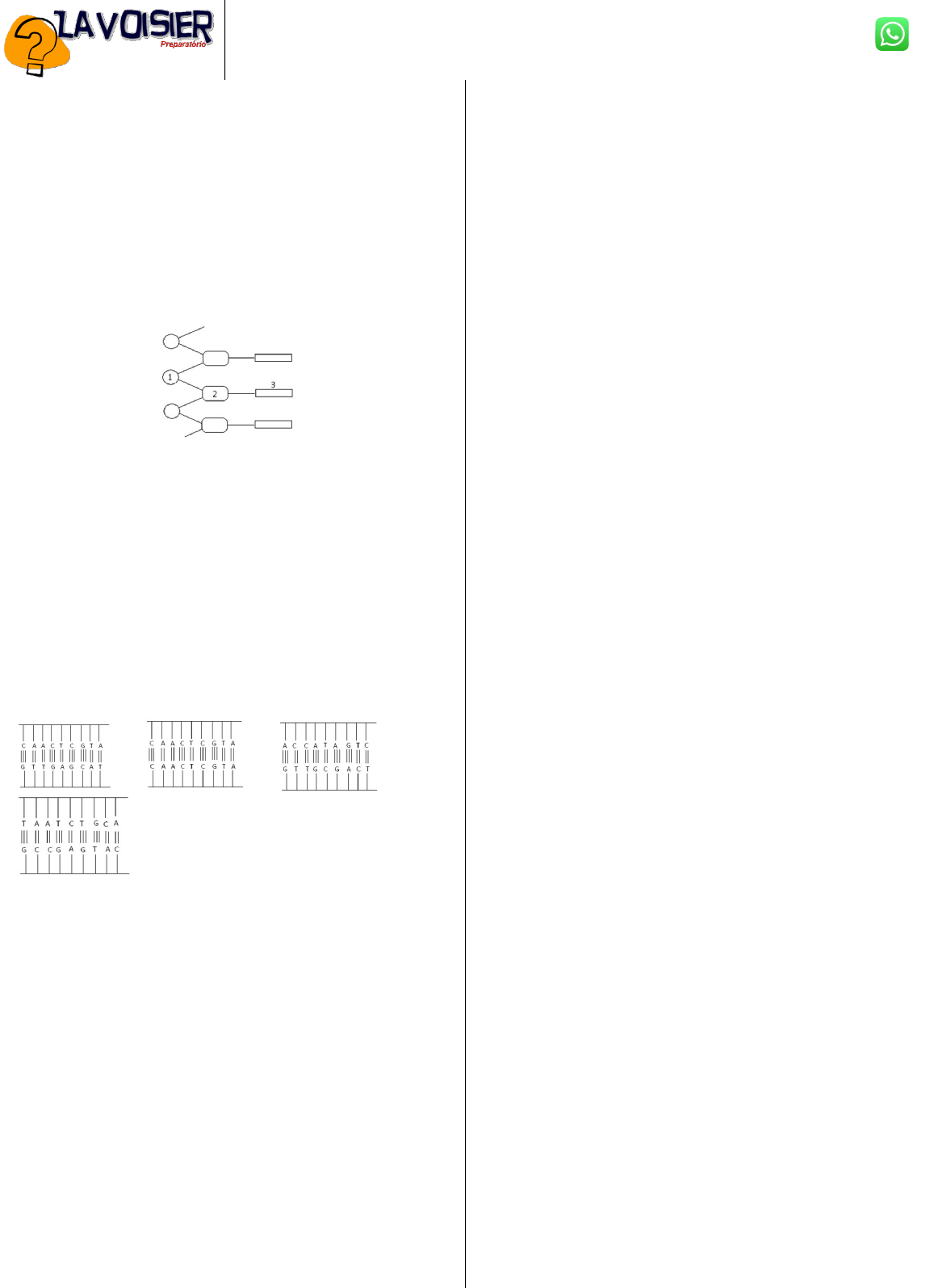 99 99165-2562 BIOLOGIA Ácidos Nucléicos 1) (PUCC-SP) Os itens abaixo referem-se à estrutura, composição e função dos ácidos nucleicos. • Estrutura: I) Dupla hélice; II) Cadeia simples. • Composição: 1) Presença de uracila; 2) Presença de timina. • Função: a) síntese de proteínas; b) transcrição gênica. São características do ácido ribonucleico: a) II – 2 – b b) I – 1 – a c) I – 2 – b d) II – 1 – a e) II – 1 – b 2) (PUC-PR) No esquema abaixo sobre a estrutura do DNA, os números 1, 2 e 3 representam, respectivamente: a) Base nitrogenada, desoxirribose e fosfato; b) Base nitrogenada, fosfato e desoxirribose; c) Fosfato, desoxirribose e base nitrogenada; d) Fosfato, base nitrogenada e desoxirribose; e) Desoxirribose, fosfato e base nitrogenada. 3) (Uerj) “Testes genéticos: a ciência se antecipa à doença. Com o avanço no mapeamento de 100 mil genes dos 23 pares de cromossomos do núcleo da célula (Projeto Genoma, iniciado em 1990, nos EUA), já é possível detectar por meio de exames de DNA (ácido desoxirribonucleico) a probabilidade de uma pessoa desenvolver doenças [...].” (O Globo, 10/08/1997). Sabe-se que o citado mapeamento é feito a partir do conhecimento da sequência de bases do DNA. O esquema abaixo que representa o pareamento típico de bases encontradas na molécula de DNA é: a) b) c) d) 4) Assinale a alternativa que contém as palavras que completam a frase abaixo: Existem cinco tipos principais de bases nitrogenadas: adenina, ______________, citosina, __________ e uracila. As duas primeiras possuem um duplo anel de átomos de carbono e derivam de uma substância chamada ____________, sendo, por isso, denominadas bases ______________. a) Guanina, timina, purina, púricas. b) Timina, guanina, pirimidina, púricas. c) Timina, guanina, pirimidina, púricas. d) Timina, guanina, púricas, pirimídicas. e) Guanina, timina, purina, pirimidina. 5) Assinale a alternativa incorreta: a) O nome ácido nucleico indica que as moléculas de DNA e RNA são ácidas e foram identificadas, a princípio, no núcleo das células. b) O DNA é encontrado no núcleo, formando os cromossomos e parte dos nucléolos, e também em pequena quantidade na mitocôndria e no cloroplasto. c) O ácido ribonucleico é encontrado no nucléolo, nos ribossomos, no citosol, nas mitocôndrias e nos cloroplastos. d) Tanto DNA como o RNA são formados pelo encadeamento de grande número de moléculas menores, os nucleotídeos. e) As bases existentes na molécula de DNA são a adenina, guanina, citosina e uracila. 6) As bases nitrogenadas podem ser divididas em bases púricas e pirimídicas. Assinale a alternativa que contém os nomes das bases pirimídicas. a) Adenina, citosina e timina; b) Adenina, timina e uracila; c) Guanina, timina e uracila; d) Citosina, timina e uracila; e) Citosina, timina e guanina. 7) São exemplos de ácidos nucleicos: a) Proteínas e lipídios. b) DNA e RNA. c) Monossacarídeos e dissacarídeos. d) Adenina e guanina. e) Timina e uracila. 8) Os ácidos nucleicos são formados por monômeros chamados de a) nucleopídeos. b) nucleoides. c) nucleotídeos. d) nucléolo. e) nucleoplasmas. 9) Os nucleotídeos são monômeros que formam os ácidos nucleicos. Analise as alternativas abaixo e marque aquela que cita os componentes básicos de um nucleotídeo. a) uma ribose, um grupo fosfato e uma timina. b) uma pentose, uma base nitrogenada e um grupo fosfato. c) uma pentose, um grupo fosfato e uma base pirimidina. d) uma ribose, um grupo fosfato e uma base purina. e) uma proteína, um carboidrato e um lipídeo. 10) (Uece) Os ácidos nucleicos são macromoléculas que compõem o material genético de todos os seres vivos. Sobre os ácidos nucleicos, assinale o correto. a) O DNA é replicado por meio de um processo denominado transcrição gênica. b) O RNA mensageiro (RNAm) é sintetizado a partir do RNA transportador (RNAt). c) Uma cadeia polipeptídica é o resultado da união de aminoácidos em função da sequência de códons do RNA mensageiro. d) Os vírus são seres unicelulares e seus ácidos nucleicos são muito importantes para estudos microbiológicos. 11) (Uece) Sobre os ácidos nucleicos, são feitas as seguintes afirmações: I. São macromoléculas, de elevada massa molecular, que possuem ácido fosfórico, açúcares e bases purínicas e pirimidínicas, em sua composição. II. Ocorrem em todas as células vivas e são responsáveis pelo armazenamento e transmissão da informação genética e por sua tradução, que é expressa pela síntese proteica. III. Encontram-se presentes no núcleo dos procariotos e dispersos no hialoplasma dos eucariotos. IV. Encontram-se, normalmente, organizados sob a forma de fita simples ou dupla. Das quatro afirmações anteriores, são verdadeiras: a) Apenas a I, a II e a IV. b) A I, a II, a III e a IV. c) Apenas a III e a IV. d) Apenas a I e a II. e) A II e a III. 12) Sabemos que existem dois tipos de ácidos nucleicos: o DNA e o RNA. A respeito dessas duas moléculas, marque a alternativa correta: a) O RNA é encontrado apenas na região do núcleo e no citosol. b) O DNA é encontrado apenas no interior do núcleo das células. c) Tanto o DNA quanto o RNA possuem em sua composição um monossacarídeo chamado de ribose. d) A base nitrogenada timina é exclusiva do DNA. e) A base nitrogenada guanina é exclusiva do RNA. 13) Sabemos que existem cinco diferentes tipos de bases nitrogenadas: adenina, guanina, citosina, timina e uracila. No DNA, observa-se que as bases nitrogenadas das cadeias polinucleotídicas unem-se de maneira bastante específica. A adenina, por exemplo, liga-se apenas à: a) adenina. b) timina. c) citosina. d) guanina. e) uracila. 14) O RNA, ácido ribonucleico, é um ácido nucleico relacionado com a síntese de proteínas. Existem diferentes tipos de RNA, cada um com uma função específica. Marque a alternativa que indica o nome do RNA que carrega a informação para a s
