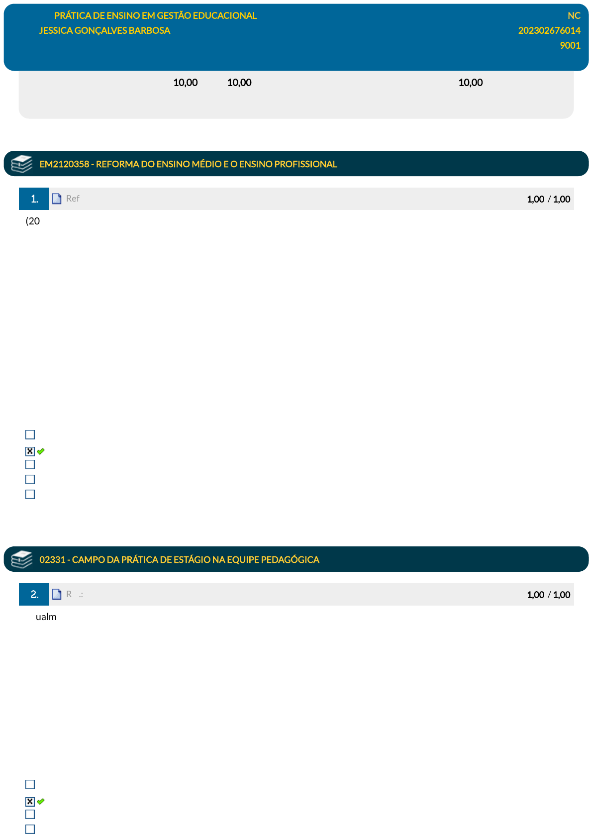 Disciplina: PRÁTICA DE ENSINO EM GESTÃO EDUCACIONAL NC Aluno: JESSICA GONÇALVES BARBOSA 202302676014 Turma: 9001 DGT0751_NC_202302676014 (AG) 20/11/2023 17:02:48 (F) Avaliação: 10,00 pts de 10,00 Nota SIA: 10,00 pts Dispositivo liberado pela Matrícula 202302676014 com o token 701606 em 20/11/2023 17:02:16. EM2120358 - REFORMA DO ENSINO MÉDIO E O ENSINO PROFISSIONAL 1. Ref.: 5558475 Pontos: 1,00 / 1,00 (2017/IESES/Prefeitura de Palhoça - SC/Professor) Leia as a�rmativas a seguir: I - A carga horária destinada ao cumprimento da Base Nacional Comum Curricular não poderá ser superior a 1.800 horas do total da carga horária do ensino médio, de acordo com a de�nição dos sistemas de ensino. II - O ensino da Língua Portuguesa e da Matemática será obrigatório nos três anos do ensino médio, inclusive às comunidades indígenas, com o objetivo de que ao longo do tempo as línguas maternas tornem-se obsoletas. III - Os currículos do ensino médio incluirão, obrigatoriamente, o estudo da Língua Inglesa e poderão ofertar outras línguas estrangeiras, em caráter optativo, preferencialmente o espanhol, de acordo com a disponibilidade de oferta, os locais e horários de�nidos pelos sistemas de ensino. IV - A Base Nacional Comum Curricular referente ao ensino médio incluirá obrigatoriamente estudos e práticas de Educação Física, Arte, Sociologia e Filoso�a. Assinale a alternativa correta II e III I, III e IV II e IV II, III e IV I, II e III 02331 - CAMPO DA PRÁTICA DE ESTÁGIO NA EQUIPE PEDAGÓGICA 2. Ref.: 6075866 Pontos: 1,00 / 1,00 Atualmente precisamos entender que a disciplina Estágio Supervisionado em Gestão e Coordenação de Ensino, deve superar a separação entre a teoria e a prática, pois precisamos entender o movimento teórico recente sobre a nova concepção de estágio. O estágio deve ser uma integração entre teoria e prática. Considerando as informações acima, avalie as asserções a seguir e a relação proposta entre elas. A relação teoria e prática no campo de estágio oportuniza o contato direto com os sujeitos que devem ser investigados e com o local em que pretendemos desenvolver o trabalho. PORQUE O estágio se relaciona com as experiências acadêmicas e docentes de Pedagogia. A respeito dessas asserções, assinale a opção correta. Somente II está correta. I e II estão corretas, e II é a justi�cativa de I. I e II estão corretas, mas não estão relacionados. I e II estão corretas, e II não é a justi�cativa de I. javascript:alert('C%C3%B3digo da quest%C3%A3o: 5558475.'); javascript:alert('C%C3%B3digo da quest%C3%A3o: 5558475.'); javascript:alert('C%C3%B3digo da quest%C3%A3o: 6075866.'); javascript:alert('C%C3%B3digo da quest%C3%A3o: 6075866.'); Somente I está correta. 3. Ref.: 6084576 Pontos: 1,00 / 1,00 Adaptado de VUNESP - 2012 Leia o texto, a seguir: Os líderes escolares e�cazes, avaliados em pesquisas feitas com alunos e apontados por dirigentes educacionais, são capazes de empregar uma série de habilidades de liderança. Para começar são propensos para de�nir objetivos claros que servem como fonte contínua de motivação. LÜCK, Heloísa. Ação integrada: administração, supervisão e orientação educacional. Petrópolis: Vozes, 2002.Estão presentes na ação de diretores e�cazes, as seguintes características: Prática de gestão participativa, organização regrada da rotina escolar e o estabelecimento do planejamento de curso. Participação na construção do Projeto Pedagógico da escola, relacionamento unilateral com professores e criação de regras disciplinares. Prestar assistência aos professores acerca das estratégias pedagógicas que venham a desempenhar no seu cotidiano com os alunos. Presta ajuda em fazeres administrativos, pedagógicos, burocráticos e de articulação e atendimento à comunidade. Condução e liderança dos processos escolares de tal forma que a instituição possa funcionar de forma e�caz. 03050 - CAMPO DE PRÁTICA DE ESTÁGIO NA FORMAÇÃO CONTINUADA 4. Ref.: 6076508 Pontos: 1,00 / 1,00 Leia o trecho da obra de Paulo Freire: Apesar de o multiculturalismo estar atualmente em foco em nossa sociedade, especialmente na educação, não há, nem de longe, discussões práticas su�cientes acerca de como o contexto da sala de aula pode ser transformado de modo a fazer o aprendizado uma experiência de inclusão. HOOKS, Bell. Ensinando a transgredir: a educação como prática da liberdade. São Paulo Martins Fontes, 2013. Sobre o assunto, avalie as asserções a seguir e suas relações partindo da leitura do texto. A sala de aula ainda não é considerada como um espaço de transformação Porque Ainda não consegue exercer, de maneira plena, seu papel de transformação A respeitos destas asserções marque a resposta correta. As asserções I e II são preposições verdadeiras, a número II é uma justi�cativa correta da I. As asserções I e II são preposições verdadeiras, a número II não é uma é uma justi�cativa correta da I. A número II é uma preposição falsa I e II são proposições verdadeira, e a II é uma justi�cativa correta. Não existe relações entre as asserções I e II. As asserções I e II são preposições verdadeiras, a número I não possui relação com a número II. 5. Ref.: 6084568 Pontos: 1,00 / 1,00 Leia o esquema abaixo: javascript:alert('C%C3%B3digo da quest%C3%A3o: 6084576.'); javascript:alert('C%C3%B3digo da quest%C3%A3o: 6084576.'); javascript:alert('C%C3%B3digo da quest%C3%A3o: 6076508.'); javascript:alert('C%C3%B3digo da quest%C3%A3o: 6076508.'); javascript:alert('C%C3%B3digo da quest%C3%A3o: 6084568.'); javascript:alert('C%C3%B3digo da quest%C3%A3o: 6084568.'); O esquema apresentado convida o estagiário a: Fortalecer as políticas públicas que dialogam com a BNCC. Evitar a participação em movimentos sociais. Fazer parte de um projeto de educação coletivo. Entender a docência como um processo individu