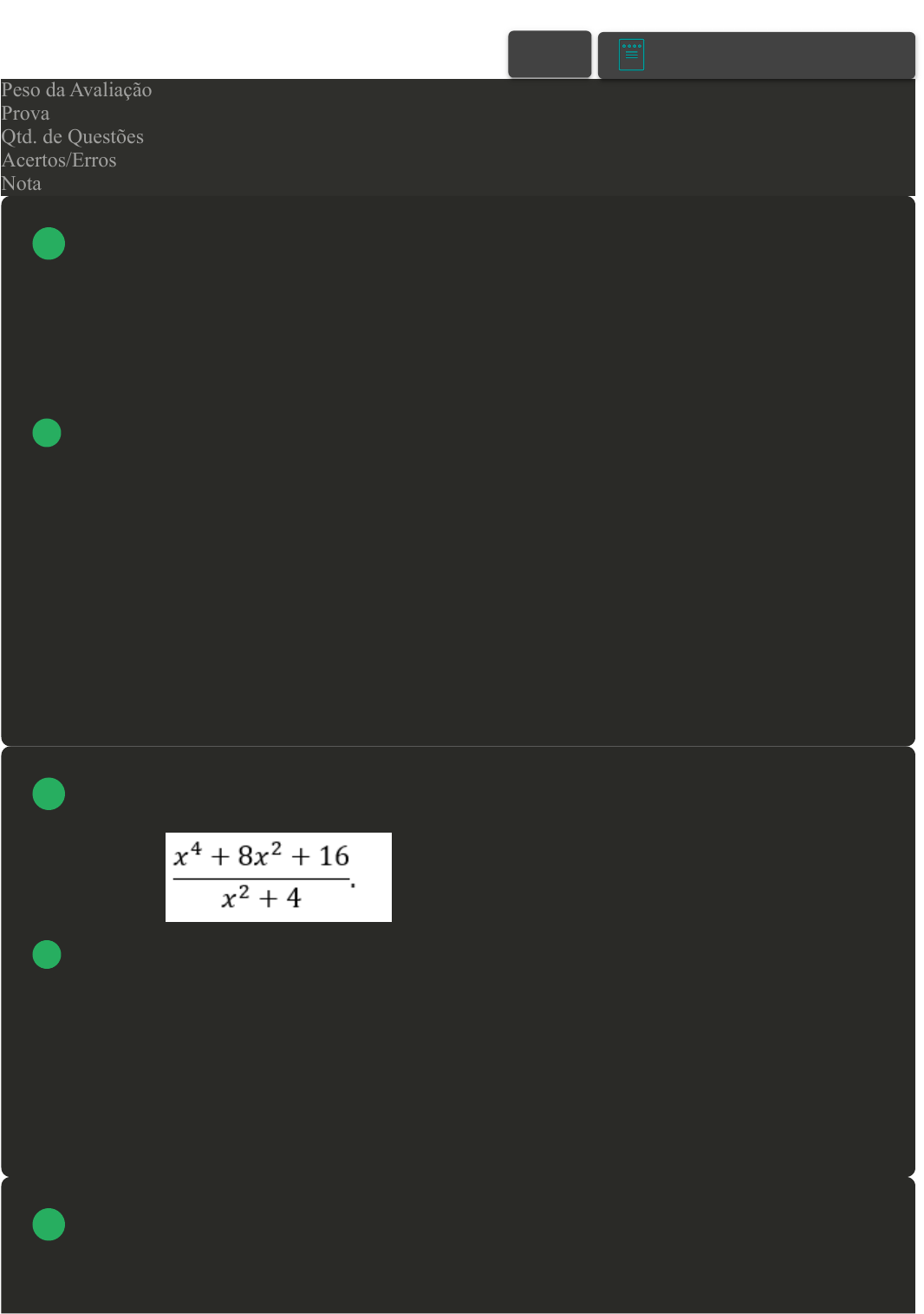 Prova Impressa GABARITO | Avaliação I - Individual (Cod.:955139) Peso da Avaliação 2,00 Prova 80908668 Qtd. de Questões 10 Acertos/Erros 10/0 Nota 10,00 Uma herança deve ser dividida entre sete pessoas em partes iguais. Se considerarmos apenas cinco pessoas para receber a herança, cada uma delas receberia R$ 6.000,00 a mais. Qual é o valor total dessa herança? A A herança será de R$ 105.000,00. B A herança será de R$ 200.000,00. C A herança será de R$ 50.000,00. D A herança será de R$ 150.000,00. Na teoria de Cálculo, estudamos limites e para calcularmos, muitas vezes, precisamos utilizar recursos como divisão de polinômios ou produtos notáveis. Utilizando estes recursos, simplifique a fração algébrica A x² + 4. B x² - 4. C 9x² + 4. D x² + 6. As operações de potenciação possuem algumas particularidades. A respeito delas, classifique V para as sentenças verdadeiras e F para as falsas: VOLTAR A+ Alterar modo de visualização 1 2 3 15/05/2024, 14:30 Avaliação I - Individual about:blank 1/5 ( ) Quando a base for positiva, não importa o expoente, o resultado será sempre positivo. ( ) Base negativa elevada a expoente ímpar tem resultado negativo. ( ) Base negativa elevada a expoente par tem resultado positivo. Assinale a alternativa que apresenta a sequência CORRETA: A F - V - F. B F - F - V. C V - F - V. D V - V - V. Como trabalhamos com um sistema decimal, agrupamos de 10 em 10, assim, cada agrupamento de 10 recebe um nome especial, ou seja, 10 unidades chamamos de dezenas, 10 dezenas chamamos de centenas. Sobre o exposto, assinale a alternativa INCORRETA: A 0,2 é escrito por extenso como dois décimos. B 0,03 é escrito por extenso como três décimos. C 0,002 é escrito por extenso como dois milésimos. D 0,03 é escrito por extenso como três centésimos. A fatoração é um recurso que utilizamos na simplificação de sentenças matemáticas, utilizada geralmente na simplificação de uma fração ou de uma equação. 4 5 15/05/2024, 14:30 Avaliação I - Individual about:blank 2/5 Fatorando o trinômio perfeito 9x² + 6x + 1, encontramos: A (3x + 1)². B (3x + 3x)². C (9x + 6x)². D (3x + 2)². Monômios são a forma mais simples de expressão algébrica, com eles podemos realizar várias operações matemáticas. Uma dessas operações é a multiplicação. Sabendo disso, determine o resultado de 2x . 3x: A 9x². B 6x². C 6x. D 9x. Podemos representar os números racionais na forma de fração ou na forma de número decimal (os números com vírgula). Com relação à fração 9/2, assinale a alternativa CORRETA: A Pode ser representada na forma decimal periódica igual a 4,555... B Pode ser representada na forma decimal finita igual a 4,5. 6 7 15/05/2024, 14:30 Avaliação I - Individual about:blank 3/5 C Pode ser representada na forma decimal periódica igual a 4,5. D Pode ser representada na forma decimal finita igual a 4,555... Um número expresso na forma decimal também pode ser reescrito na forma de número fracionário. Na hora de reescrevê-lo, podem ocorrer três situações, uma delas é o número decimal ser uma dízima periódica simples. Sobre a representação na forma de fração irredutível do número decimal 0,33..., analise as opções a seguir: Assinale a alternativa CORRETA: A Somente a opção IV está correta. B Somente a opção II está correta. C Somente a opção I está correta. D Somente a opção III está correta. Calcule a multiplicação a seguir: 8 9 15/05/2024, 14:30 Avaliação I - Individual about:blank 4/5 4 acz2 . 8 bdz3 Assinale a alternativa CORRETA: A 32 abcdz5. B 32 abcdz. C 32 dz5. D - 32 abcdz5. Considere as seguintes frações 9/12 + 3/45. Qual seria o valor do m.m.c para continuarmos a execução dela? A 172. B 145. C 122. D 180. 10 Imprimir 15/05/2024, 14:30 Avaliação I - Individual about:blank 5/5