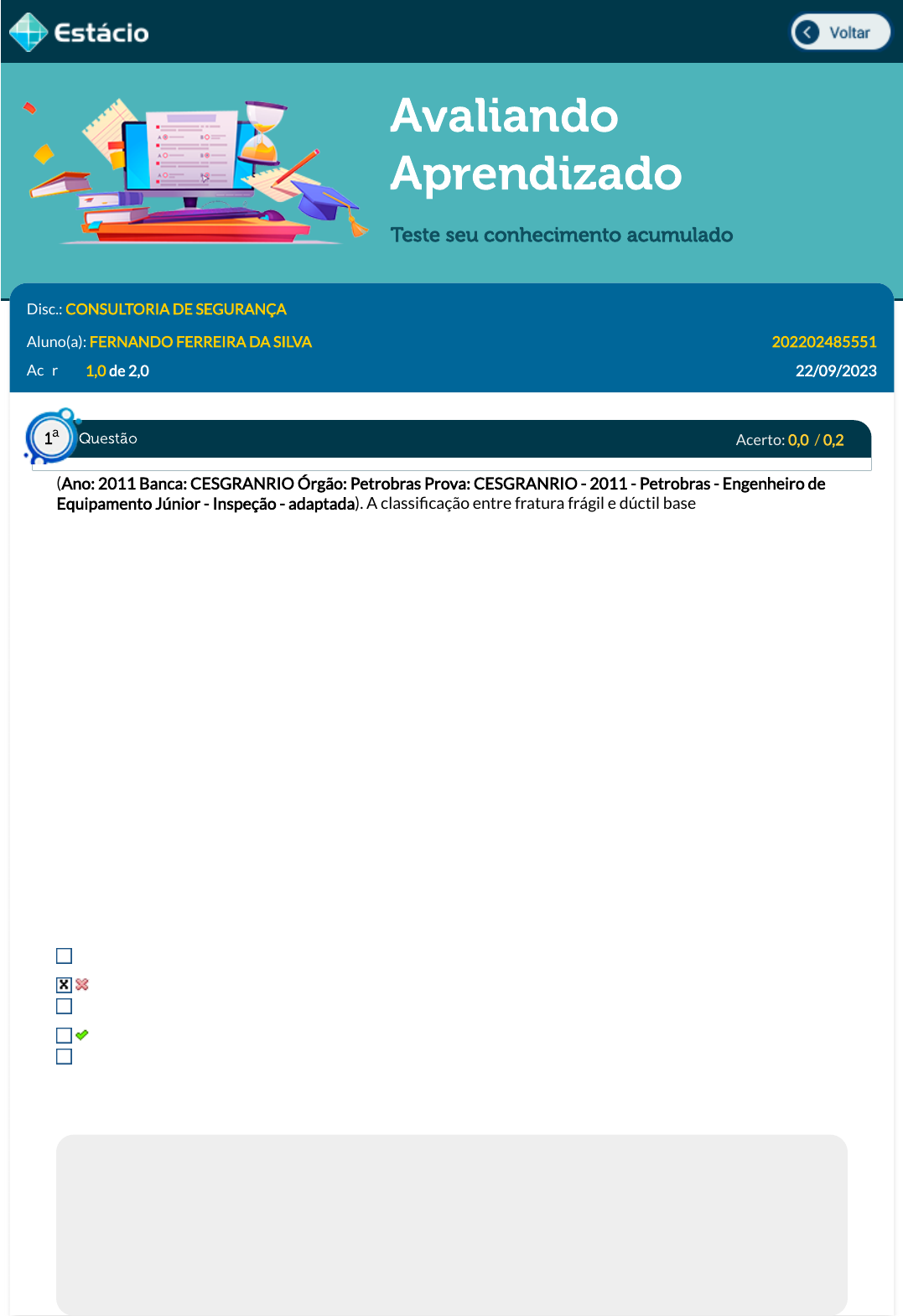 22/09/2023, 18:54 Estácio: Alunos https://simulado.estacio.br/alunos/ 1/6 Avaliando Aprendizado Teste seu conhecimento acumulado Disc.: CONSULTORIA DE SEGURANÇA Aluno(a): FERNANDO FERREIRA DA SILVA 202202485551 Acertos: 1,0 de 2,0 22/09/2023 Acerto: 0,0 / 0,2 (Ano: 2011 Banca: CESGRANRIO Órgão: Petrobras Prova: CESGRANRIO - 2011 - Petrobras - Engenheiro de Equipamento Júnior - Inspeção - adaptada). A classi�cação entre fratura frágil e dúctil baseia-se na habilidade do material em apresentar deformação plástica substancial, com grande absorção de energia antes da fratura. Sobre os aspectos macroscópicos e microscópicos dessas fraturas é são feitas as seguintes a�rmativas I - A fratura dúctil está relacionada à propagação de trincas e apresenta superfície sem grandes deformações plásticas aparentes, ao contrário da fratura frágil, que apresenta superfície característica em forma de taça e cone. II - A fractogra�a de fraturas dúcteis, analisadas por exame microscópico eletrônico de varredura (MEV), é possível a observação de micro cavidades esféricas remanescentes. III - A fratura frágil intergranular ocorre por decoesão dos grãos e apresenta fractogra�a típica com o aspecto tridimensional dos grãos. Está correto APENAS o que se a�rma em: I e II. III. II. II e III. I. Respondido em 22/09/2023 18:53:48 Explicação: A fratura dúctil de uma material ocorre com grande absorção de energia, acompanhada de deformação plástica (permanente) apreciável. O ensaio de tração de material dúctil apresenta o corpo de prova fraturado com o aspecto de um copo e de uma taça, de onde vem a denominação da fratura. A visualização da fratura dúctil, por meio de MEV, possibilita a percepção dos dimples (micro cavidades). De forma oposta, com baixas absorção de energia e deformação plástica, ocorre a fratura frágil. Dois fenômenos podem acontecer, o de clivagem que é a separação de planos cristalinos ou o de descolamento de grãos (decoesão). Nessa última, a fractogra�a apresenta o aspecto tridimensional dos grãos. Questão1 a https://simulado.estacio.br/alunos/inicio.asp javascript:voltar(); 22/09/2023, 18:54 Estácio: Alunos https://simulado.estacio.br/alunos/ 2/6 Acerto: 0,2 / 0,2 Pensando no conceito de competência, quais são os tipos de conhecimentos requeridos para o consultor de segurança corporativa ou privada? Conhecimentos em leis de segurança e conhecimentos de segurança de informação. Conhecimentos especí�cos de segurança do trabalho e conhecimentos básicos de segurança. Conhecimentos especí�cos em segurança clássica e conhecimentos básicos de administração. Conhecimentos especí�cos em gestão e técnicas de segurança e conhecimentos do negócio do cliente. Conhecimentos especí�cos em auditoria e conhecimentos básicos de segurança. Respondido em 22/09/2023 18:53:22 Explicação: A resposta correta é: Conhecimentos especí�cos em gestão e técnicas de segurança e conhecimentos do negócio do cliente. Acerto: 0,2 / 0,2 Considere um componente mecânico, na forma de uma barra cilíndrica de diâmetro d igual a 4,5 mm, com um furo passante de diâmetro a de 1 mm. O grá�co a seguir, apresenta o fator de concentração de tensões para barras circulares com furos passantes, submetidas à �exão. Supondo que o componente mecânico esteja sob �exão, o fator de concentração associado é igual a: 2,2. 2,0. 1,8. 2,4. 3,0. Respondido em 22/09/2023 18:52:15 Explicação: Os valores apresentados são a = 1mm e d = 4,5 mm. A partir da curva apresentada, é possível inferir que o fator de concentração de tensões K depende da razão entre a e d. Determinando = ~0,22 e, a partir do grá�co para esse a d 1 4,5 Questão2 a Questão3 a 22/09/2023, 18:54 Estácio: Alunos https://simulado.estacio.br/alunos/ 3/6 valor, o fator de concentração correspondente é de 2,0. Acerto: 0,2 / 0,2 As atividades de consultoria e de auditoria são ferramentas muito difundidas para dar suporte à gestão empresarial. Contudo, é importante sabermos diferenciar as funções de uma auditoria das funções de uma consultoria. Sobre essas atividades de suporte empresarial, é correto a�rmar que: As consultorias servem de base para avaliar vantagens comparativas nas empresas contratantes. Depois de identi�cadas essas questões, as auditorias entram na elaboração de planos de contingência com recomendações objetivas sobre o que pode ser implementado. As auditorias servem de base para avaliar vantagens comparativas nas empresas auditadas. Depois de identi�cadas essas questões, as consultorias entram na elaboração de planos de contingência com relatórios objetivos sobre o que era implementado. As auditorias servem de base para identi�car problemas e oportunidades de melhoria nas empresas auditadas. Depois de identi�cadas essas questões, as consultorias entram na elaboração de planos de ação com recomendações objetivas sobre o que pode ser mudado. As auditorias servem de base para identi�car vantagens comparativas nas empresas auditadas. Depois de identi�cadas essas questões, as consultorias entram, sempre de forma independente das auditorias, na elaboração de planos de ação com recomendações objetivas sobre o que pode ser mudado. As consultorias servem de base para identi�car problemas e oportunidades de melhoria nas empresas contratantes. Depois de identi�cadas essas questões, as auditorias entram na elaboração de planos de ação com recomendações objetivas sobre o que pode ser mudado. Respondido em 22/09/2023 18:52:09 Explicação: A resposta correta é: As auditorias servem de base para identi�car problemas e oportunidades de melhoria nas empresas auditadas. Depois de identi�cadas essas questões, as consultorias entram na elaboração de planos de ação com recomendações objetivas sobre o que pode ser mudado. Acerto: 0,0 / 0,2 As falhas por fratura